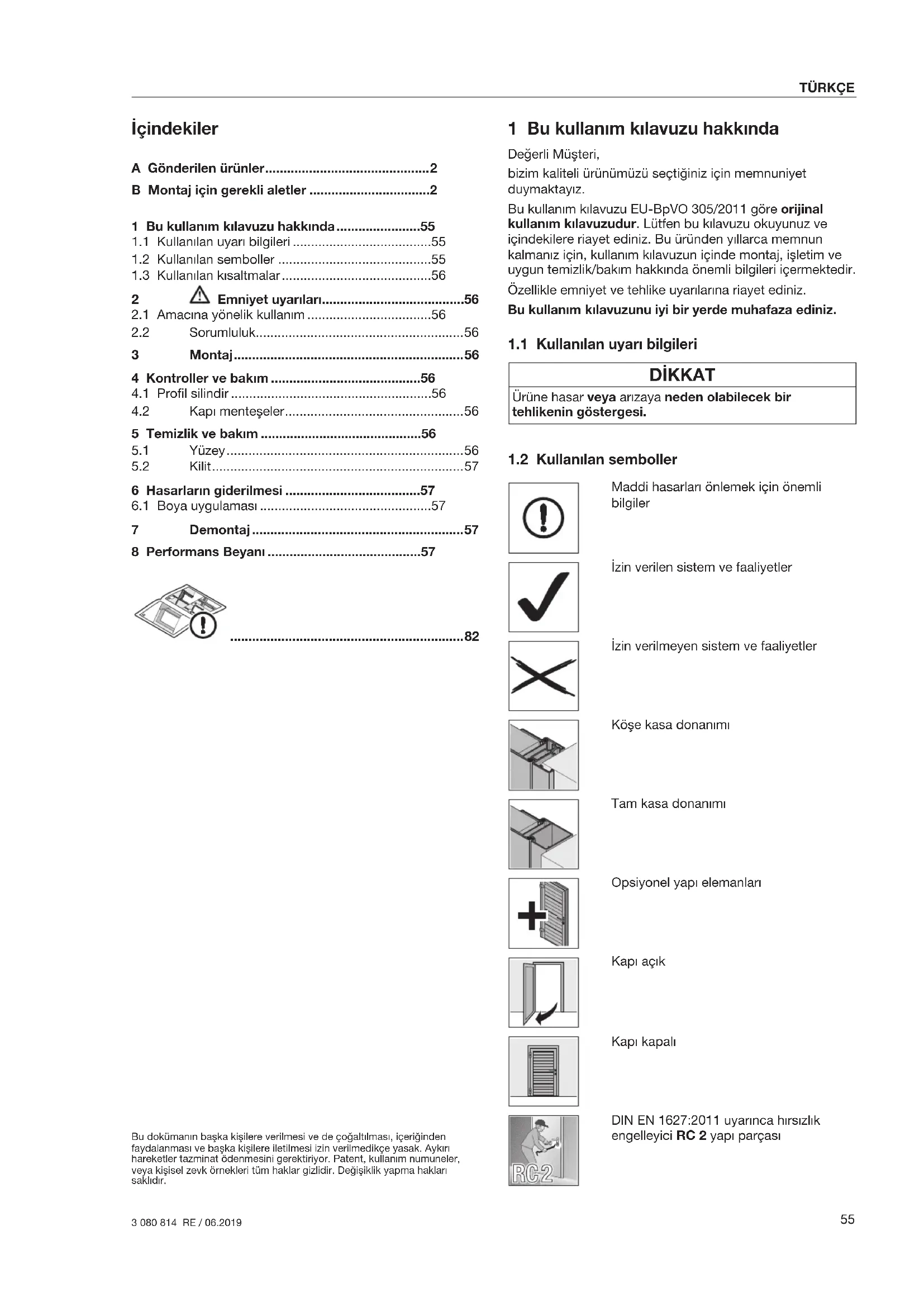 Maddi hasarları önlemek için önemli bilgiler İzin verilen sistem ve faaliyetler İzin verilmeyen sistem ve faaliyetler Köşe kasa donanımı Tam kasa donanımı Opsiyonel yapı elemanları Kapı açık Kapı kapalı DIN EN 1627:2011 uyarınca hırsızlık engelleyici RC2 yapı parçası 1 Bu kullanım kılavuzu hakkında .......................55