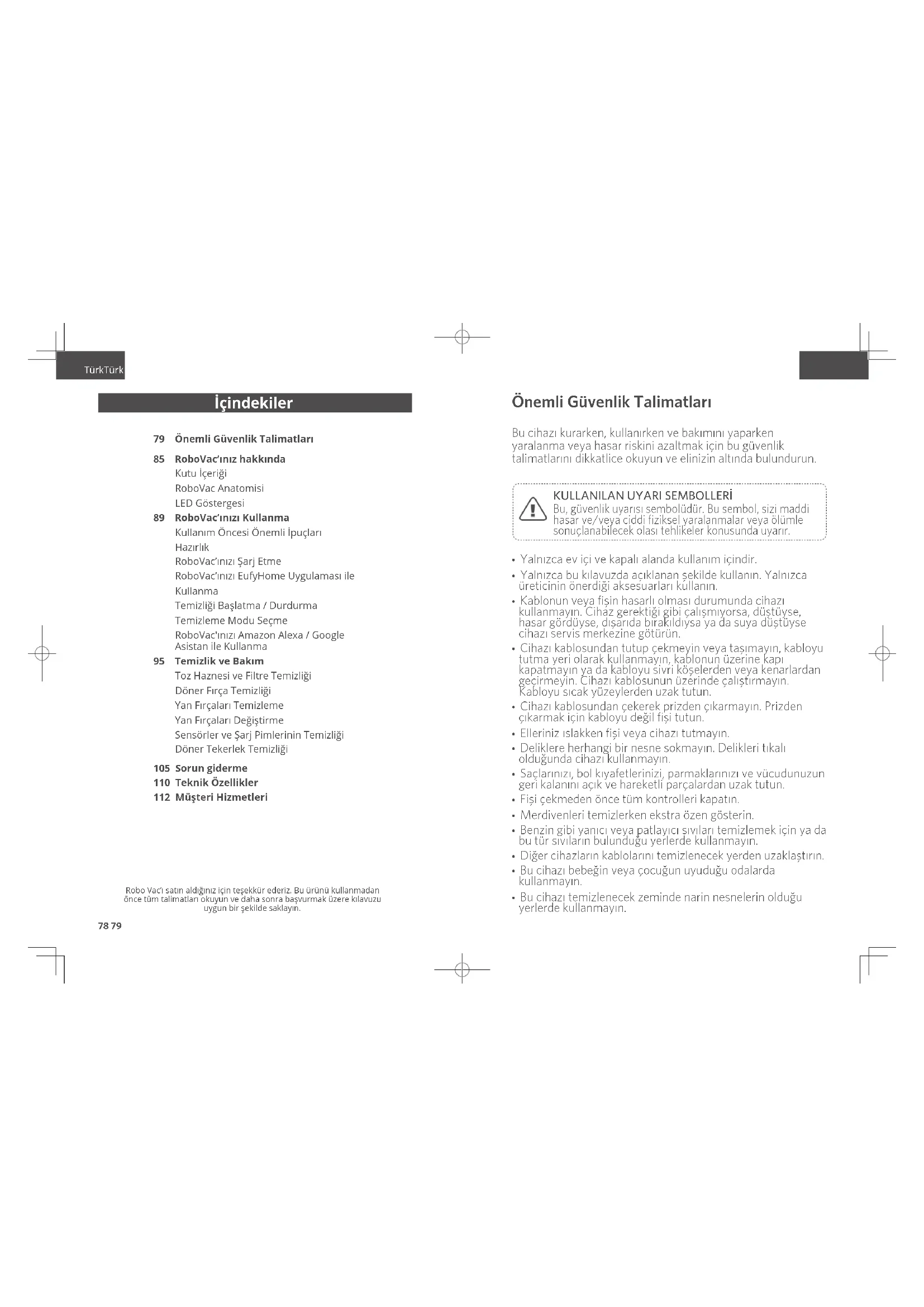 - Bu cihazın kendi kendine hareket ettiğini unutmayın. Bu cihazın çalıştığı alanda yürürken üzerine basmamak için dikkatli olun.82 83 Türk Türk