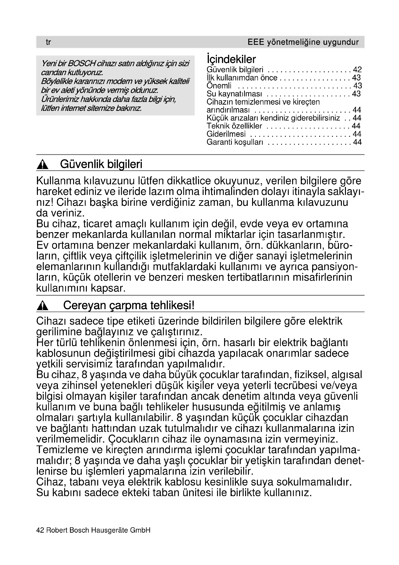 - Garanti koşulları , Güvenlik bilgileri Kullanma kılavuzunu lütfen dikkatlice okuyunuz, verilen bilgilere göre hareket ediniz ve ileride lazım olma ihtimalinden dolayı itinayla saklayı- nız! Cihazı başka birine verdiğiniz zaman, bu kullanma kılavuzunu da veriniz. Bu cihaz, ticaret amaçlı kullanım için değil, evde veya ev ortamına benzer mekanlarda kullanılan normal miktarlar için tasarlanmıştır. Ev ortamına benzer mekanlardaki kullanım, örn. dükkanların, büro- ların, çiftlik veya çiftçilik işletmelerinin ve diğer sanayi işletmelerinin elemanlarının kullandığı mutfaklardaki kullanımı ve ayrıca pansiyon- ların, küçük otellerin ve benzeri mesken tertibatlarının misafirlerinin kullanımını kapsar. , Cereyan çarpma tehlikesi! Cihazı sadece tipe etiketi üzerinde bildirilen bilgilere göre elektrik gerilimine bağlayınız ve çalıştırınız. Her türlü tehlikenin önlenmesi için, örn. hasarlı bir elektrik bağlantı kablosunun değiştirilmesi gibi cihazda yapılacak onarımlar sadece yetkili servisimiz tarafından yapılmalıdır. Bu cihaz, 8 yaşında ve daha büyük çocuklar tarafından, fiziksel, algısal veya zihinsel yetenekleri düşük kişiler veya yeterli tecrübesi ve/veya bilgisi olmayan kişiler tarafından ancak denetim altında veya güvenli kullanım ve buna bağlı tehlikeler hususunda eğitilmiş ve anlamış olmaları şartıyla kullanılabilir. 8 yaşından küçük çocuklar cihazdan ve bağlantı hattından uzak tutulmalıdır ve cihazı kullanmalarına izin verilmemelidir. Çocukların cihaz ile oynamasına izin vermeyiniz. Temizleme ve kireçten arındırma işlemi çocuklar tarafından yapılma- malıdır; 8 yaşında ve daha yaşlı çocuklar bir yetişkin tarafından denet- lenirse bu işlemleri yapmalarına izin verilebilir. Cihaz, tabanı veya elektrik kablosu kesinlikle suya sokulmamalıdır. Su kabını sadece ekteki taban ünitesi ile birlikte kullanınız. p. 44