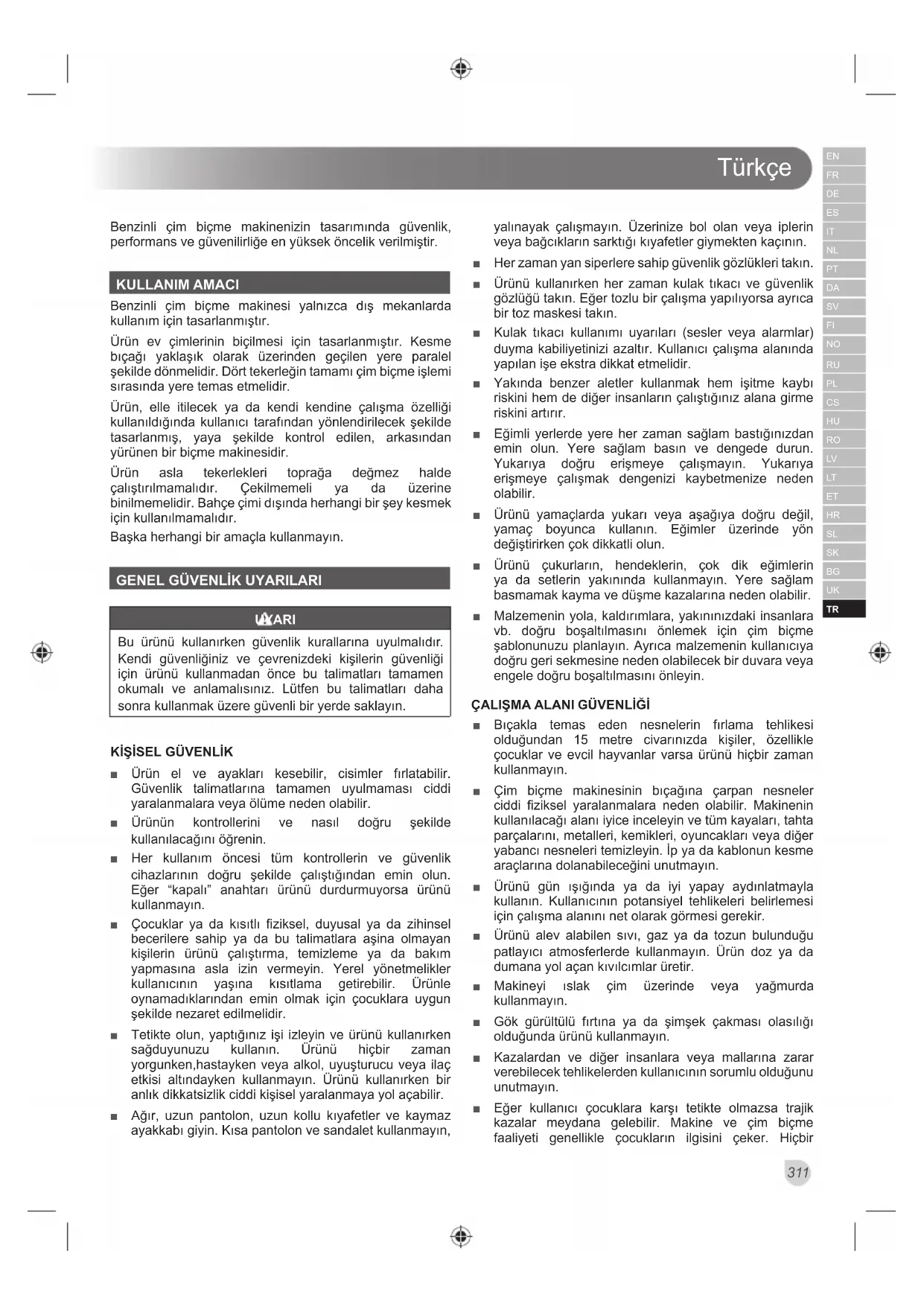 zaman çocukların onları en son gördüğünüz yerde kalacağını varsaymayın. ■ Çocukları biçilen alanın dışında ve kullanıcı dışında yetişkin birinin dikkatli gözetimi altında tutun, dikkatli olun ve alana çocuk girdiğinde ürünü kapatın. ■ Görüşünüzü engelleyebilecek kör köşeler, çalılar, ağaçlar ya da asılı çalılar dahil diğer nesnelere yaklaşırken ekstra dikkatli olun. ■ Çalışma alanını temiz tutun. Dağınık veya karanlık alanlar kazaya davetiye çıkartır. ÇİM BİÇME MAKİNESİ GÜVENLİK UYARILARI ■ Kullanmadan önce bıçakların, bıçak cıvatalarının ve kesici düzeneğinin aşınmadığından veya zarar görmediğinden emin olmak için her zaman görsel olarak inceleyin. ■ Eskimiş ya da hasar görmüş bıçak ve cıvataları balans bozulmaması için setler halinde değiştirin. ■ Kullanıcı mevcudiyet kontrolü bırakıldığında motoru durdurmazsa asla biçme makinesini kullanmayın. ■ Ürün tüm çim toplama sepeti veya kendinden kapanan boşaltma ağzı koruması yerinde değilken kullanılmamalıdır. ■ Ürün üzerindeki bıçak keskindir. Bıçağı takarken, değiştirirken, temizler ya da cıvataların sağlamlığını kontrol ederken ağır iş eldivenleri kullanın. ■ Zarar görmüş veya okunmaz durumdaki etiketleri değiştirmek için yetkili bir servis merkezine gönderin. ■ Ürünün güvenli çalışma durumunda olduğundan emin olmak için tüm somunların, cıvataların ve vidaların doğru sıkılıkta sık aralıklarla takıldığını kontrol edin. ■ Çim toplama sepetini aşınmaya, delinmeye veya şekil bozulmasına karşı sık sık kontrol edin. Bu, nesnelerin kullanıcıya doğru fırlatılmasına neden olabilir. ■ Ürünü kullanmadan önce aşınan veya zarar göre parçaları değiştirin. ■ Emniyetli kullanıcı bölgesi olan gidonun arkasındayken motoru dikkatlice çalıştırın. Aşağıdaki durumlarda ürünü asla çalıştırmayın: ● dört tekerleğin hepsi yerde değilse ● çim atma kanalı açıktadır ve çim kutusu ya da çim atma kanalı kapağı ile korunmamaktadır ● tüm kişilerin el ve ayakları kesme kutusundan uzakta değilse ■ Ürünü zorlamayın. Tasarlandığı hızda çalışmayı daha iyi ve daha güvenli bir şekilde yapacaktır. ■ Ürünü aşırı yüklemeyin. Uzun kalın çimleri biçmek motor hızının düğmesine veya gücün kesilmesine neden olabilir. Uzun ve kalın çim biçerken yüklemeyi azaltmak için ilk kesiminizde kesim yüksekliğini mümkün olduğunca fazla tutun. ■ Asfalt kaplı yüzeylere geldiğinizde bıçağı durdurun. ■ Mutlaka gerekmedikçe, ürünü geriye doğru çekmeyin. Makineyi bir duvardan veya engelden geriye doğru çekip uzaklaştırmanız gerekirse makinenin ayağınızın üzerine devrilmesini veya üzerinden geçmesini önlemek için önce aşağı ve geriye doğru bakın. ■ Çimden başka yüzeylerden geçerken, ütünün taşınmak için eğilmesi gerekiyorsa veya ürün biçilecek bir alana götürülüyor ya da oradan getiriliyorsa, bıçağın durması için motoru kapatın. ■ Ürün üzerinde hatalı koruma ya da kalkanlar varken veya deflektör ve/veya çim kutuları gibi emniyet araçları takılı değilken asla ürünü kullanmayın. ■ Motoru çalıştırırken veya motor çalışırken ürünü eğmeyin. Bu bıçağı açığa çıkartır ve nesnelerin fırlama ihtimalini artırır. ■ Motoru talimatlara göre dikkatli bir şekilde çalıştırın ve ellerinizi ve ayaklarınızı kesme alanından uzak tutun. El ve ayakları döner parçaların altına koymayın. Boşaltma ağzını daima temiz tutun. Tahliye ağzının önünde dururken ürünü çalıştırmayın. ■ Ürünü çalışır konumdayken asla kaldırmayın ya da taşımayın. ■ Kullanılmadığında, ürünü iyi havalandırılan kuru bir mekanda ya da çocukların erişemeyeceği kilitli bir yerde muhafaza edin. ■ Üreticinin aksesuarların doğru kullanımı ve montajı ile ilgili talimatlarına uyun. Sadece üretici tarafından onaylanmış aksesuarları kullanın. ■ Motoru tehlikeli karbonmonoksit dumanının birikebileceği kapalı bir alanda çalıştırmayın. ■ Motor regülatör ayarlarını değiştirmeyin veya motoru aşırı hızlı çalıştırmayın. ■ Ürünü durdurun ve bıçağın bütünüyle durmasını bekleyin. Ürünün soğumasını bekleyin, ardından buji kablosunu sökün: ● ürünü tek başına her bıraktığınızda (biçilen çimleri boşaltırken de) ● tıkanıklığı temizlemeden ya da atma kanalını açmadan önce ● ürünü kontrol etme, temizleme ve ürün üzerinde çalışmadan önce ● çim kutusunu çıkarmadan ya da çim boşaltma kanal kapağını açmadan önce ● yakıt doldurmadan önce ■ Ürün anormal şekilde titreşim yapmaya başlarsa derhal aşağıdakileri kontrol edin: ● özellikle bıçaklardaki hasarları incelerken ● tüm hasarlı parçaları değiştirin veya onarın ● Herhangi bir gevşek parçaya karşı kontrol edin ve sıkın ■ Eğer ürün yabancı bir nesneye çarparsa şu adımları izleyin: ● Motoru durdurun ve buji kablosunu ayırın. ● Biçme makinesi ve çim yakalayıcıda hasar olup olmadığını iyice inceleyin. ● Ürünü yeniden çalıştırmadan ve kullanmaya devam etmeden önce hasarları onarın. ■ Deliklerden, oluklardan, tümseklerden, kayalardan,Türkçe
