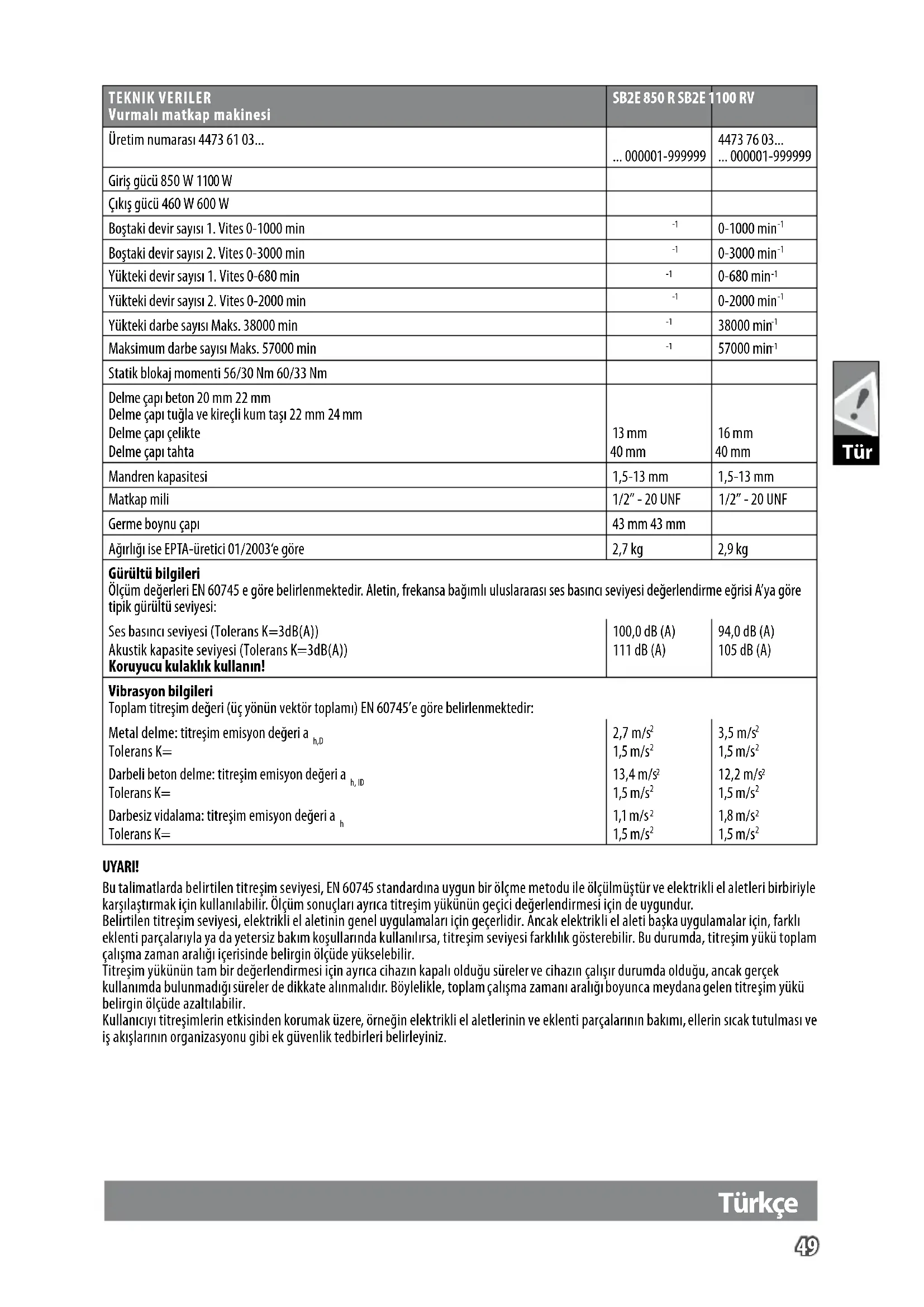 UYARI! Bu talimatlarda belirtilen titreşim seviyesi, EN 60745 standardına uygun bir ölçme metodu ile ölçülmüştür ve elektrikli el aletleri birbiriyle karşılaştırmak için kullanılabilir. Ölçüm sonuçları ayrıca titreşim yükünün geçici değerlendirmesi için de uygundur. Belirtilen titreşim seviyesi, elektrikli el aletinin genel uygulamaları için geçerlidir. Ancak elektrikli el aleti başka uygulamalar için, farklı eklenti parçalarıyla ya da yetersiz bakım koşullarında kullanılırsa, titreşim seviyesi farklılık gösterebilir. Bu durumda, titreşim yükü toplam çalışma zaman aralığı içerisinde belirgin ölçüde yükselebilir. Titreşim yükünün tam bir değerlendirmesi için ayrıca cihazın kapalı olduğu süreler ve cihazın çalışır durumda olduğu, ancak gerçek kullanımda bulunmadığı süreler de dikkate alınmalıdır. Böylelikle, toplam çalışma zamanı aralığı boyunca meydana gelen titreşim yükü belirgin ölçüde azaltılabilir. Kullanıcıyı titreşimlerin etkisinden korumak üzere, örneğin elektrikli el aletlerinin ve eklenti parçalarının bakımı, ellerin sıcak tutulması ve iş akışlarının organizasyonu gibi ek güvenlik tedbirleri belirleyiniz. Türkçe50 English Tür UYARI! Güvenlikle ilgili bütün açıklamaları. Açıklanan uyarılara ve talimat hükümlerine uyulmadığı takirde elektrik çarpmalarına, yangınlara ve/veya ağır yaralanmalara neden olunabilir. Bütün uyarıları ve talimat hükümleini ileride kullanmak üzere saklayın.