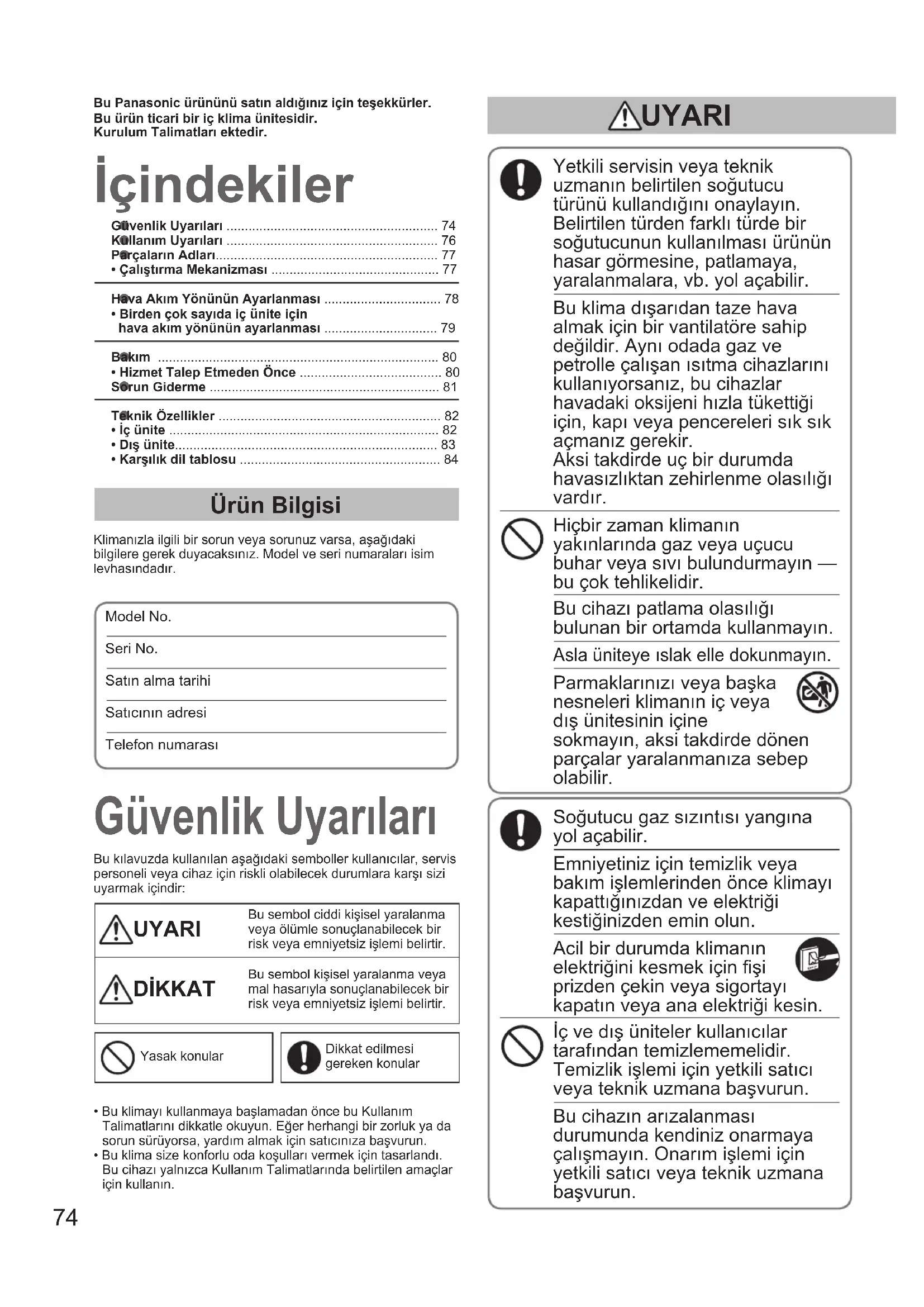 - Това е за плавно функциониране. Проверете, преди да се консултирате или да поискате техническо обслужване. OI_00_038226_EU.indb 73 2014/7/10 9:08:5374 zGüvenlikUyarıları .......................................................... 74 zKullanımUyarıları .......................................................... 76 zParçalarınAdları............................................................. 77•ÇalıştırmaMekanizması .............................................. 77 zHavaAkımYönününAyarlanması ................................ 78•Birdençoksayıdaiçüniteiçin havaakımyönününayarlanması ............................... 79 zBakım ............................................................................. 80•Hizmet Talep Etmeden Önce ....................................... 80 zSorun Giderme ............................................................... 81 zTeknik Özellikler ............................................................. 82•İçünite .......................................................................... 82•Dışünite........................................................................ 83•Karşılıkdiltablosu ....................................................... 84 İçindekiler GüvenlikUyarıları Ürün Bilgisi Klimanızla ilgili bir sorun veya sorunuz varsa, aşağıdaki bilgilere gerek duyacaksınız. Model ve seri numaraları isim levhasındadır.Model No. Seri No. Satın alma tarihiSatıcının adresiTelefon numarası Yetkili servisin veya teknik uzmanın belirtilen soğutucu türünü kullandığını onaylayın. Belirtilen türden farklı türde bir soğutucunun kullanılması ürünün hasar görmesine, patlamaya, yaralanmalara, vb. yol açabilir. Bu klima dışarıdan taze hava almak için bir vantilatöre sahip değildir. Aynı odada gaz ve petrolle çalışan ısıtma cihazlarını kullanıyorsanız, bu cihazlar havadaki oksijeni hızla tükettiği için, kapı veya pencereleri sık sık açmanız gerekir. Aksi takdirde uç bir durumda havasızlıktan zehirlenme olasılığı vardır. Hiçbir zaman klimanın yakınlarında gaz veya uçucu buhar veya sıvı bulundurmayın — bu çok tehlikelidir. Bu cihazı patlama olasılığı bulunan bir ortamda kullanmayın. Asla üniteye ıslak elle dokunmayın. Parmaklarınızı veya başka nesneleri klimanın iç veya dış ünitesinin içine sokmayın, aksi takdirde dönen parçalar yaralanmanıza sebep olabilir. Soğutucu gaz sızıntısı yangına yol açabilir. Emniyetiniz için temizlik veya bakım işlemlerinden önce klimayı kapattığınızdan ve elektriği kestiğinizden emin olun. Acil bir durumda klimanın elektriğini kesmek için şi prizden çekin veya sigortayı kapatın veya ana elektriği kesin. İç ve dış üniteler kullanıcılar tarafından temizlememelidir. Temizlik işlemi için yetkili satıcı veya teknik uzmana başvurun. Bu cihazın arızalanması durumunda kendiniz onarmaya çalışmayın. Onarım işlemi için yetkili satıcı veya teknik uzmana başvurun. Bu kılavuzda kullanılan aşağıdaki semboller kullanıcılar, servis personeli veya cihaz için riskli olabilecek durumlara karşı sizi uyarmak içindir: UYARI Bu sembol ciddi kişisel yaralanma veya ölümle sonuçlanabilecek bir risk veya emniyetsiz işlemi belirtir. DİKKAT Bu sembol kişisel yaralanma veya mal hasarıyla sonuçlanabilecek bir risk veya emniyetsiz işlemi belirtir.Yasak konularDikkat edilmesi gereken konularBuPanasonicürününüsatınaldığınıziçinteşekkürler.Bu ürün ticari bir iç klima ünitesidir.KurulumTalimatlarıektedir.• Bu klimayı kullanmaya başlamadan önce bu Kullanım Talimatlarını dikkatle okuyun. Eğer herhangi bir zorluk ya da sorun sürüyorsa, yardım almak için satıcınıza başvurun.• Bu klima size konforlu oda koşulları vermek için tasarlandı. Bu cihazı yalnızca Kullanım Talimatlarında belirtilen amaçlar için kullanın. UYARI OI_00_038226_EU.indb 74 2014/7/10 9:08:5475 Türkçe Bu cihaz mağazalarda, aydınlatma endüstrisinde, çiftliklerde veya başka ticari amaçla kullanım için uzman veya eğitimli kişiler tarafından kullanım için tasarlanmıştır. Bu cihaz 8 yaşında ve daha büyük çocuklar tarafından, ziksel, duyusal veya zihinsel yetenekleri kısıtlı veya deneyimsiz ve bilgi sahibi olmayan kişiler tarafından, cihazın emniyetli bir biçimde kullanımı için gerekli talimatların verilmiş olması ve riskleri anlamaları şartıyla, kullanılabilir. Yangın alarmı ve hava çıkışını ünitenin en az 1,5 m uzağında konumlandırın. Odada bebekler ve yatağa bağımlı hastalar varsa odayı çok fazla ısıtmayın ve soğutmayın. Klimayı ana güç anahtarından kapatıp açmayın. AÇIK/KAPALI çalıştırma düğmesini kullanın. Dış ünitenin çıkışından içeri herhangi bir nesne sokmayın. İçindeki fan yüksek hızda döndüğü için bu tehlikeli bir harekettir. Dış ünitenin hava girişine veya keskin alüminyum pervanelerine dokunmayın. Yaralanabilirsiniz. FAN KASASINA herhangi bir nesne sokmayın. Yaralanabilirsiniz ve cihaz hazar görebilir. Her üniteyle, yalnızca bu üniteyi besleyen bir priz kullanın ve her hat üzerinde bir elektrik bağlantısı kesici, Toprak Sızıntısı Devre Kesici (ELCB) veya aşırı akım koruması için Hane Akım Sigortası (RCD) kullanılmalıdır. Her üniteyle, yalnızca bu üniteyi besleyen bir priz kullanın ve sabit kablolama üzerinde tüm kutuplarda kablolama kurallarıyla uyumlu kontak kesici tüm araçlar kullanılmalıdır. Yalıtım arızasından kaynaklanabilecek olası tehlikeleri önlemek için ünite topraklanmalıdır. Aşırı ısınma veya yangın tehlikesini önlemek için modiyeli kablo, ek yer, olan kablo veya teknik özellikleri belirsiz kablo kullanmayın. Herhangi bir anormallik/arıza oluşursa ürünü kullanmayı bırakın ve 