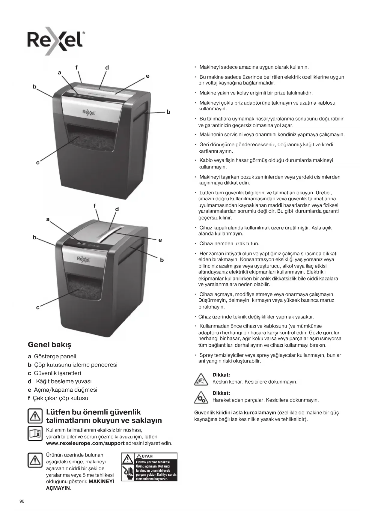 - Sprey temizleyiciler veya sprey yağlayıcılar kullanmayın, bunlar ani yangın riski oluşturabilir. Lütfen bu önemli güvenlik talimatlarını okuyun ve saklayın Kullanım talimatlarının eksiksiz bir nüshası, yararlı bilgiler ve sorun çözme kılavuzu için, lütfen www.rexeleurope.com/support adresini ziyaret edin. Ürünün üzerinde bulunan aşağıdaki simge, makineyi açarsanız ciddi bir şekilde yaralanma veya ölme tehlikesi olduğunu gösterir. MAKİNEYİ AÇMAYIN. Elektrik çarpma tehlikesi. Ürünü açmayın. Kullanıcı tarafından onarılabilecek parçası yoktur. Kaliye servis elemanlarına başvurun. UYARI