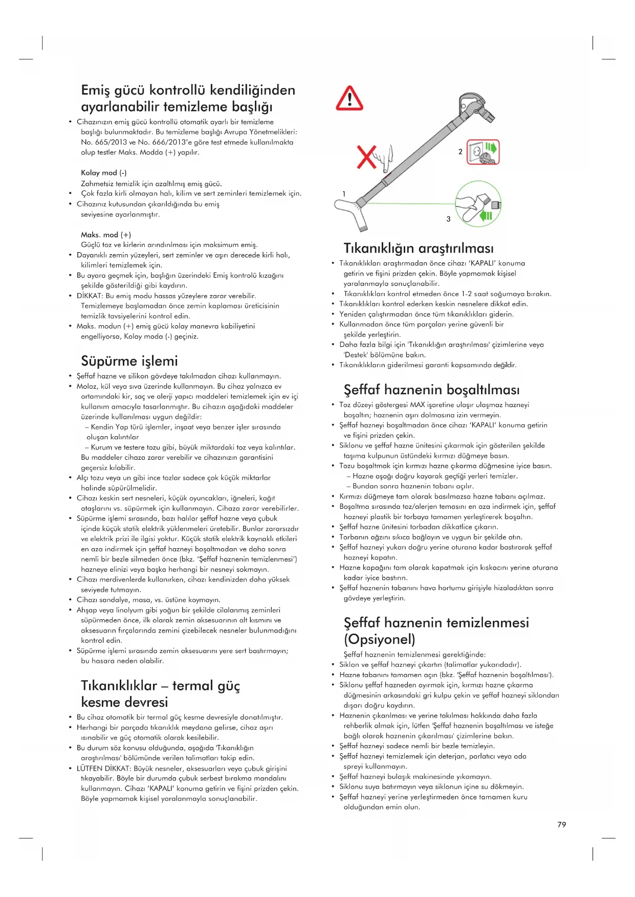 - Tıkanıklıkların giderilmesi garanti kapsamında değildir. Şeffaf haznenin boşaltılması