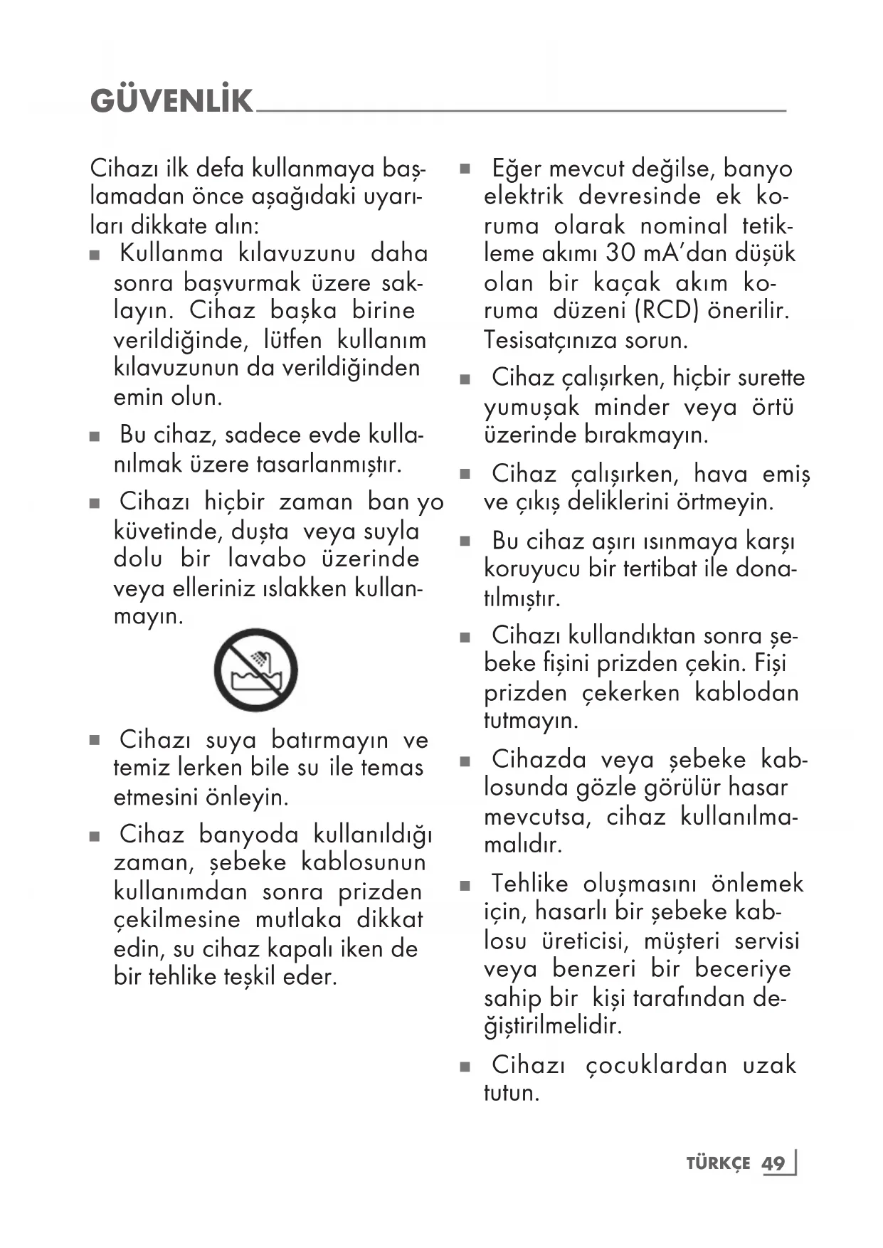 Cihaz banyoda kullanıldığı zaman, şebeke kablosunun kullanımdan sonra prizden çekilmesine mutlaka dikkat edin, su cihaz kapalı iken de bir tehlike teşkil eder.50