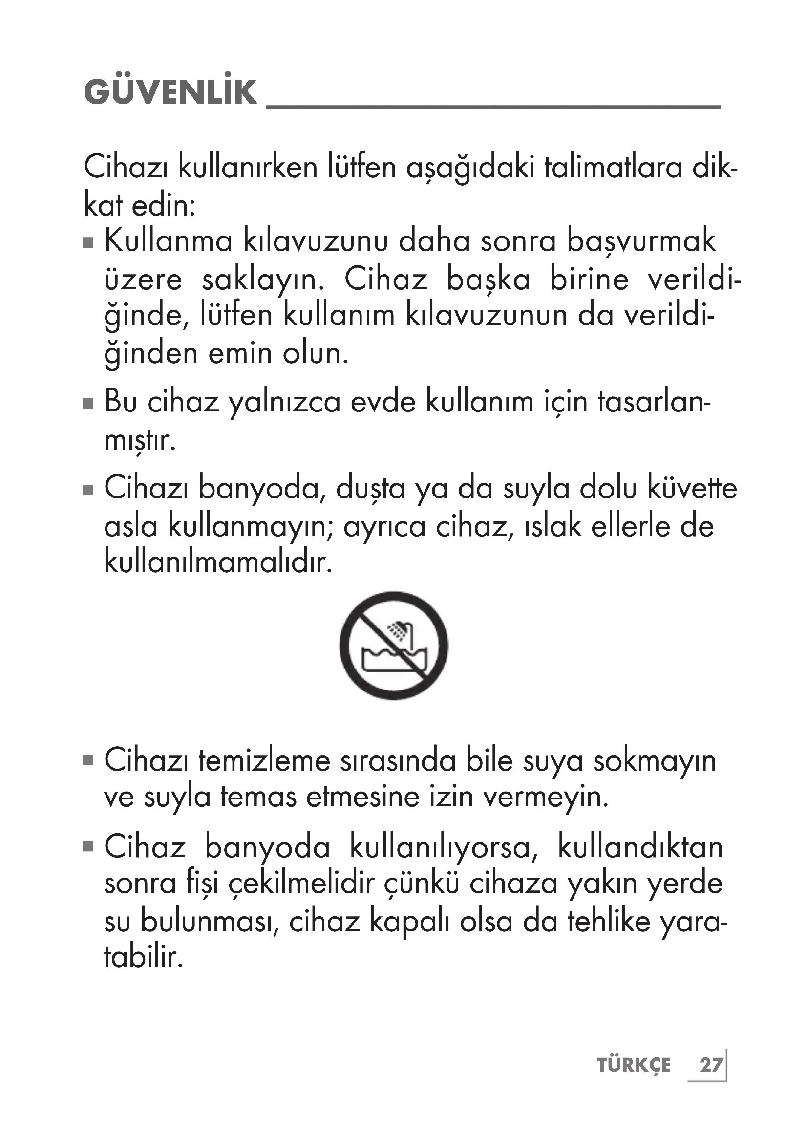 Cihazı banyoda, duşta ya da suyla dolu küvette asla kullanmayın; ayrıca cihaz, ıslak ellerle de kullanılmamalıdır.