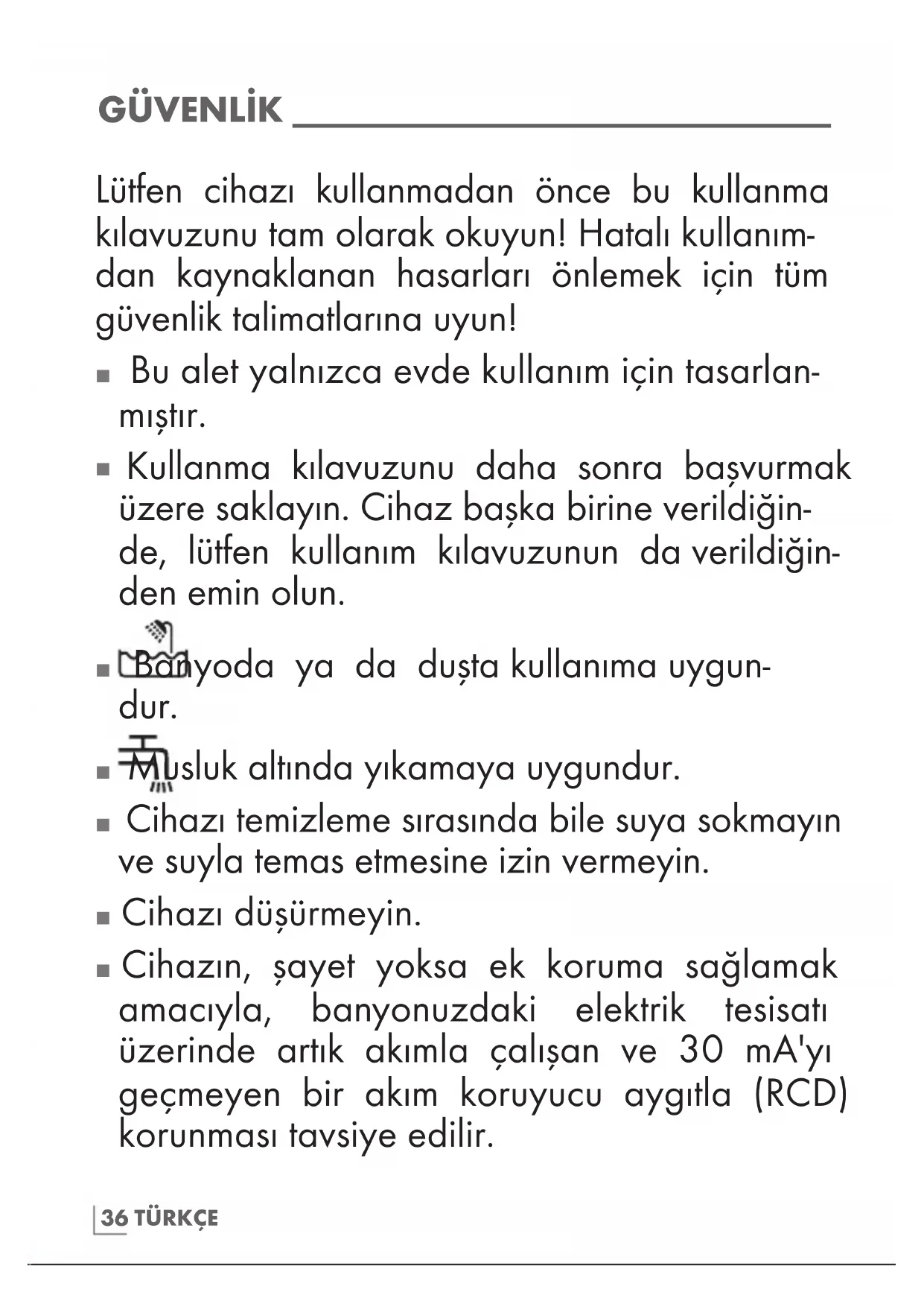 Cihazın, şayet yoksa ek koruma sağlamak amacıyla, banyonuzdaki elektrik tesisatı üzerinde artık akımla çalışan ve 30 mA'yı geçmeyen bir akım koruyucu aygıtla (RCD) korunması tavsiye edilir.37TÜRKÇE