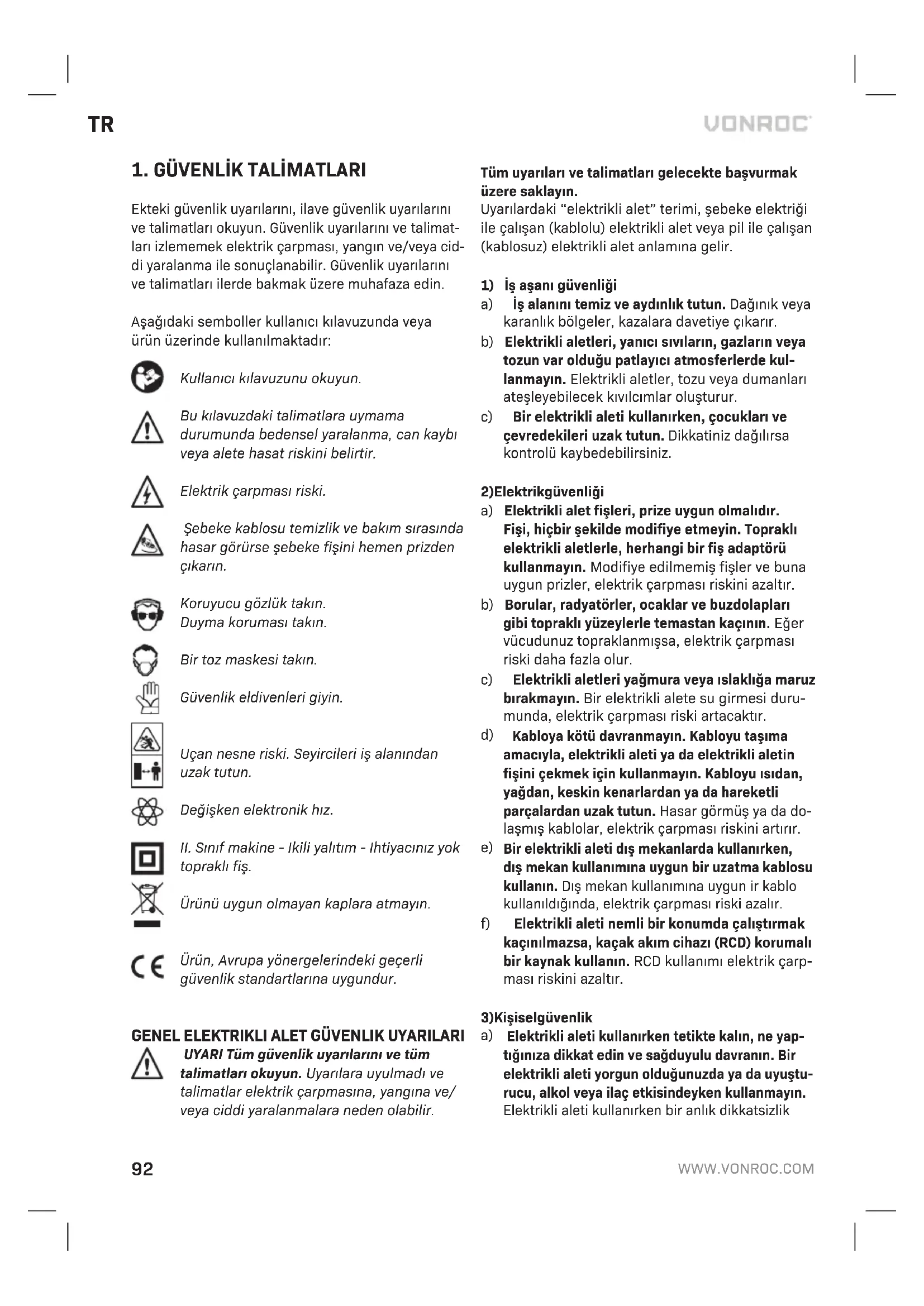 Temizlik ve bakımdan önce her zaman makineyi kapatın ve şebeke fişini şebekeden çıkarın. Makine kaplamalarını yumuşak bir bezle, tercihen her kullanımdan sonra düzenli olarak temizleyin. Havalan- dırma deliklerinin toz ve kirden arınmış olduğundan emin olun. Çok inatçı kirleri sabun köpüğüyle ıslatıl- mış yumuşak bir bezle çıkarın. Benzin, alkol, amonyak vs. gibi çözücü maddeleri kullanmayın. Bunlar gibi kimyasallar sentetik bileşenlere zarar verecektir. ÇEVRE Arızalı ve/veya atılmış elektrikli veya elektronik ekipmanların uygun geri dönüşüm konumlarında toplanması gerekir. Yalnızca AT ülkeleri için Elektrikli aletleri evsel atık olarak atmayın. Atık Elektrikli ve Elektronik Donanım için Avrupa İlkeleri 2012/19/EU’ya ve bunun yerel hukuk çerçevesinde uygulamasına göre, artık kullanılamaz olan elekt- rikli aletler ayrı olarak toplanmalı ve çevre dostu bir yolla imha edilmelidir. GARANTİ VONROC ürünleri yüksek kalite standartları doğrul- tusunda geliştirilmiştir ve ilk satın alımdan itibaren kanunen belirlenen süre boyunca materyal ve işçilik açısından kusursuz olacağı garanti edilmektedir. Bu süre zarfında, kusurlu materyal ve/veya işçilikten dolayı üründe herhangi bir arıza meydana gelmesi durumunda, doğrudan VONROC iletişim kurun. Takip eden durumlar bu garanti kapsamı dışındadır: