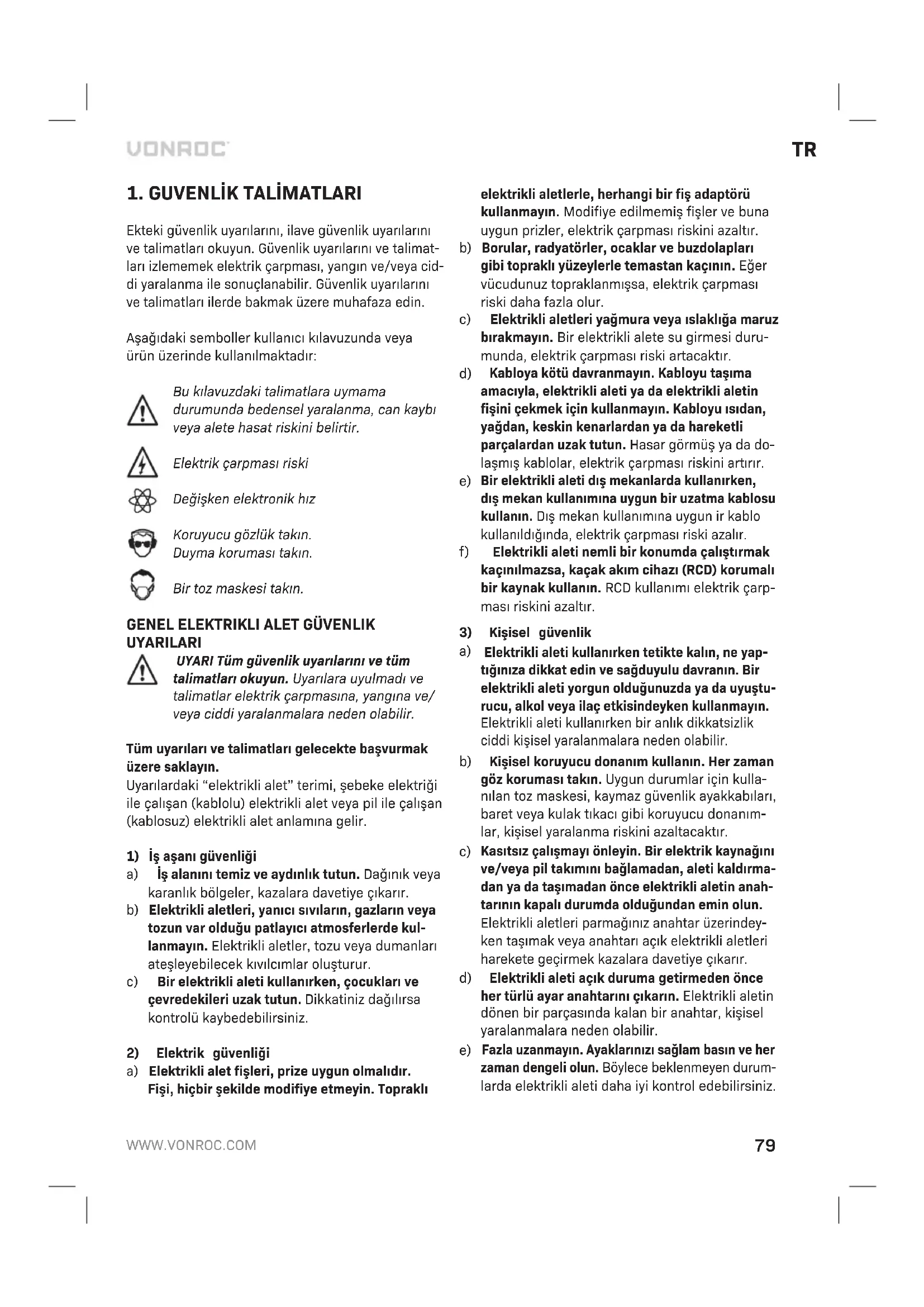Motorda bakım çalışması yaparken makinenin enerji bağlantısı olmadığından emin olun. Makne kaplamalarını yumuşak br bezle, terchen her kullanımdan sonra düzenl olarak temzleyn. Havalandırma delklernn toz ve krden arınmış olduğundan emn olun. Çok natçı krler sabun köpüğüyle ıslatılmış yumuşak br bezle çıkarın. Benzn, alkol, amonyak vs. gb çözücü maddeler kullanmayın. Bunlar gb kmyasallar sentetk ble- şenlere zarar verecektr. ÇEVRE Arızalı ve/veya atılmış elektrikli veya elektronik ekipmanların uygun geri dönüşüm konumlarında toplanması gerekir. Yalnızca AT ülkeleri için Elektrkl aletler evsel atık olarak atmayın. Atık Elektrkl ve Elektronk Donanım çn Avrupa İlkeler 2012/19/EU’ya ve bunun yerel hukuk çerçevesnde uygulamasına göre, artık kullanılamaz olan elekt- rkl aletler ayrı olarak toplanmalı ve çevre dostu br yolla mha edlmeldr. GARANTİ VONROC ürünler yüksek kalte standartları doğrul- tusunda gelştrlmştr ve lk satın alımdan tbaren kanunen belrlenen süre boyunca materyal ve şçlk açısından kusursuz olacağı garant edlmektedr. Bu süre zarfında, kusurlu materyal ve/veya şçlkten dolayı üründe herhang br arıza meydana gelmes durumunda, doğrudan VONROC letşm kurun. Takp eden durumlar bu garant kapsamı dışındadır: