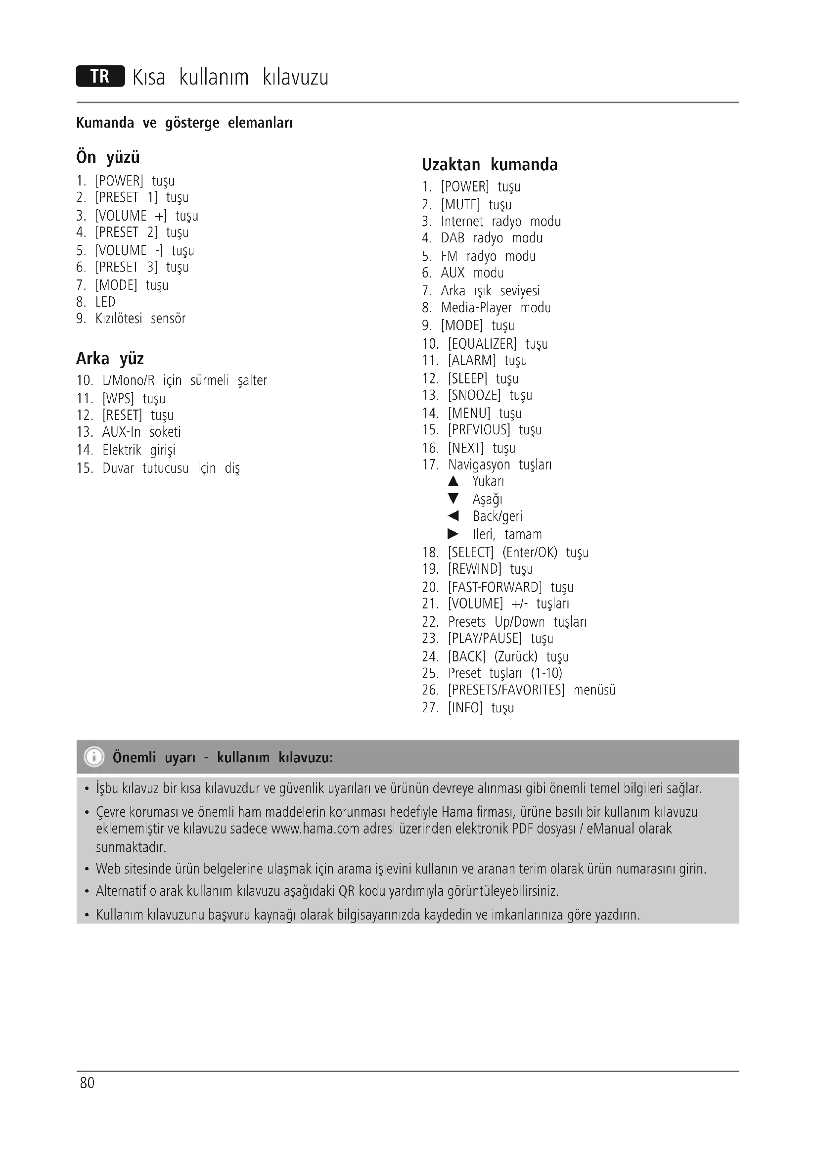 Cihazın kılavuzunu ücretsiz bulun IR80MBT HAMA PDF formatında.