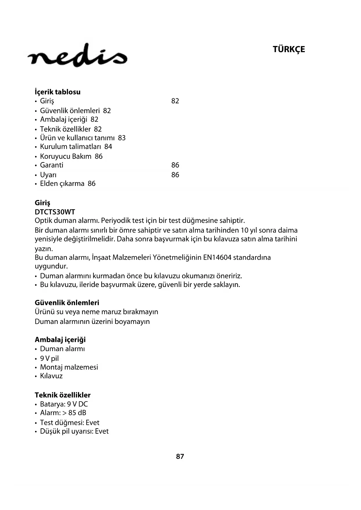 DTCTS30WT - Duman detektörü NEDIS - Ücretsiz kullanım kılavuzu