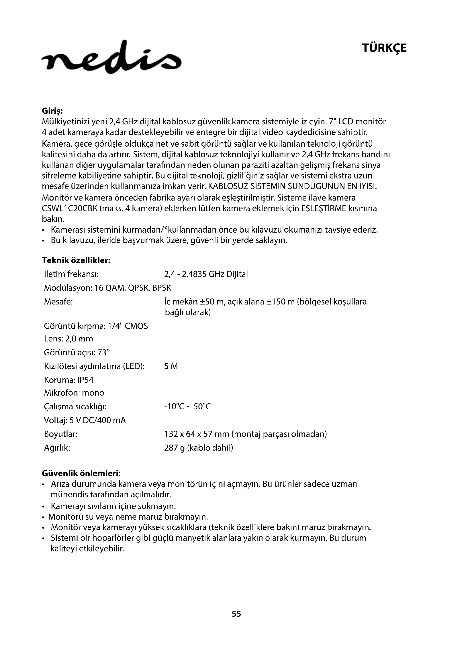 - Bu kılavuzu, ileride başvurmak üzere, güvenli bir yerde saklayın. Teknik özellikler: İletim frekansı: 2,4 - 2,4835 GHz Dijital Modülasyon: 16 QAM, QPSK, BPSK Mesafe: İç mekân ±50 m, açık alana ±150 m (bölgesel koşullara bağlı olarak) Görüntü kırpma: 1/4" CMOS Lens: 2,0 mm Görüntü açısı: 73° Kızılötesi aydınlatma (LED): 5 M Koruma: IP54 Mikrofon: mono Çalışma sıcaklığı: -10°C ~ 50°C Voltaj: 5 V DC/400 mA Boyutlar: 132 x 64 x 57 mm (montaj parçası olmadan) Ağırlık: 287 g (kablo dahil) Güvenlik önlemleri: