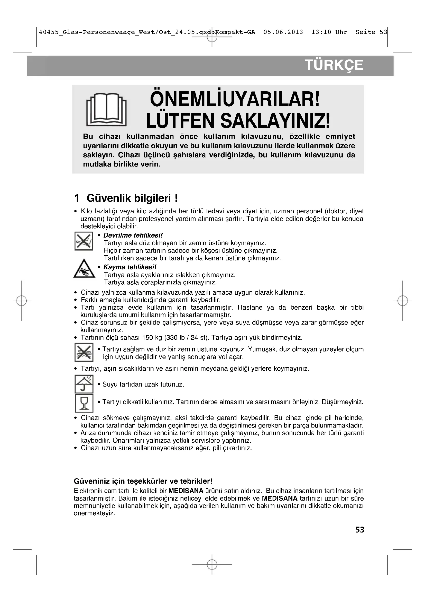 - Arıza durumunda cihazı kendiniz tamir etmeye çalışmayınız, bunun sonucunda her türlü garanti kaybedilir. Onarımları yalnızca yetkili servislere yaptırınız.• Cihazı uzun süre kullanmayacaksanız eğer, pili çıkartınız. Güveniniz için teşekkürler ve tebrikler! Elektronik cam tartı ile kaliteli bir MEDISANA ürünü satın aldınız. Bu cihaz insanların tartılması için tasarlanmıştır. Bakım ile istediğiniz neticeyi elde edebilmek ve MEDISANA tartınızı uzun bir süre memnuniyetle kullanabilmek için, aşağıda verilen kullanım ve bakım uyarılarını dikkatle okumanızıönermekteyiz. 40455_Glas-Personenwaage_West/Ost_24.05.qxd:Kompakt-GA 05.06.2013 13:10 Uhr Seite 5354
