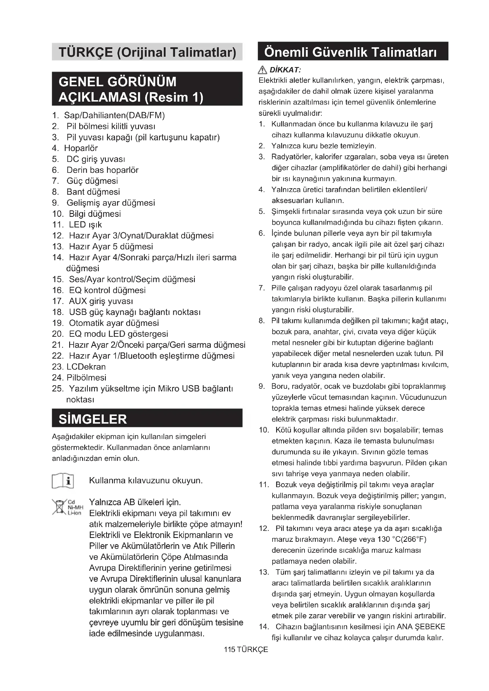 çalışan bir radyo, ancak ilgili pile ait özel şarj cihazı ile şarj edilmelidir. Herhangi bir pil türü için uygun olan bir şarj cihazı, başka bir pille kullanıldığında yangın riski oluşturabilir.