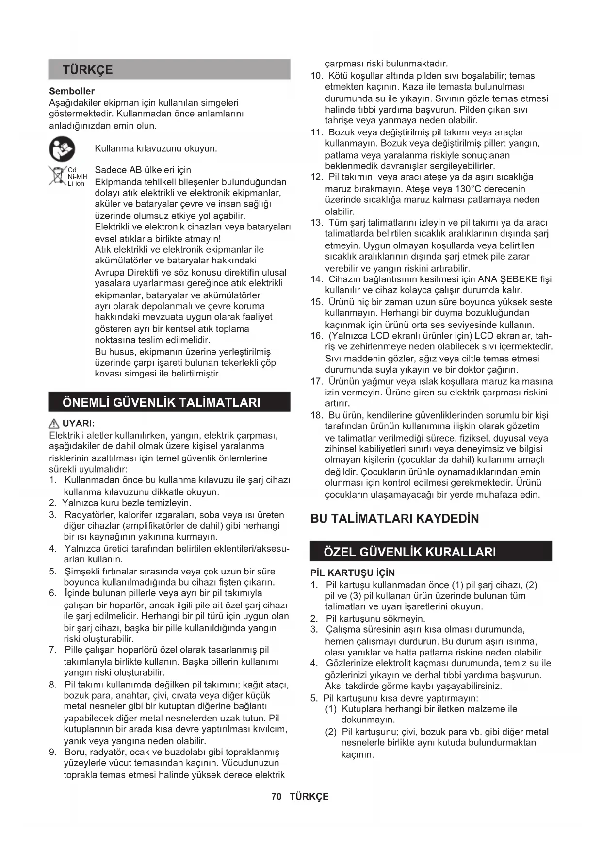 takımlarıyla birlikte kullanın. Başka pillerin kullanımı yangın riski oluşturabilir.