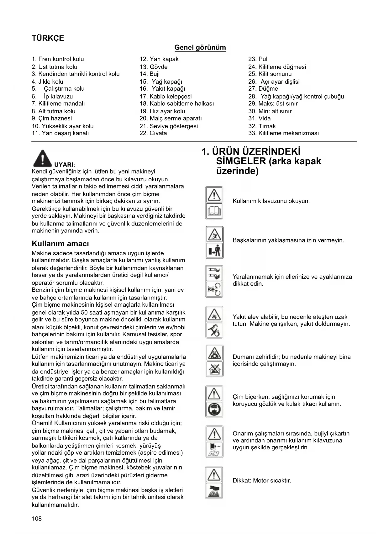 Kullanım kılavuzunu okuyun. Başkalarının yaklaşmasına izin vermeyin. Yaralanmamak için ellerinize ve ayaklarınıza dikkat edin. Yakıt alev alabilir, bu nedenle ateşten uzak tutun. Makine çalışırken, yakıt doldurmayın. Dumanı zehirlidir; bu nedenle makineyi bina içerisinde çalıştırmayın. Çim biçerken, sağlığınızı korumak için koruyucu gözlük ve kulak tıkacı kullanın. Onarım çalışmaları sırasında, bujiyi çıkartın ve ardından onarımı kullanım kılavuzuna uygun şekilde gerçekleştirin. Dikkat: Motor sıcaktır.109