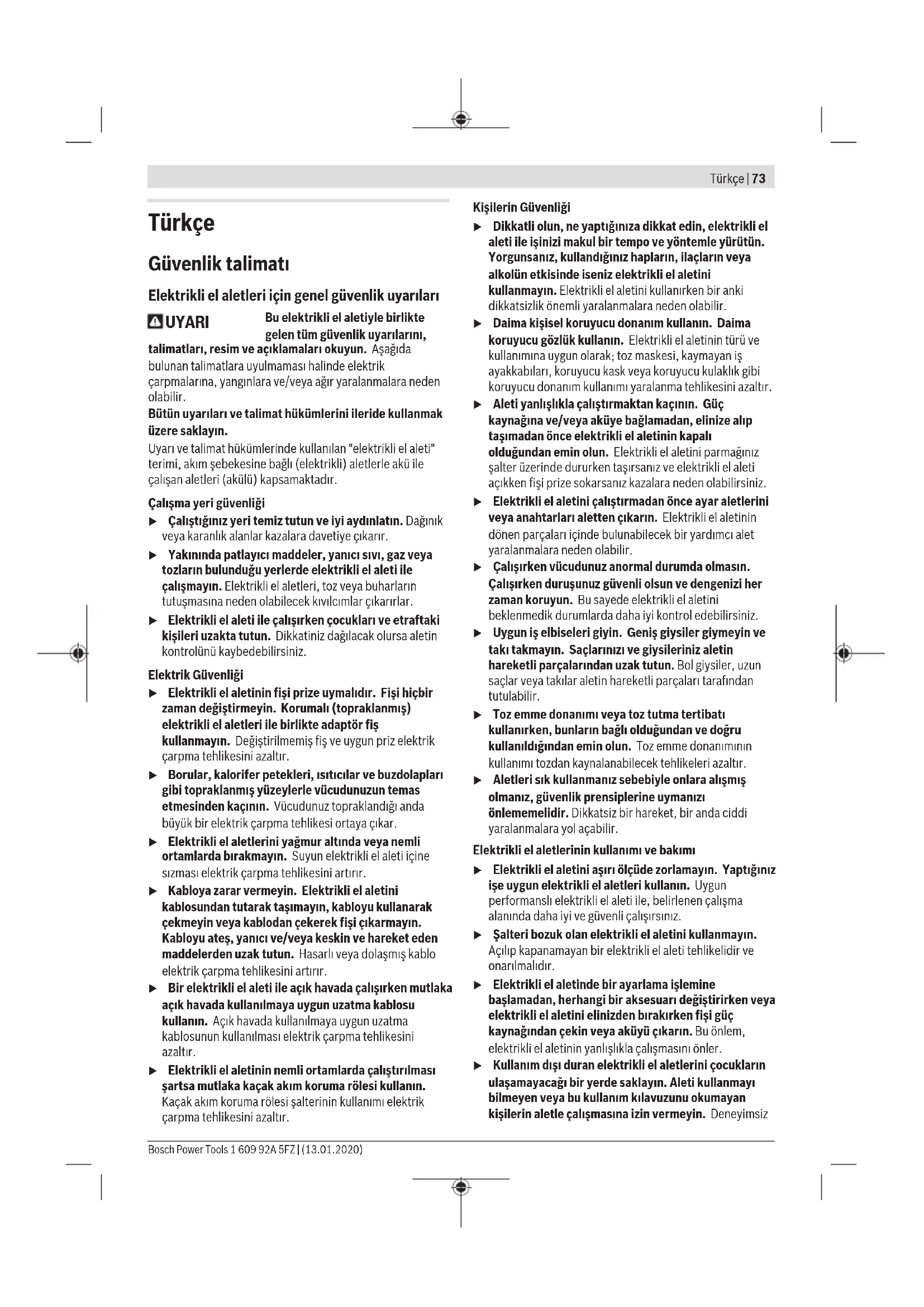 Τα ηλεκτρικά εργαλεία, τα εξαρτήματα και οι συσκευασίες πρέπει να ανακυκλώνονται με τρόπο φιλικό προς το περιβάλλον. Μην ρίχνετε τα ηλεκτρικά εργαλεία στα απορρίμματα του σπιτιού σας! Μόνο για χώρες τηςΕΕ: Σύμφωνα με την Ευρωπαϊκή Οδηγία 2012/19/ΕΕ σχετικά με τις παλιές ηλεκτρικές και ηλεκτρονικές συσκευές και τη μεταφορά της οδηγίας αυτής σε εθνικό δίκαιο δεν είναι πλέον υποχρεωτικό, τα άχρηστα ηλεκτρικά εργαλεία να συλλέγονται ξεχωριστά για να ανακυκλωθούν με τρόπο φιλικό προς το περιβάλλον. 1 609 92A 5FZ | (13.01.2020) Bosch Power ToolsTürkçe | 73 Türkçe Güvenlik talimatı Elektrikli el aletleri için genel güvenlik uyarıları UYARI Bu elektrikli el aletiyle birlikte gelen tüm güvenlik uyarılarını, talimatları, resim ve açıklamaları okuyun. Aşağıda bulunan talimatlara uyulmaması halinde elektrik çarpmalarına, yangınlara ve/veya ağır yaralanmalara neden olabilir. Bütün uyarıları ve talimat hükümlerini ileride kullanmak üzere saklayın. Uyarı ve talimat hükümlerinde kullanılan "elektrikli el aleti" terimi, akım şebekesine bağlı (elektrikli) aletlerle akü ile çalışan aletleri (akülü) kapsamaktadır. Çalışma yeri güvenliği u Çalıştığınız yeri temiz tutun ve iyi aydınlatın. Dağınık veya karanlık alanlar kazalara davetiye çıkarır. u Yakınında patlayıcı maddeler, yanıcı sıvı, gaz veya tozların bulunduğu yerlerde elektrikli el aleti ile çalışmayın. Elektrikli el aletleri, toz veya buharların tutuşmasına neden olabilecek kıvılcımlar çıkarırlar. u Elektrikli el aleti ile çalışırken çocukları ve etraftaki kişileri uzakta tutun. Dikkatiniz dağılacak olursa aletin kontrolünü kaybedebilirsiniz. Elektrik Güvenliği u Elektrikli el aletinin fişi prize uymalıdır. Fişi hiçbir zaman değiştirmeyin. Korumalı (topraklanmış) elektrikli el aletleri ile birlikte adaptör fiş kullanmayın. Değiştirilmemiş fiş ve uygun priz elektrik çarpma tehlikesini azaltır. u Borular, kalorifer petekleri, ısıtıcılar ve buzdolapları gibi topraklanmış yüzeylerle vücudunuzun temas etmesinden kaçının. Vücudunuz topraklandığı anda büyük bir elektrik çarpma tehlikesi ortaya çıkar. u Elektrikli el aletlerini yağmur altında veya nemli ortamlarda bırakmayın. Suyun elektrikli el aleti içine sızması elektrik çarpma tehlikesini artırır. u Kabloya zarar vermeyin. Elektrikli el aletini kablosundan tutarak taşımayın, kabloyu kullanarak çekmeyin veya kablodan çekerek fişi çıkarmayın. Kabloyu ateş, yanıcı ve/veya keskin ve hareket eden maddelerden uzak tutun. Hasarlı veya dolaşmış kablo elektrik çarpma tehlikesini artırır. u Bir elektrikli el aleti ile açık havada çalışırken mutlaka açık havada kullanılmaya uygun uzatma kablosu kullanın. Açık havada kullanılmaya uygun uzatma kablosunun kullanılması elektrik çarpma tehlikesini azaltır. u Elektrikli el aletinin nemli ortamlarda çalıştırılması şartsa mutlaka kaçak akım koruma rölesi kullanın. Kaçak akım koruma rölesi şalterinin kullanımı elektrik çarpma tehlikesini azaltır. Kişilerin Güvenliği u Dikkatli olun, ne yaptığınıza dikkat edin, elektrikli el aleti ile işinizi makul bir tempo ve yöntemle yürütün. Yorgunsanız, kullandığınız hapların, ilaçların veya alkolün etkisinde iseniz elektrikli el aletini kullanmayın. Elektrikli el aletini kullanırken bir anki dikkatsizlik önemli yaralanmalara neden olabilir. u Daima kişisel koruyucu donanım kullanın. Daima koruyucu gözlük kullanın. Elektrikli el aletinin türü ve kullanımına uygun olarak; toz maskesi, kaymayan iş ayakkabıları, koruyucu kask veya koruyucu kulaklık gibi koruyucu donanım kullanımı yaralanma tehlikesini azaltır. u Aleti yanlışlıkla çalıştırmaktan kaçının. Güç kaynağına ve/veya aküye bağlamadan, elinize alıp taşımadan önce elektrikli el aletinin kapalı olduğundan emin olun. Elektrikli el aletini parmağınız şalter üzerinde dururken taşırsanız ve elektrikli el aleti açıkken fişi prize sokarsanız kazalara neden olabilirsiniz. u Elektrikli el aletini çalıştırmadan önce ayar aletlerini veya anahtarları aletten çıkarın. Elektrikli el aletinin dönen parçaları içinde bulunabilecek bir yardımcı alet yaralanmalara neden olabilir. u Çalışırken vücudunuz anormal durumda olmasın. Çalışırken duruşunuz güvenli olsun ve dengenizi her zaman koruyun. Bu sayede elektrikli el aletini beklenmedik durumlarda daha iyi kontrol edebilirsiniz. u Uygun iş elbiseleri giyin. Geniş giysiler giymeyin ve takı takmayın. Saçlarınızı ve giysileriniz aletin hareketli parçalarından uzak tutun. Bol giysiler, uzun saçlar veya takılar aletin hareketli parçaları tarafından tutulabilir. u Toz emme donanımı veya toz tutma tertibatı kullanırken, bunların bağlı olduğundan ve doğru kullanıldığından emin olun. Toz emme donanımının kullanımı tozdan kaynalanabilecek tehlikeleri azaltır. u Aletleri sık kullanmanız sebebiyle onlara alışmış olmanız, güvenlik prensiplerine uymanızı önlememelidir. Dikkatsiz bir hareket, bir anda ciddi yaralanmalara yol açabilir. Elektrikli el aletlerinin kullanımı ve bakımı u Elektrikli el aletini aşırı ölçüde zorlamayın. Yaptığınız işe uygun elektrikli el aletleri kullanın. Uygun performanslı elektrikli el aleti ile, belirlenen çalışma alanında daha iyi ve güvenli çalışırsınız. u Şalteri bozuk olan elektrikli el aletini kullanmayın. Açılıp kapanamayan bir elektrikli el a