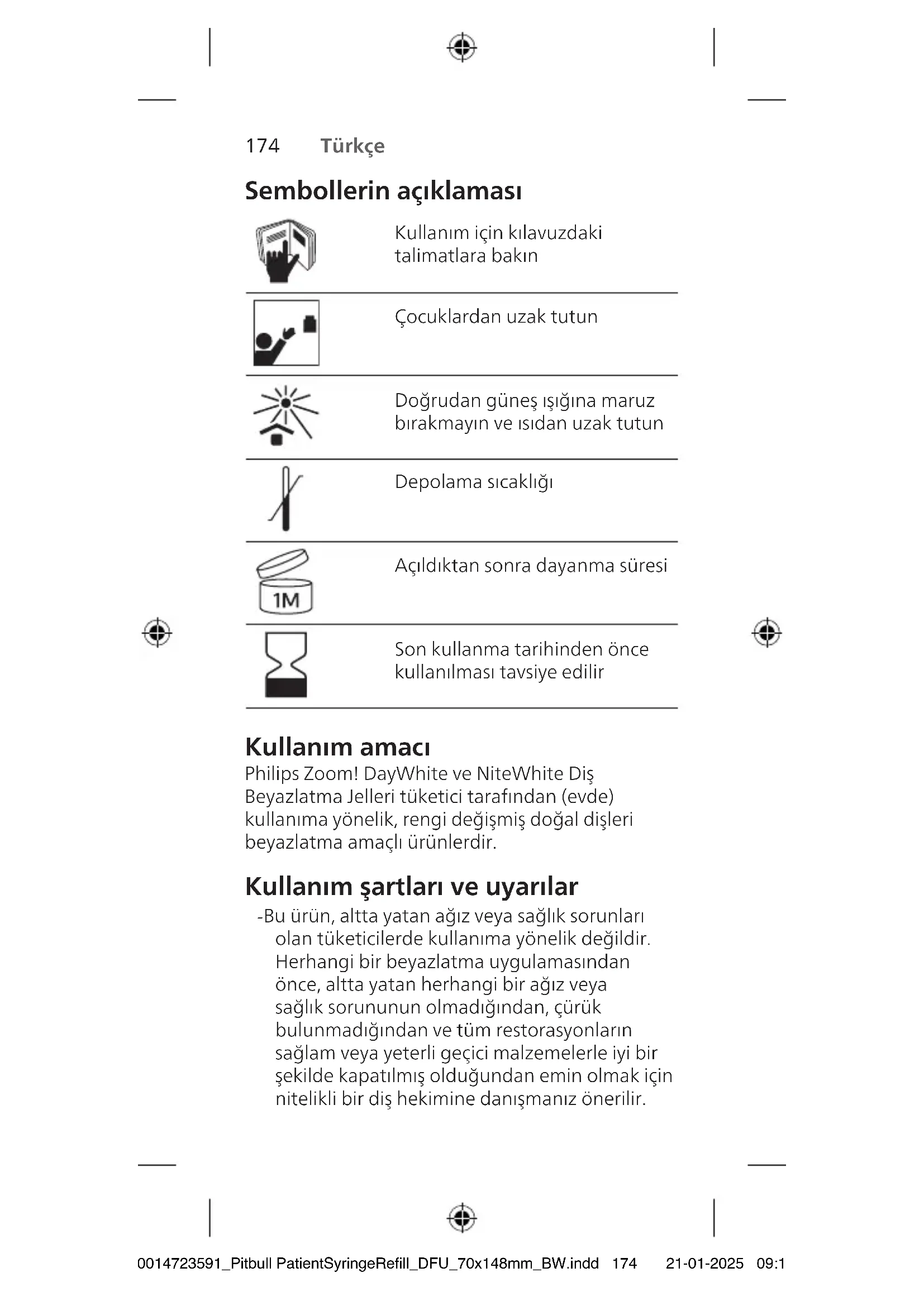 - Garanti ÖNEMLİ BU ÜRÜNÜ KULLANMADAN ÖNCE TÜM TALİMATLARI OKUYUN. 300014723591_Pitbull PatientSyringeRefill_DFU_70x148mm_BW.indd 173300014723591_Pitbull PatientSyringeRefill_DFU_70x148mm_BW.indd 173 21-01-2025 09:1121-01-2025 09:11Türkçe 175 174 Türkçe Sembollerin açıklaması Kullanım için kılavuzdaki talimatlara bakın Çocuklardan uzak tutun Doğrudan güneş ışığına maruz bırakmayın ve ısıdan uzak tutun Depolama sıcaklığı Açıldıktan sonra dayanma süresi Son kullanma tarihinden önce kullanılması tavsiye edilir Kullanım amacı Philips Zoom! DayWhite ve NiteWhite Diş Beyazlatma Jelleri tüketici tarafından (evde) kullanıma yönelik, rengi değişmiş doğal dişleri beyazlatma amaçlı ürünlerdir. Kullanım şartları ve uyarılar - Bu ürün, altta yatan ağız veya sağlık sorunları olan tüketicilerde kullanıma yönelik değildir. Herhangi bir beyazlatma uygulamasından önce, altta yatan herhangi bir ağız veya sağlık sorununun olmadığından, çürük bulunmadığından ve tüm restorasyonların sağlam veya yeterli geçici malzemelerle iyi bir şekilde kapatılmış olduğundan emin olmak için nitelikli bir diş hekimine danışmanız önerilir. - Uygulamaya başlamadan önce tüketicide diş taşları ve kolayca çıkarılabilecek diş lekeleri olmadığından emin olmak için bir prolaksi gerçekleştirilmelidir. - Yalnızca diş hekimlerine satılır. Her kullanım döngüsünde ilk kullanımın yalnızca diş hekimleri tarafından ya da eşdeğer emniyet seviyesi sağlanmışsa doğrudan gözetim altında yapılması gerekir. Daha sonra kullanım döngüsünü tamamlaması için tüketiciye verilir. - 18 yaş altı kişiler üzerinde kullanılamaz. - Bu ürünü diş restorasyonundan iki hafta önce veya hemen sonra kullanmayın. - Gebe kadınlar veya sürekli tütün ve/veya alkol kullananlar tarafından kullanılmamalıdır. - Aşırı hassas dişleri ve büyük pulpa boşluklarına sahip dişleri olan kişilerde kullanılmamalıdır. - DayWhite ve NiteWhite ürünleri hidrojen peroksit veya karbamid peroksit içerir. Gözler ve cilt ile temasından kaçının. Ürün gözle temas ederse derhal durulayın. - NiteWhite %10 Karbamid Peroksit: %3,5 hidrojen peroksit salınır. - NiteWhite %16 Karbamid Peroksit: %5,9 hidrojen peroksit salınır. - DayWhite %6: %6 hidrojen peroksit mevcuttur. - Sodyum orür içerir. - Şırıngalar haf basınçlı olabilir. Kapağı, yüzünüzden uzağa bakacak şekilde dikkatlice çıkarın. - Kozmetik ürünü veya bir kısmını yutmaktan kaçının. - Mide bulantısı veya kusma meydana gelirse derhal diş hekiminize veya sağlık uzmanınıza durumu bildirin. - Zoom! ile yalnızca Zoom! beyazlatma kalıplarını kullanın DayWhite ve NiteWhite diş beyazlatma ürünleri. - Kişiye özel kalıpları kullanırken bir şey yiyip içmeyin, sigara kullanmayın. - Diş beyazlatma için ev ürünlerini kullanmayın. 300014723591_Pitbull PatientSyringeRefill_DFU_70x148mm_BW.indd 174300014723591_Pitbull PatientSyringeRefill_DFU_70x148mm_BW.indd 174 21-01-2025 09:1121-01-2025 09:11Türkçe 175 174 Türkçe Sembollerin açıklaması Kullanım için kılavuzdaki talimatlara bakın Çocuklardan uzak tutun Doğrudan güneş ışığına maruz bırakmayın ve ısıdan uzak tutun Depolama sıcaklığı Açıldıktan sonra dayanma süresi Son kullanma tarihinden önce kullanılması tavsiye edilir Kullanım amacı Philips Zoom! DayWhite ve NiteWhite Diş Beyazlatma Jelleri tüketici tarafından (evde) kullanıma yönelik, rengi değişmiş doğal dişleri beyazlatma amaçlı ürünlerdir. Kullanım şartları ve uyarılar - Bu ürün, altta yatan ağız veya sağlık sorunları olan tüketicilerde kullanıma yönelik değildir. Herhangi bir beyazlatma uygulamasından önce, altta yatan herhangi bir ağız veya sağlık sorununun olmadığından, çürük bulunmadığından ve tüm restorasyonların sağlam veya yeterli geçici malzemelerle iyi bir şekilde kapatılmış olduğundan emin olmak için nitelikli bir diş hekimine danışmanız önerilir. - Uygulamaya başlamadan önce tüketicide diş taşları ve kolayca çıkarılabilecek diş lekeleri olmadığından emin olmak için bir prolaksi gerçekleştirilmelidir. - Yalnızca diş hekimlerine satılır. Her kullanım döngüsünde ilk kullanımın yalnızca diş hekimleri tarafından ya da eşdeğer emniyet seviyesi sağlanmışsa doğrudan gözetim altında yapılması gerekir. Daha sonra kullanım döngüsünü tamamlaması için tüketiciye verilir. - 18 yaş altı kişiler üzerinde kullanılamaz. - Bu ürünü diş restorasyonundan iki hafta önce veya hemen sonra kullanmayın. - Gebe kadınlar veya sürekli tütün ve/veya alkol kullananlar tarafından kullanılmamalıdır. - Aşırı hassas dişleri ve büyük pulpa boşluklarına sahip dişleri olan kişilerde kullanılmamalıdır. - DayWhite ve NiteWhite ürünleri hidrojen peroksit veya karbamid peroksit içerir. Gözler ve cilt ile temasından kaçının. Ürün gözle temas ederse derhal durulayın. - NiteWhite %10 Karbamid Peroksit: %3,5 hidrojen peroksit salınır. - NiteWhite %16 Karbamid Peroksit: %5,9 hidrojen peroksit salınır. - DayWhite %6: %6 hidrojen peroksit mevcuttur. - Sodyum orür içerir. - Şırıngalar haf basınçlı olabilir. Kapağı, yüzünüzden uzağa bakacak şekilde dikkatlice çıkarın. - Kozmetik ürünü veya bir kısmını yutmaktan kaçının. - Mide bulantısı veya kusma meydana gelirse derhal diş hekiminize veya sağlık uzmanınıza durumu bildirin. - Zoom! ile yalnızca Zoom! beyazlatma kalıplarını kullanın DayWhite ve NiteWhite diş beyazlatma ürünleri. - Kişiye özel kalıpları kullanırken bir şey yiyip içmeyin, sigara kullanmayın. - Diş beyazlatma için ev ürünlerini kullanmayın. 300014723591_Pitbull PatientSyringeRefill_DFU_70x148mm_BW.indd 175300014723591_Pitbull PatientSyringeRefill_DFU_70x148mm_BW.indd 175 21-01-2025 09:1121-01-