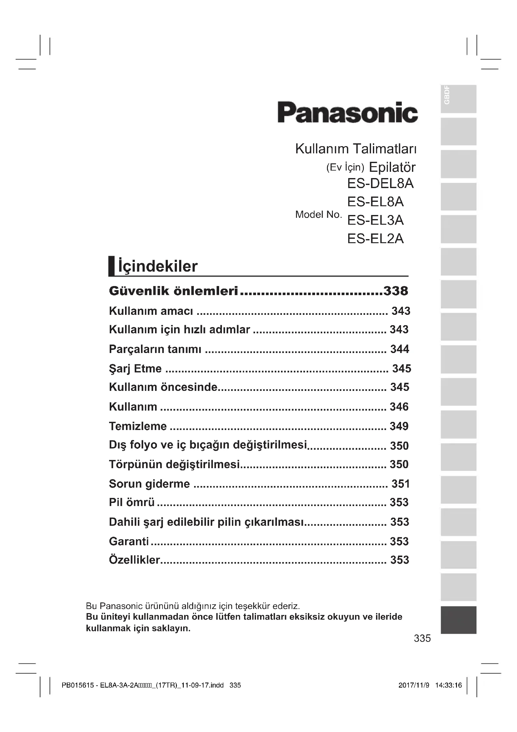 - Çıkarılan pilin artı ve eksi uçlarını kısa devre yapmamayadikkat edin ve uçlarına bant yapıştırarak yalıtımını sağlayın. Çevre koruması ve materyallerin geri dönüştürülmesi için Bu cihaz bir Lityum iyon pil ile donatılmıştır. Lütfen pilin (ülkenizde varsa) resmi olarak belirlenmiş bir yerde atılmasını sağlayınız. Garanti Bilgi almak isterseniz ya da epilatör veya kablo hasar görürse lütfen http://www.panasonic.com adresinde bulunan Panasonic web sitesini ziyaret edin veya yetkili bir servis merkezi (İrtibat adresini Pan Avrupa garanti belgesinde bulabilirsiniz) ile irtibata geçin. Özellikler Güç kaynağı AC adaptörü üzerindeki isim plakasına bakın. (Otomatik gerilim dönüştürme) Şarj süresi Yaklaşık 1 saat Havadaki Akustik Gürültü Bacaklar/kollar için epilasyon başlığı: 73 (dB (A) re 1 pW) Koltuk altı/bikini çizgisi için epilasyon başlığı: 67 (dB (A) re 1 pW) Tıraş başlığı: 64 (dB (A) re 1 pW) Ayak bakım başlığı: 69 (dB (A) re 1 pW) Bu ürün sadece ev kullanımı için tasarlanmıştır. PB015615 - EL8A-3A-2A_(17TR)_11-09-17.indd 353 2017/11/9 14:33:20354 ÜRETİCİ Panasonic Corporation 1006, Kadoma, Osaka 571-8501, Japan FABRİKA Panasonic Wanbao Appliances Beauty and Living (Guangzhou) Co., Ltd. 33, Wanbao North Street, Wanbao Industry Zone, Zhongcun, Panyu District, Guangzhou City, Guangdong Province, China YETKILI TEMSILCI İthalatçı Firma: Tesan İletişim A.Ş. Çobançeşme Mah. Bilge Sok. No:17 34196 Yenibosna- İstanbul Tel: 0212 454 60 70 Faks: 0212 454 60 20 www.tesan.com.tr