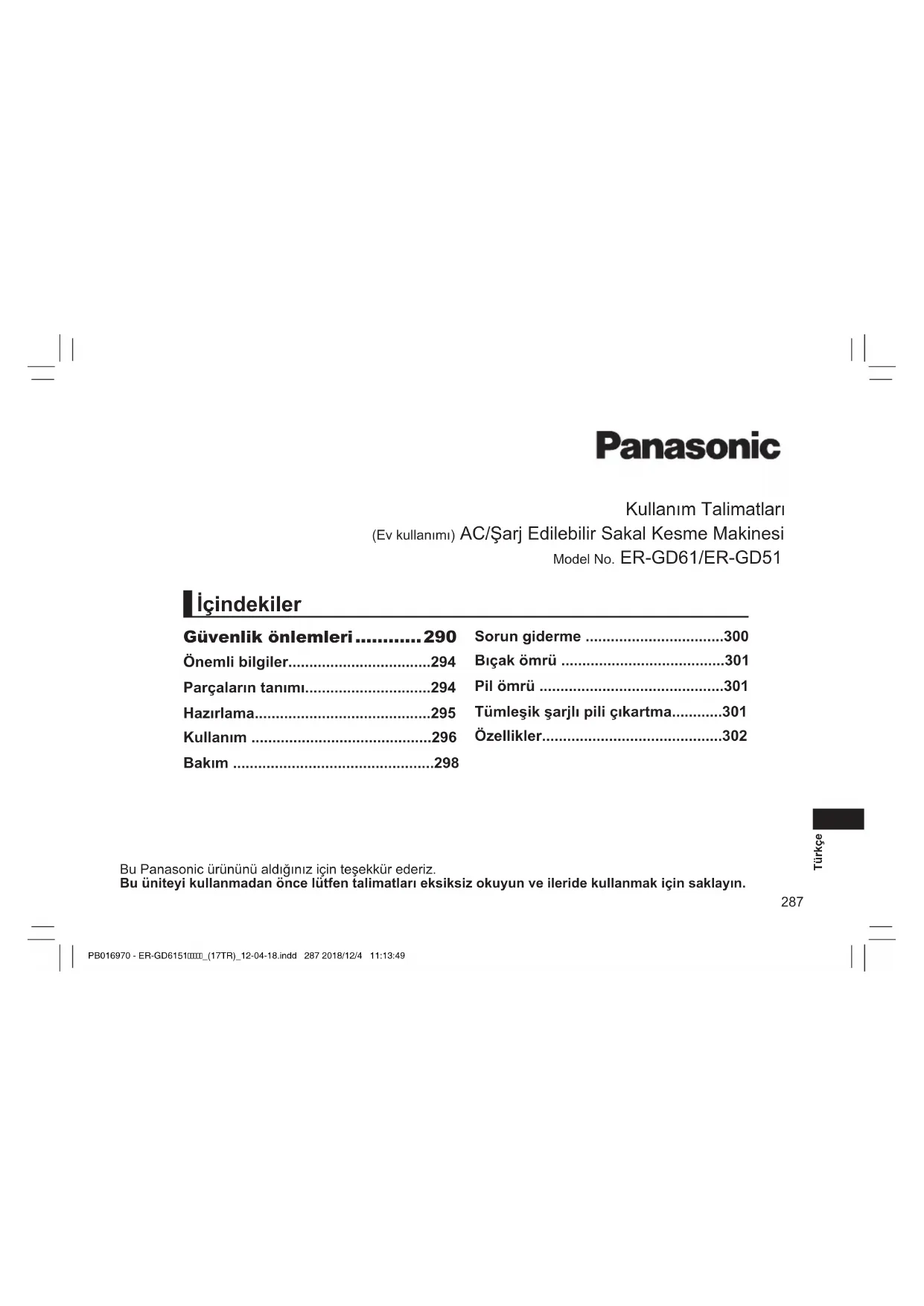 Böyle olması durumunda derhal doktora başvurun. Pil, alkali sıvı içerir. Cilt ya da elbiselerinizle temas ederse musluk suyu gibi temiz bir suyla iyice durulayın. ‑ Aksi durumda cilde zarar verebilir. PB016970 - ER-GD6151_(17TR)_12-04-18.indd 293 2018/12/4 11:13:50294 Türkçe Önemli bilgiler