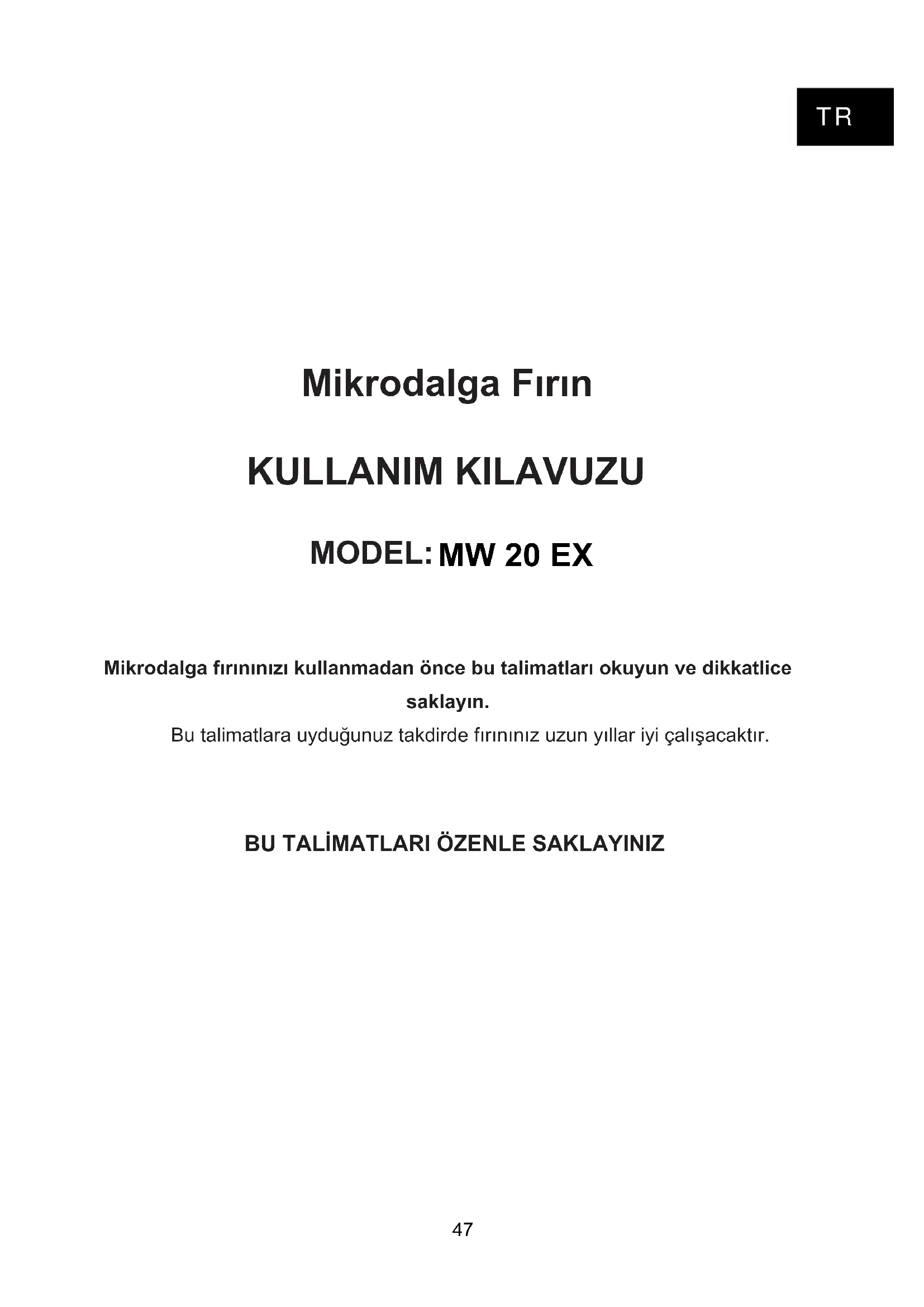 TRÖzellikler Model: Nominal Gerilim 230V~50Hz Nominal Giriş 1050W Nominal Çıkış Gücü (Mikrodalga) 700W Fırın Kapasitesi: 20L Döner Tabla Çapı: Ф255mm Dış Boyutlar: Net Ağırlık: Yaklaşık 10.71 kg MW 20 EX440 x 328 x 259 mm AŞIRI MİKRODALGA ENERJİSİNE MARUZ KALMAYI ÖNLEME ÖNLEMLERİ (a) Mikrodalga enerjisinin zararlı etkileşiminden dolayı, bu fırını kapağı açıkken çalıştırmayı denemeyiniz. İç emniyet kilitlerinin kırılmaması ve tahrif edilmemesi önem taşımaktadır. (b) Fırının ön yüzü ve kapağı arasına bir cisim koymayınız veya conta yüzeylerinde toprak veya deterjan kalıntılarının yığılmasına izin vermeyiniz. (c) UYARI: Kapak veya kapak contaları zarar görmüş ise, yetkili kişiler tarafından onarılmadan fırın çalıştırılmamalıdır.
