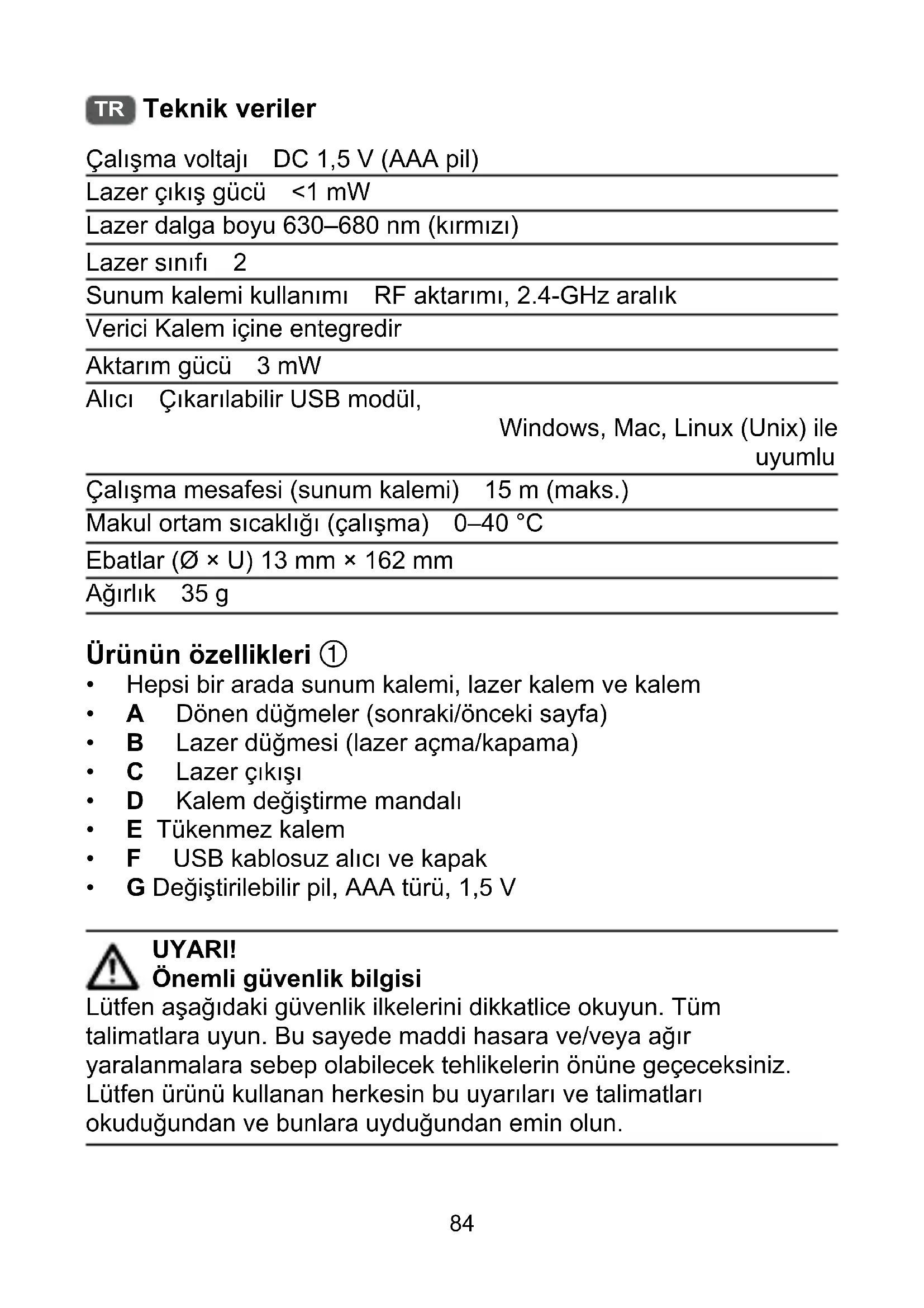 Teknik veriler Çalışmavoltajı DC 1,5 V (AAA pil) Lazerçıkışgücü <1 mW Lazer dalga boyu 630–680nm(kırmızı) Lazersınıfı 2 Sunumkalemikullanımı RFaktarımı,2.4-GHzaralık Verici Kalem içine entegredir Aktarımgücü 3 mW Alıcı ÇıkarılabilirUSBmodül, Windows, Mac, Linux (Unix) ile uyumlu Çalışmamesafesi(sunumkalemi) 15 m (maks.) Makulortamsıcaklığı(çalışma) 0–40 °C Ebatlar (Ø × U) 13 mm × 162 mm Ağırlık 35 g Ürünün özellikleri