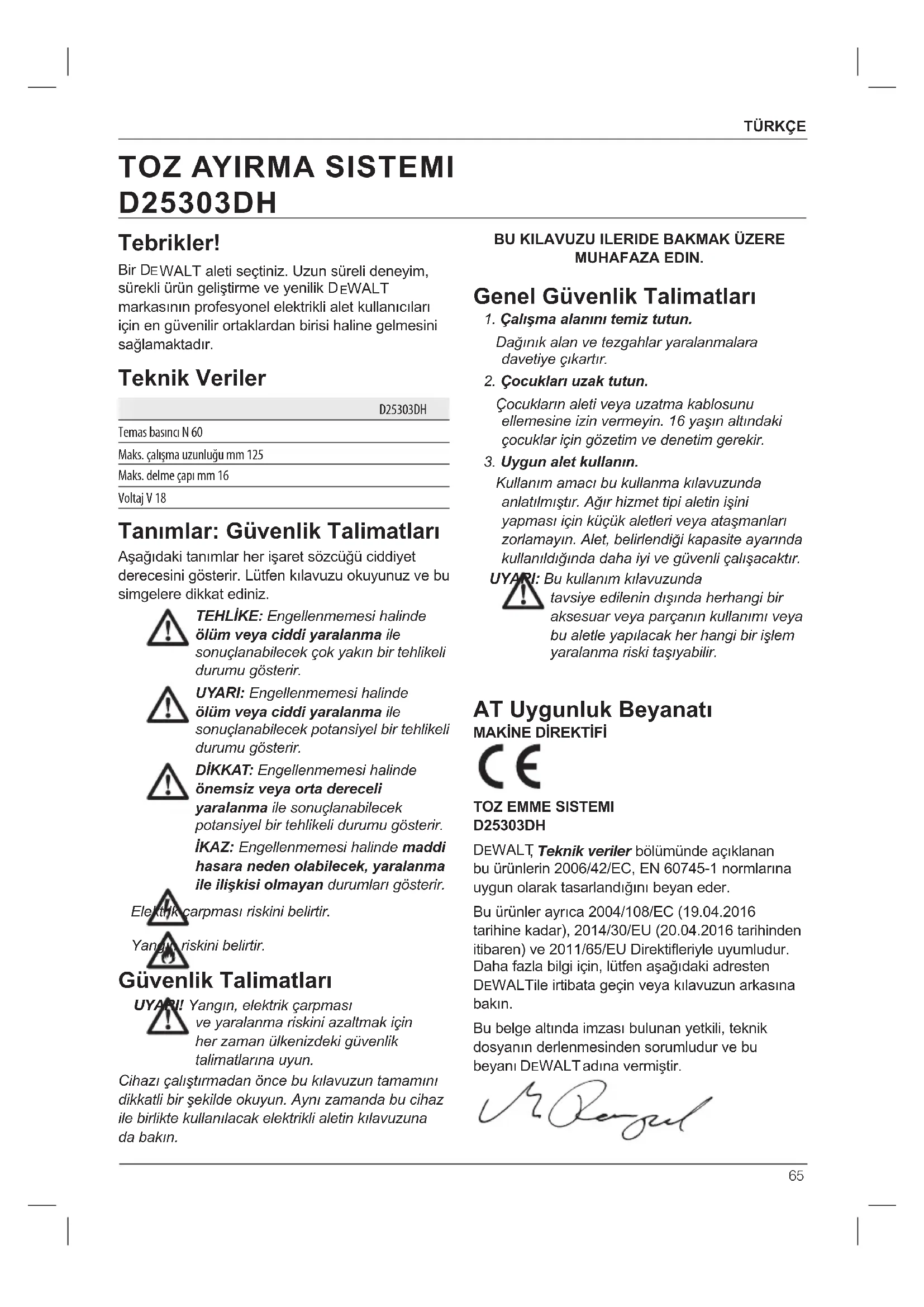 D25303DH DeWALT , Teknik veriler bölümünde açıklanan bu ürünlerin 2006/42/EC, EN 60745-1 normlarına uygun olarak tasarlandığını beyan eder. Bu ürünler ayrıca 2004/108/EC (19.04.2016 tarihine kadar), 2014/30/EU (20.04.2016 tarihinden itibaren) ve 2011/65/EU Direktifleriyle uyumludur. Daha fazla bilgi için, lütfen aşağıdaki adresten DeWALT ile irtibata geçin veya kılavuzun arkasına bakın. Bu belge altında imzası bulunan yetkili, teknik dosyanın derlenmesinden sorumludur ve bu beyanı DeWALT adına vermiştir. Tebrikler! Bir D