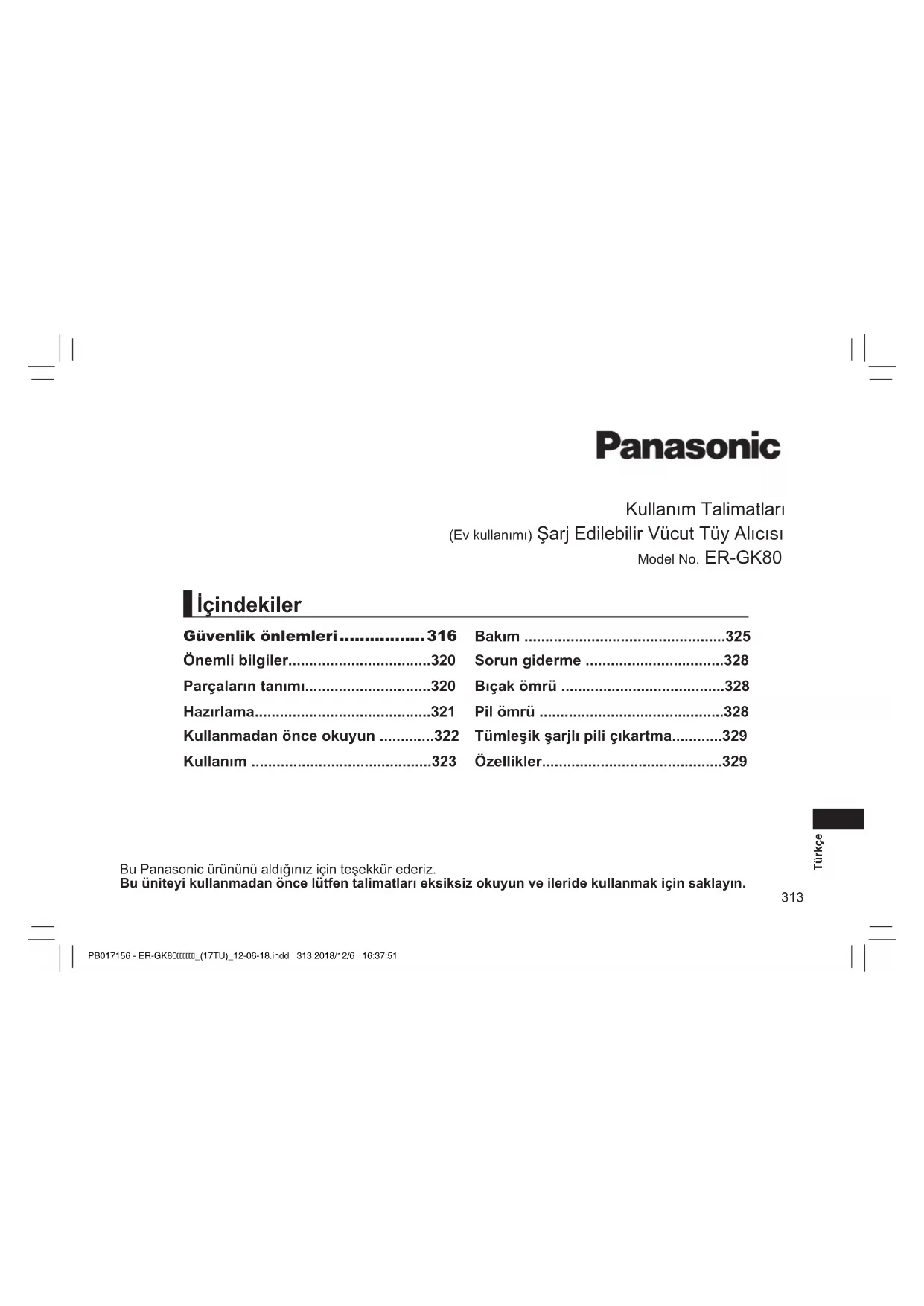 Böyle olması durumunda derhal doktora başvurun. Pil, alkali sıvı içerir. Cilt ya da elbiselerinizle temas ederse musluk suyu gibi temiz bir suyla iyice durulayın. ‑ Aksi durumda cilde zarar verebilir. PB017156 - ER-GK80_(17TU)_12-06-18.indd 319 2018/12/6 16:37:53320 Türkçe Önemli bilgiler