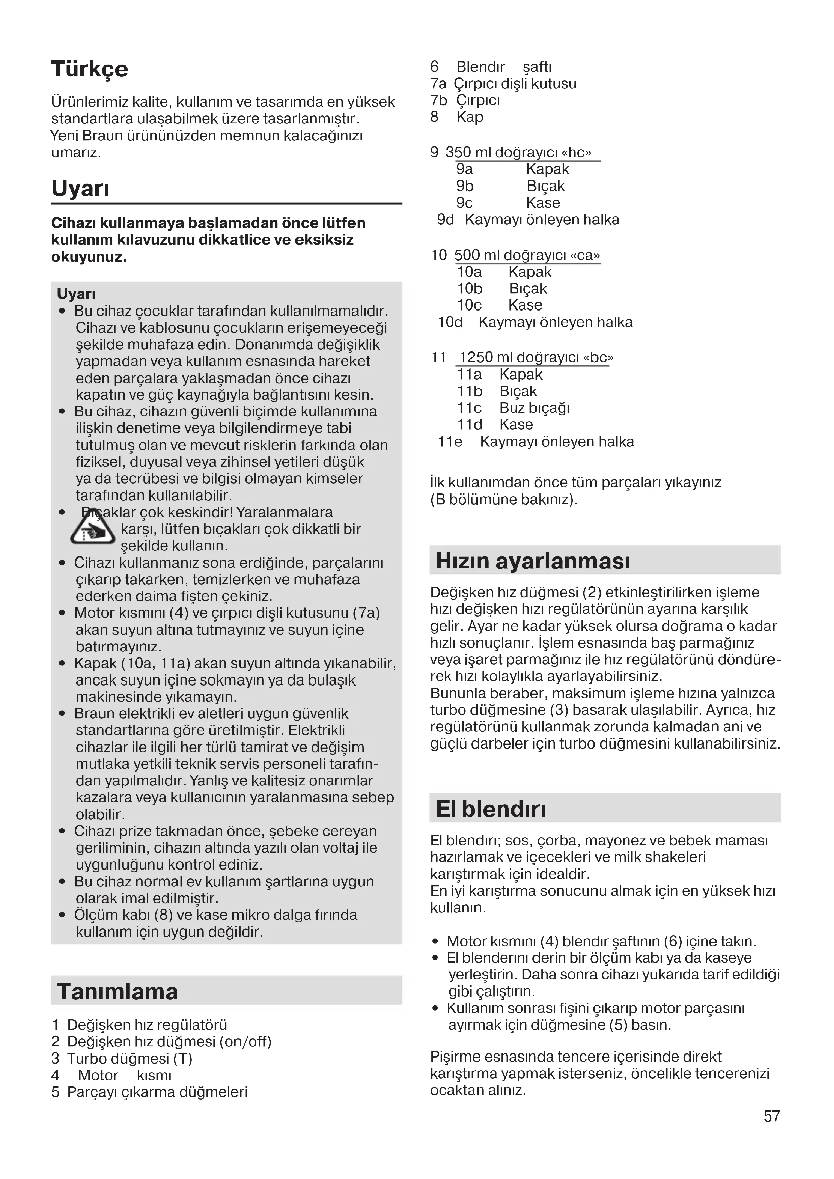 - Ölçüm kabı (8) ve kase mikro dalga fırında kullanım için uygun değildir. Tanımlama 1 Değişken hız regülatörü 2 Değişken hız düğmesi (on/off) 3 Turbo düğmesi (T) 4 Motor kısmı 5 Parçayı çıkarma düğmeleri 6 Blendır şaftı 7a Çırpıcı dişli kutusu 7b Çırpıcı 8 Kap 9 350 ml doğrayıcı «hc» 9a Kapak 9b Bıçak 9c Kase 9d Kaymayı önleyen halka 10 500 ml doğrayıcı «ca» 10a Kapak 10b Bıçak 10c Kase 10d Kaymayı önleyen halka 11 1250 ml doğrayıcı «bc» 11a Kapak 11b Bıçak 11c Buz bıçağı 11d Kase 11e Kaymayı önleyen halka İlk kullanımdan önce tüm parçaları yıkayınız (B bölümüne bakınız). Hızın ayarlanması Değişken hız düğmesi (2) etkinleştirilirken işleme hızı değişken hızı regülatörünün ayarına karşılık gelir. Ayar ne kadar yüksek olursa doğrama o kadar hızlı sonuçlanır. İşlem esnasında baş parmağınız veya işaret parmağınız ile hız regülatörünü döndüre- rek hızı kolaylıkla ayarlayabilirsiniz. Bununla beraber, maksimum işleme hızına yalnızca turbo düğmesine (3) basarak ulaşılabilir. Ayrıca, hız regülatörünü kullanmak zorunda kalmadan ani ve güçlü darbeler için turbo düğmesini kullanabilirsiniz. El blendırı El blendırı; sos, çorba, mayonez ve bebek maması hazırlamak ve içecekleri ve milk shakeleri karıştırmak için idealdir. En iyi karıştırma sonucunu almak için en yüksek hızı kullanın.