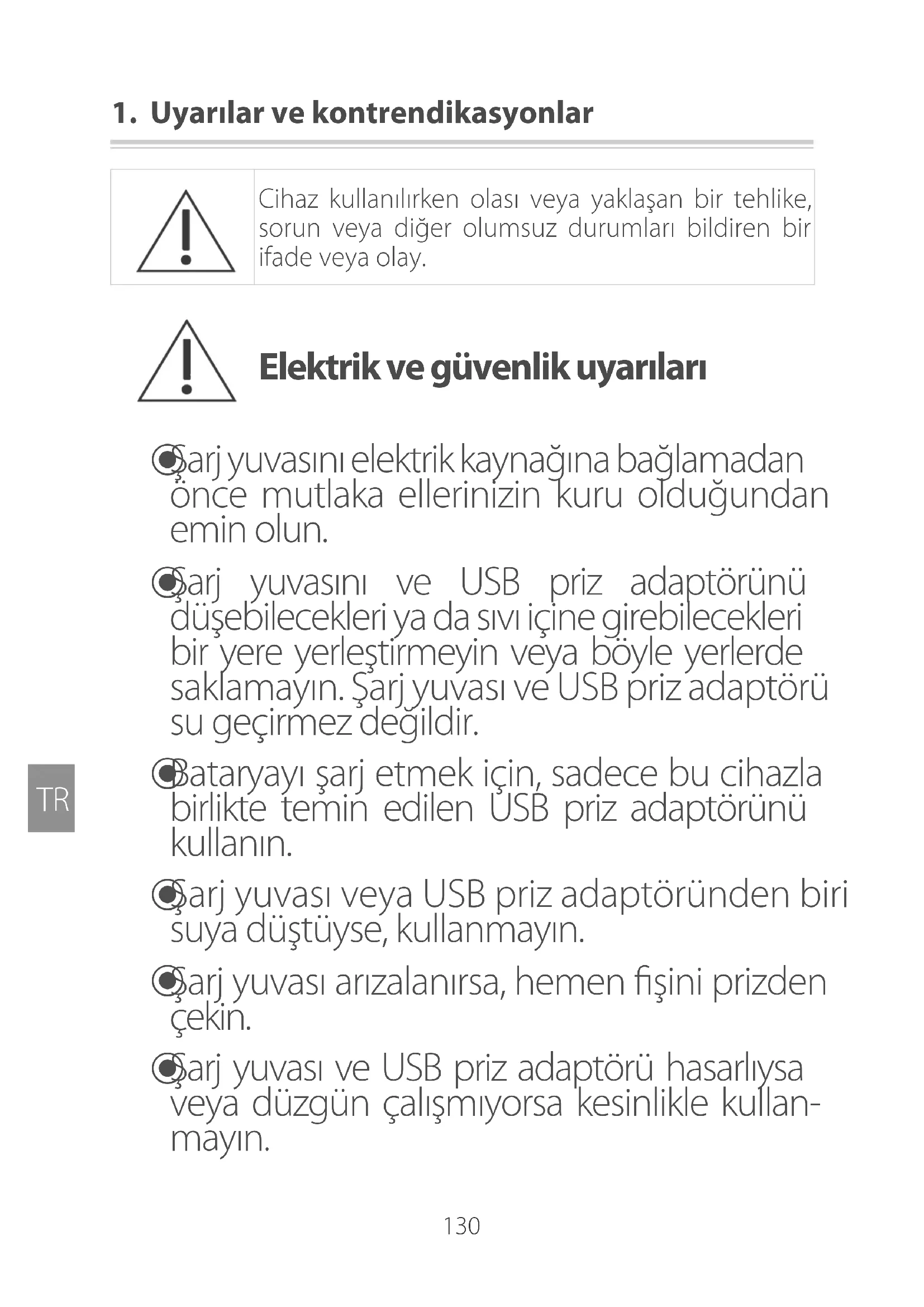 Sarj yuvası veya USB pris adaptorörunden biri suyareuse,yse, kullanmayın.