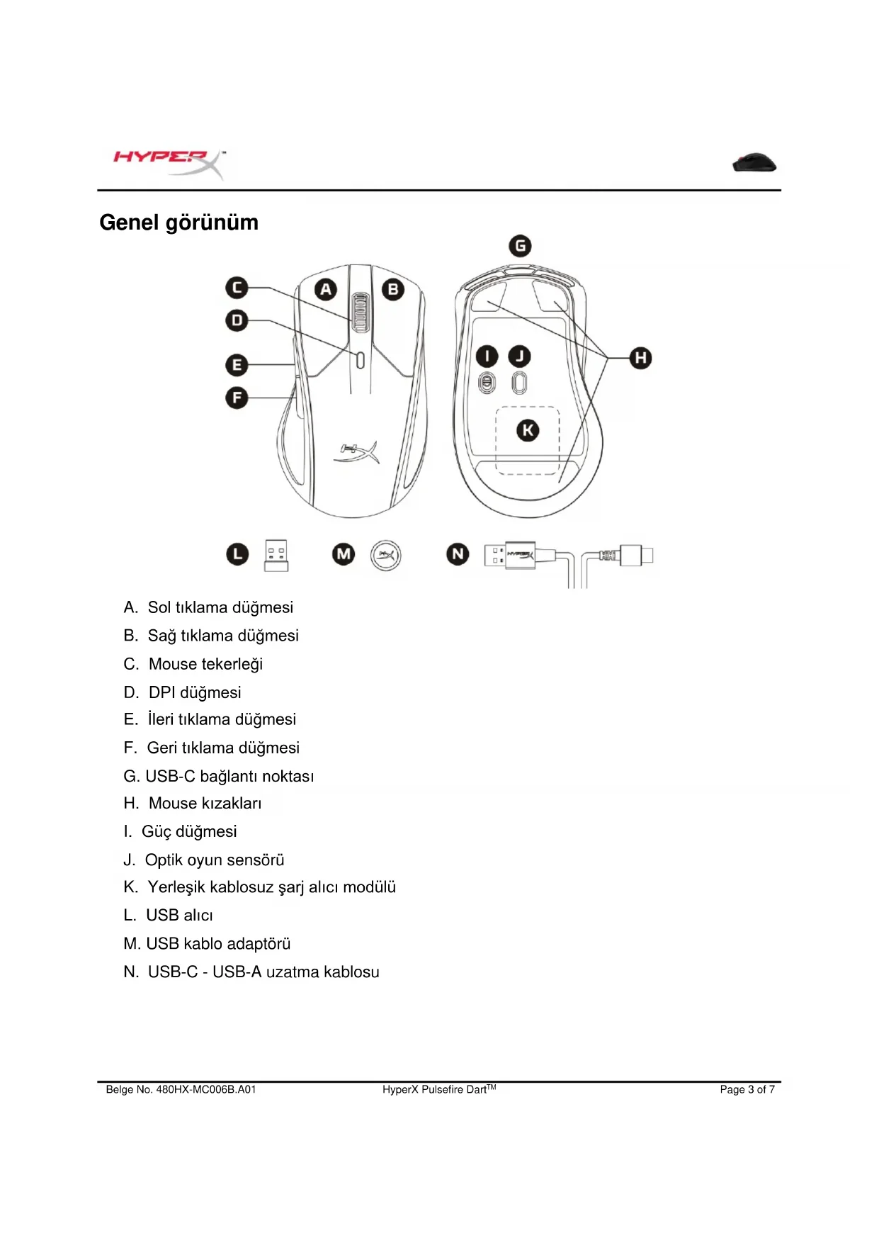 J. Optik oyun sensörü K. Yerleşik kablosuz şarj alıcı modülü L. USB alıcı M. USB kablo adaptörü N. USB-C - USB-A uzatma kablosuBelge No. 480HX-MC006B.A01 HyperX Pulsefire Dart