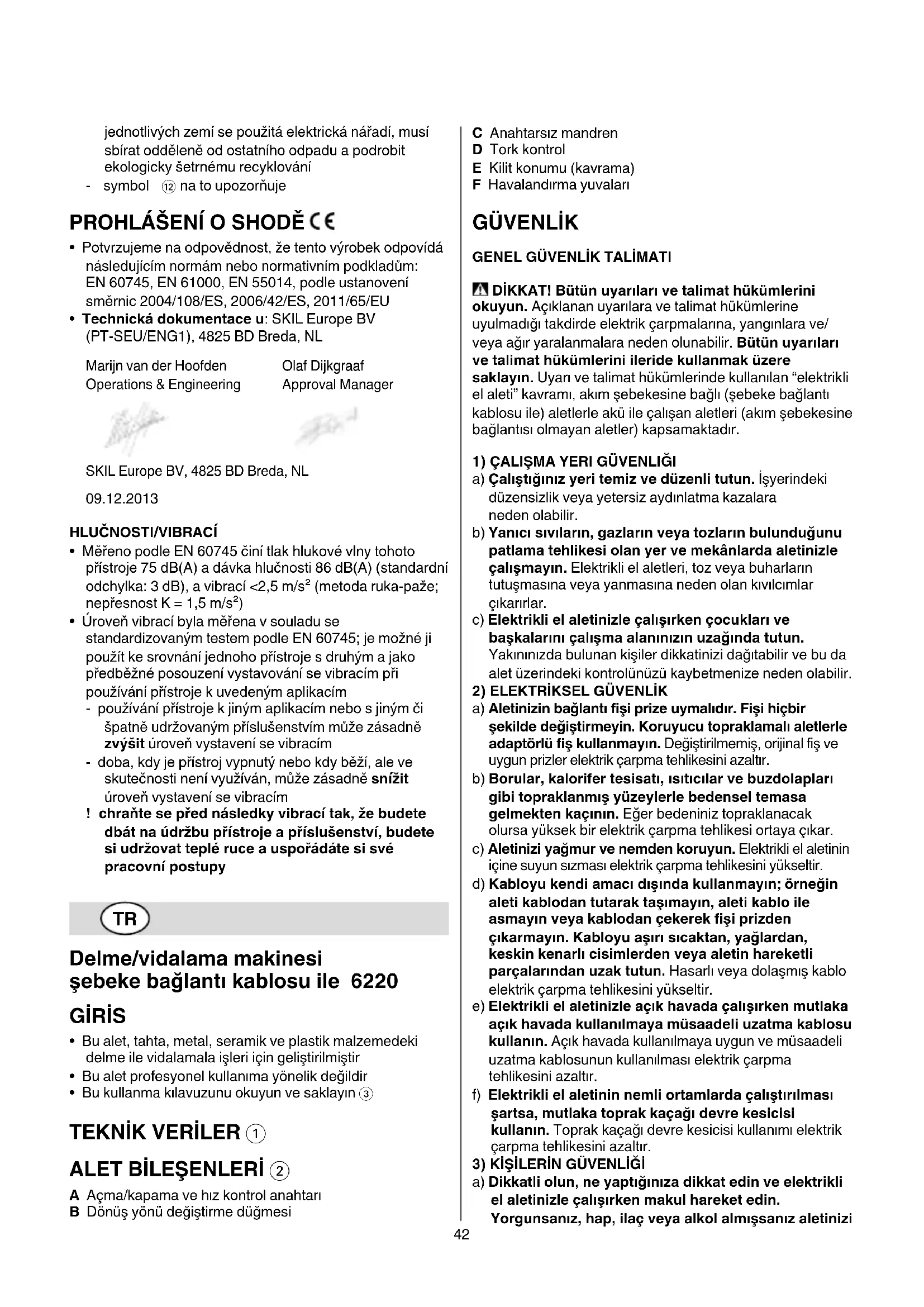 - Yeğane sorumlu olarak, bu ürünün aşağıdaki standartlara veya standart belgelerine uygun olduğunu beyan ederiz: EN 60745, EN 61000, EN 55014, yönetmeliği hükümleri uyarınca 2004/108/EG, 2006/42/EG, 2011/65/EU