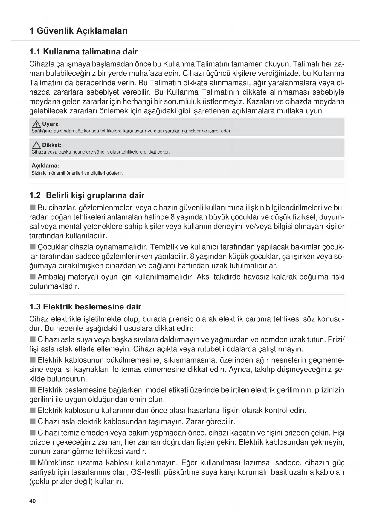 Cihaz elektrikle iúletilmekte olup, burada prensip olarak elektrik çarpma tehlikesi söz konusu- dur. Bu nedenle aúa÷Õdaki hususlara dikkat edin: CihazÕ asla suya veya baúka sÕvÕlara daldÕrmayÕn ve ya÷murdan ve nemden uzak tutun. Prizi/ fiúi asla Õslak ellerle ellemeyin. CihazÕ açÕkta veya rutubetli odalarda çalÕútÕrmayÕn. Elektrik kablosunun bükülmemesine, sÕkÕúmamasÕna, üzerinden a÷Õr nesnelerin geçmeme- sine veya ÕsÕ kaynaklarÕ ile temas etmemesine dikkat edin. AyrÕca, takÕlÕp düúmeyece÷iniz úe- kilde bulundurun. Elektrik beslemesine ba÷larken, model etiketi üzerinde belirtilen elektrik geriliminin, prizinizin gerilimi ile uygun oldu÷undan emin olun. Elektrik kablosunu kullanÕmÕndan önce olasÕ hasarlara iliúkin olarak kontrol edin. CihazÕ asla elektrik kablosundan taúÕmayÕn. Zarar görebilir. CihazÕ temizlemeden veya bakÕm yapmadan önce, cihazÕ kapatÕn ve fiúini prizden çekin. Fiúi prizden çekece÷iniz zaman, her zaman do÷rudan fiúten çekin. Elektrik kablosundan çekmeyin, bunun zarar görme tehlikesi vardÕr. Mümkünse uzatma kablosu kullanmayÕn. E÷er kullanÕlmasÕ lazÕmsa, sadece, cihazÕn güç sarfiyatÕ için tasarlanmÕú olan, GS-testli, püskürtme suya karúÕ korumalÕ, basit uzatma kablolarÕ (çoklu prizler de÷il) kullanÕn. UyarÕ: Sa÷lÕ÷ÕnÕz açÕsÕndan söz konusu tehlikelere karúÕ uyarÕr ve olasÕ yaralanma risklerine iúaret eder. Dikkat: Cihaza veya baúka nesnelere yönelik olasÕ tehlikelere dikkat çeker. AçÕklama: Sizin için önemli önerileri ve bilgileri gösterir.41 1 Güvenlik AçÕklamalarÕ
