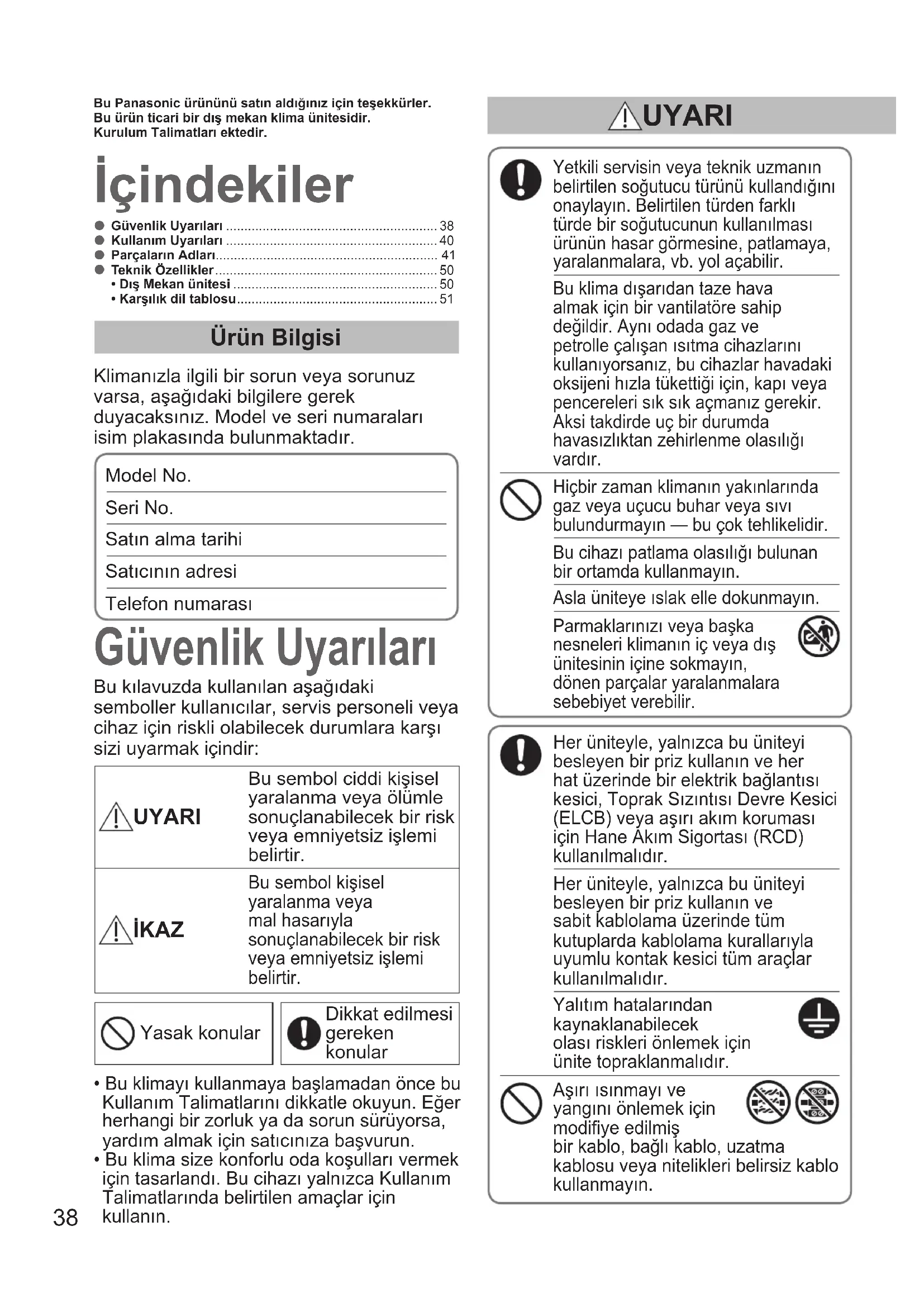 - Karşılıkdiltablosu ....................................................... 51 İçindekiler GüvenlikUyarıları Ürün Bilgisi Klimanızla ilgili bir sorun veya sorunuz varsa, aşağıdaki bilgilere gerek duyacaksınız. Model ve seri numaraları isim plakasında bulunmaktadır. Model No. Seri No. Satın alma tarihi Satıcının adresi Telefon numarası Yetkili servisin veya teknik uzmanın belirtilen soğutucu türünü kullandığını onaylayın. Belirtilen türden farklı türde bir soğutucunun kullanılması ürünün hasar görmesine, patlamaya, yaralanmalara, vb. yol açabilir. Bu klima dışarıdan taze hava almak için bir vantilatöre sahip değildir. Aynı odada gaz ve petrolle çalışan ısıtma cihazlarını kullanıyorsanız, bu cihazlar havadaki oksijeni hızla tükettiği için, kapı veya pencereleri sık sık açmanız gerekir. Aksi takdirde uç bir durumda havasızlıktan zehirlenme olasılığı vardır. Hiçbir zaman klimanın yakınlarında gaz veya uçucu buhar veya sıvı bulundurmayın — bu çok tehlikelidir. Bu cihazı patlama olasılığı bulunan bir ortamda kullanmayın. Asla üniteye ıslak elle dokunmayın. Parmaklarınızı veya başka nesneleri klimanın iç veya dış ünitesinin içine sokmayın, dönen parçalar yaralanmalara sebebiyet verebilir. Bu kılavuzda kullanılan aşağıdaki semboller kullanıcılar, servis personeli veya cihaz için riskli olabilecek durumlara karşı sizi uyarmak içindir: UYARI Bu sembol ciddi kişisel yaralanma veya ölümle sonuçlanabilecek bir risk veya emniyetsiz işlemi belirtir. İKAZ Bu sembol kişisel yaralanma veya mal hasarıyla sonuçlanabilecek bir risk veya emniyetsiz işlemi belirtir. Yasak konular Dikkat edilmesi gereken konular BuPanasonicürününüsatınaldığınıziçinteşekkürler.Buürünticaribirdışmekanklimaünitesidir.KurulumTalimatlarıektedir.
