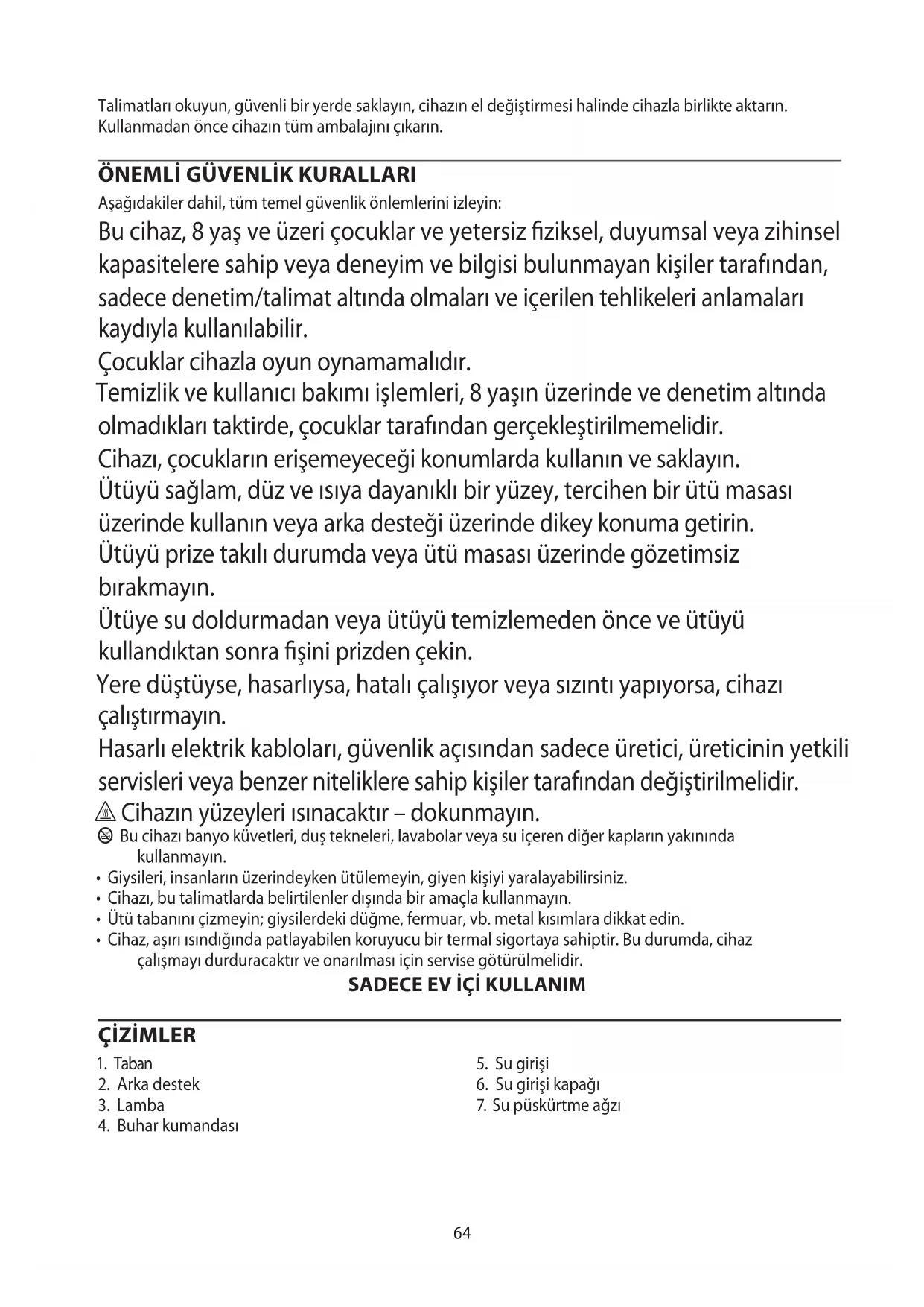 Aşağıdakiler dahil, tüm temel güvenlik önlemlerini izleyin: Bu cihaz, 8 yaş ve üzeri çocuklar ve yetersiz ziksel, duyumsal veya zihinsel kapasitelere sahip veya deneyim ve bilgisi bulunmayan kişiler tarafından, sadece denetim/talimat altında olmaları ve içerilen tehlikeleri anlamaları kaydıyla kullanılabilir. Çocuklar cihazla oyun oynamamalıdır. Temizlik ve kullanıcı bakımı işlemleri, 8 yaşın üzerinde ve denetim altında olmadıkları taktirde, çocuklar tarafından gerçekleştirilmemelidir. Cihazı, çocukların erişemeyeceği konumlarda kullanın ve saklayın. Ütüyü sağlam, düz ve ısıya dayanıklı bir yüzey, tercihen bir ütü masası üzerinde kullanın veya arka desteği üzerinde dikey konuma getirin. Ütüyü prize takılı durumda veya ütü masası üzerinde gözetimsiz bırakmayın. Ütüye su doldurmadan veya ütüyü temizlemeden önce ve ütüyü kullandıktan sonra şini prizden çekin. Yere düştüyse, hasarlıysa, hatalı çalışıyor veya sızıntı yapıyorsa, cihazı çalıştırmayın. Hasarlı elektrik kabloları, güvenlik açısından sadece üretici, üreticinin yetkili servisleri veya benzer niteliklere sahip kişiler tarafından değiştirilmelidir. h Cihazın yüzeyleri ısınacaktır – dokunmayın. b Bu cihazı banyo küvetleri, duş tekneleri, lavabolar veya su içeren diğer kapların yakınında kullanmayın.