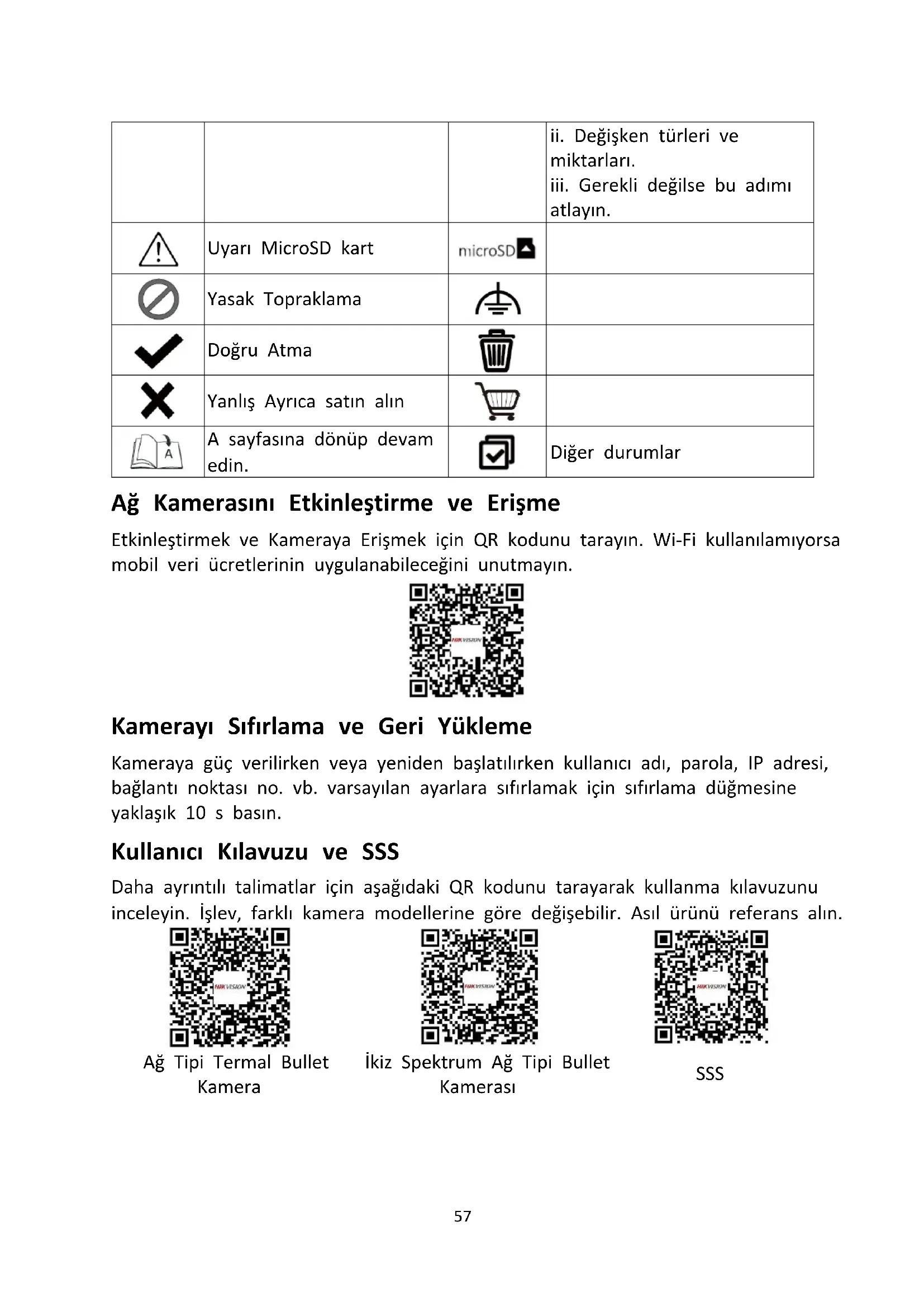 atlayın. Uyarı MicroSD kart Yasak Topraklama Doğru Atma Yanlış Ayrıca satın alın A sayfasına dönüp devam edin. Diğer durumlar Ağ Kamerasını Etkinleştirme ve Erişme Etkinleştirmek ve Kameraya Erişmek için QR kodunu tarayın. Wi-Fi kullanılamıyorsa mobil veri ücretlerinin uygulanabileceğini unutmayın. Kamerayı Sıfırlama ve Geri Yükleme Kameraya güç verilirken veya yeniden başlatılırken kullanıcı adı, parola, IP adresi, bağlantı noktası no. vb. varsayılan ayarlara sıfırlamak için sıfırlama düğmesine yaklaşık 10 s basın. Kullanıcı Kılavuzu ve SSS Daha ayrıntılı talimatlar için aşağıdaki QR kodunu tarayarak kullanma kılavuzunu inceleyin. İşlev, farklı kamera modellerine göre değişebilir. Asıl ürünü referans alın. Ağ Tipi Termal Bullet Kamera İkiz Spektrum Ağ Tipi Bullet Kamerası SSS58 Mevzuata Uygunluk ve Güvenlik Bilgileri Cihazı kullanmaya başlamadan önce bu belgedeki tüm bilgi ve talimatları dikkatlice okuyun ve daha sonra başvurmak üzere saklayın. Cihazlarla ilgili bilgi ve talimatlar için lütfen https://www.hikvision.com adresindeki web sitemizi ziyaret edin. Ayrıca daha fazla bilgi edinmek için (varsa) cihazla birlikte gelen belgelere bakabilir veya (varsa) paket üzerindeki QR kodunu tarayabilirsiniz. Yasal Uyari YÜRÜRLÜKTE OLAN YASALARCA İZİN VERİLEN AZAMİ ÖLÇÜDE BU KILAVUZ VE AYRICA DONANIMI, YAZILIMI VE AYGIT YAZILIMI İLE BİRLİKTE TARİF EDİLEN ÜRÜN "TÜM HATALAR VE ARIZALARLA BİRLİKTE" VE "OLDUĞU GİBİ" SUNULMUŞTUR. HIKVISION, TİCARETE ELVERİŞLİLİK, TATMİN EDİCİ KALİTE VEYA BELİRLİ BİR AMACA UYGUNLUK DA DAHİL ANCAK BUNLARLA SINIRLI OLMAMAK ÜZERE AÇIK VEYA ZIMNİ HİÇBİR GARANTİ VERMEZ. ÜRÜNÜN SİZİN TARAFINIZDAN KULLANIMI KENDİ SORUMLULUĞUNUZDADIR. HIKVISION HİÇBİR DURUMDA, BU ÜRÜNÜN KULLANIMI İLE BAĞLANTILI OLARAK, HIKVISION BU