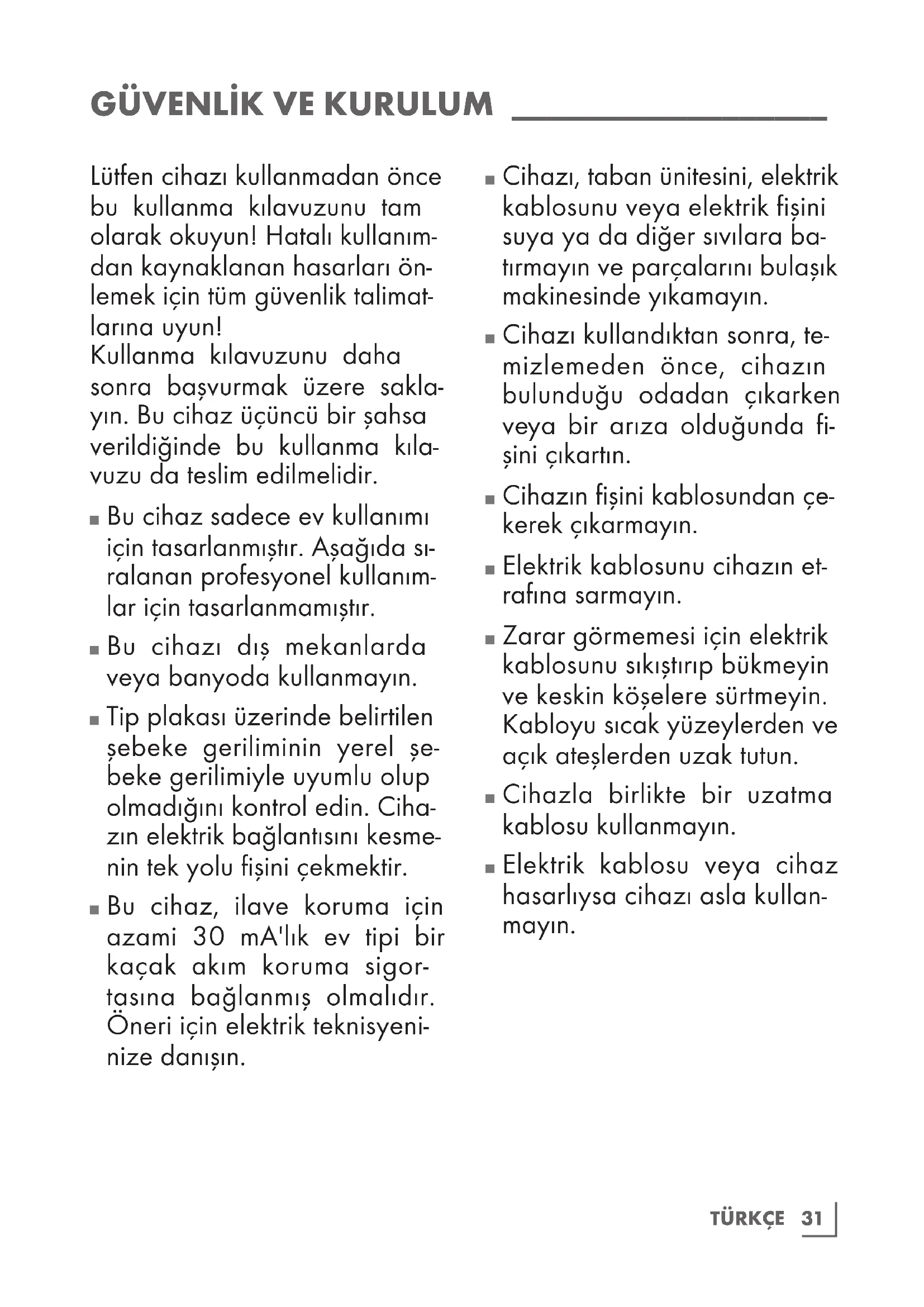 Lütfen cihazı kullanmadan önce bu kullanma kılavuzunu tam olarak okuyun! Hatalı kullanım- dan kaynaklanan hasarları ön- lemek için tüm güvenlik talimat- larına uyun! Kullanma kılavuzunu daha sonra başvurmak üzere sakla- yın. Bu cihaz üçüncü bir şahsa verildiğinde bu kullanma kıla- vuzu da teslim edilmelidir.