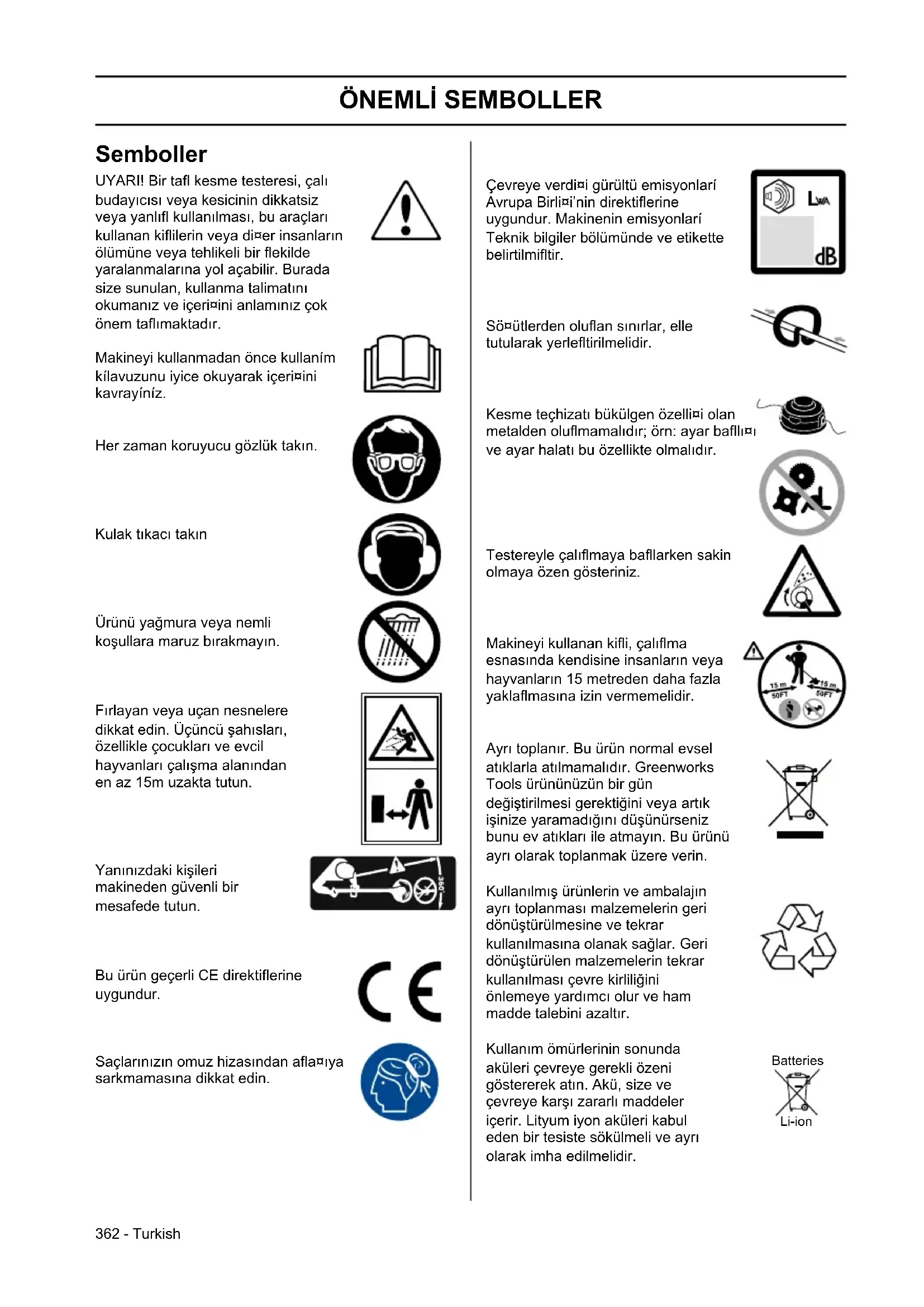 - so bili upoštevani naslednji evropski harmonizacijski standardi (njihovi deli/stavki) EN60335-1, EN 50636-2-91, EN ISO 3744, ISO 11094, EN 55014-1, EN 55014-2 A V Technology Ltd AVTECH House, Arkle Avenue, Stanley Green Trading, Estate, Handforth, Cheshire, SK9 3RW Izmerjena raven zvočne moči 92.73 dB(A) Zajamčena raven zvočne moči 96 dB(A) Način ugotavljanja skladnosti po Aneksu VI Direktive 2000/14/ES Kraj, datum: Changzhou, 22/07/2016 Podpis: Gary Gao Naixin (BEng, CEng, MIET) Podpredsednik tehničnega oddelka362 - Turkish ÖNEMLİ SEMBOLLER Semboller UYARI! Bir tafl kesme testeresi, çalı budayıcısı veya kesicinin dikkatsiz veya yanlıfl kullanılması, bu araçları kullanan kiflilerin veya di¤er insanların ölümüne veya tehlikeli bir flekilde yaralanmalarına yol açabilir. Burada size sunulan, kullanma talimatını okumanız ve içeri¤ini anlamınız çok önem taflımaktadır. Makineyi kullanmadan önce kullaním kílavuzunu iyice okuyarak içeri¤ini kavrayíníz. Her zaman koruyucu gözlük takın. Kulak tıkacı takın Ürünü yağmura veya nemli koşullara maruz bırakmayın. Fırlayan veya uçan nesnelere dikkat edin. Üçüncü şahısları, özellikle çocukları ve evcil hayvanları çalışma alanından en az 15m uzakta tutun. Yanınızdaki kişileri makineden güvenli bir mesafede tutun. Bu ürün geçerli CE direktiflerine uygundur. Saçlarınızın omuz hizasından afla¤ıya sarkmamasına dikkat edin. Çevreye verdi¤i gürültü emisyonlarí Avrupa Birli¤i’nin direktiflerine uygundur. Makinenin emisyonlarí Teknik bilgiler bölümünde ve etikette belirtilmifltir. Sö¤ütlerden oluflan sınırlar, elle tutularak yerlefltirilmelidir. Kesme teçhizatı bükülgen özelli¤i olan metalden oluflmamalıdır; örn: ayar bafllı¤ı ve ayar halatı bu özellikte olmalıdır. Testereyle çalıflmaya bafllarken sakin olmaya özen gösteriniz. Makineyi kullanan kifli, çalıflma esnasında kendisine insanların veya hayvanların 15 metreden daha fazla yaklaflmasına izin vermemelidir. Ayrı toplanır. Bu ürün normal evsel atıklarla atılmamalıdır. Greenworks Tools ürününüzün bir gün değiştirilmesi gerektiğini veya artık işinize yaramadığını düşünürseniz bunu ev atıkları ile atmayın. Bu ürünü ayrı olarak toplanmak üzere verin. Kullanılmış ürünlerin ve ambalajın ayrı toplanması malzemelerin geri dönüştürülmesine ve tekrar kullanılmasına olanak sağlar. Geri dönüştürülen malzemelerin tekrar kullanılması çevre kirliliğini önlemeye yardımcı olur ve ham madde talebini azaltır. Kullanım ömürlerinin sonunda aküleri çevreye gerekli özeni göstererek atın. Akü, size ve çevreye karşı zararlı maddeler içerir. Lityum iyon aküleri kabul eden bir tesiste sökülmeli ve ayrı olarak imha edilmelidir. Batteries Li-ion363Turkish - İçindekiler ÖNEMLİ SEMBOLLER Semboller ............................................................... 362 İÇİNDEKİLER İçindekiler...................................................... 363 Balamadan önce aa¤ídaki konulara dikkat ediniz. 363 NE NEDİR? İpli budama makinesinde hangi parça ne işe yarar?. 364