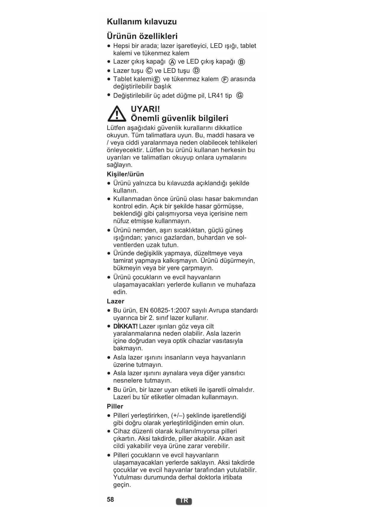 Bu ürün, bir lazer uyarı etiketi ile işaretli olmalıdır. Lazeri bu tür etiketler olmadan kullanmayın. Piller