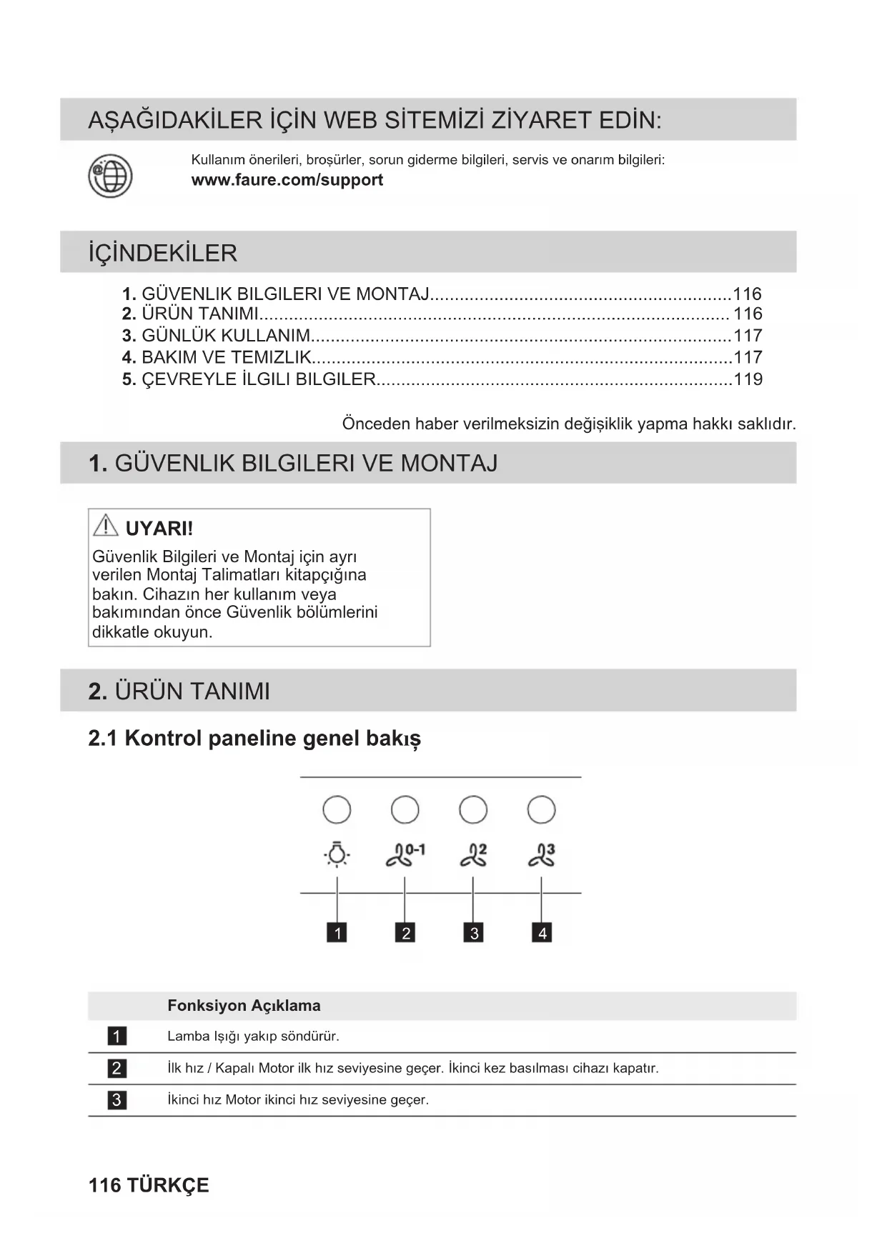 UYARI! Güvenlik Bilgileri ve Montaj için ayrı verilen Montaj Talimatları kitapçığına bakın. Cihazın her kullanım veya bakımından önce Güvenlik bölümlerini dikkatle okuyun.