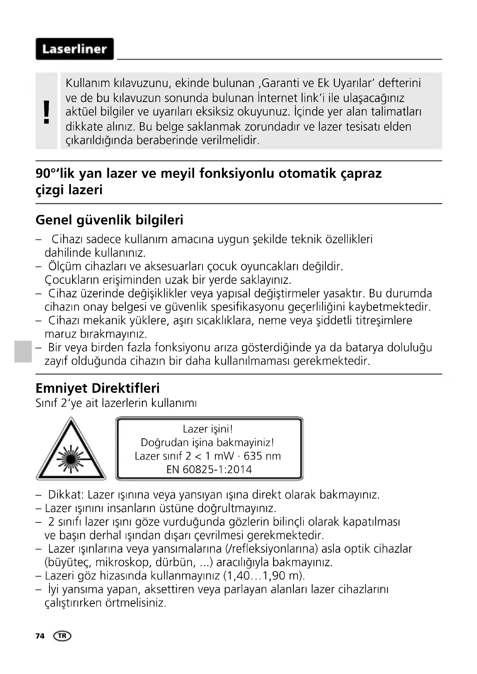 – Dikkat: Lazer ışınına veya yansıyan ışına direkt olarak bakmayınız. – Lazer ışınını insanların üstüne doğrultmayınız. – 2 sınıfı lazer ışını göze vurduğunda gözlerin bilinçli olarak kapatılması ve başın derhal ışından dışarı çevrilmesi gerekmektedir. – Lazer ışınlarına veya yansımalarına (/reeksiyonlarına) asla optik cihazlar (büyüteç, mikroskop, dürbün, ...) aracılığıyla bakmayınız. – Lazeri göz hizasında kullanmayınız (1,40…1,90 m). – İyi yansıma yapan, aksettiren veya parlayan alanları lazer cihazlarını çalıştırırken örtmelisiniz. Emniyet Direktifleri Sınıf 2‘ye ait lazerlerin kullanımı – Cihazı sadece kullanım amacına uygun şekilde teknik özellikleri dahilinde kullanınız. – Ölçüm cihazları ve aksesuarları çocuk oyuncakları değildir. Çocukların erişiminden uzak bir yerde saklayınız. – Cihaz üzerinde değişiklikler veya yapısal değiştirmeler yasaktır. Bu durumda cihazın onay belgesi ve güvenlik spesikasyonu geçerliliğini kaybetmektedir. – Cihazı mekanik yüklere, aşırı sıcaklıklara, neme veya şiddetli titreşimlere maruz bırakmayınız. – Bir veya birden fazla fonksiyonu arıza gösterdiğinde ya da batarya doluluğu zayıf olduğunda cihazın bir daha kullanılmaması gerekmektedir. Genel güvenlik bilgileri Lazer işini! Doğrudan işina bakmayiniz! Lazer sınıf 2 < 1 mW · 635 nm EN 60825-1:2014 90°‘lik yan lazer ve meyil fonksiyonlu otomatik çapraz çizgi lazeri TR75 CompactCube-Laser 3