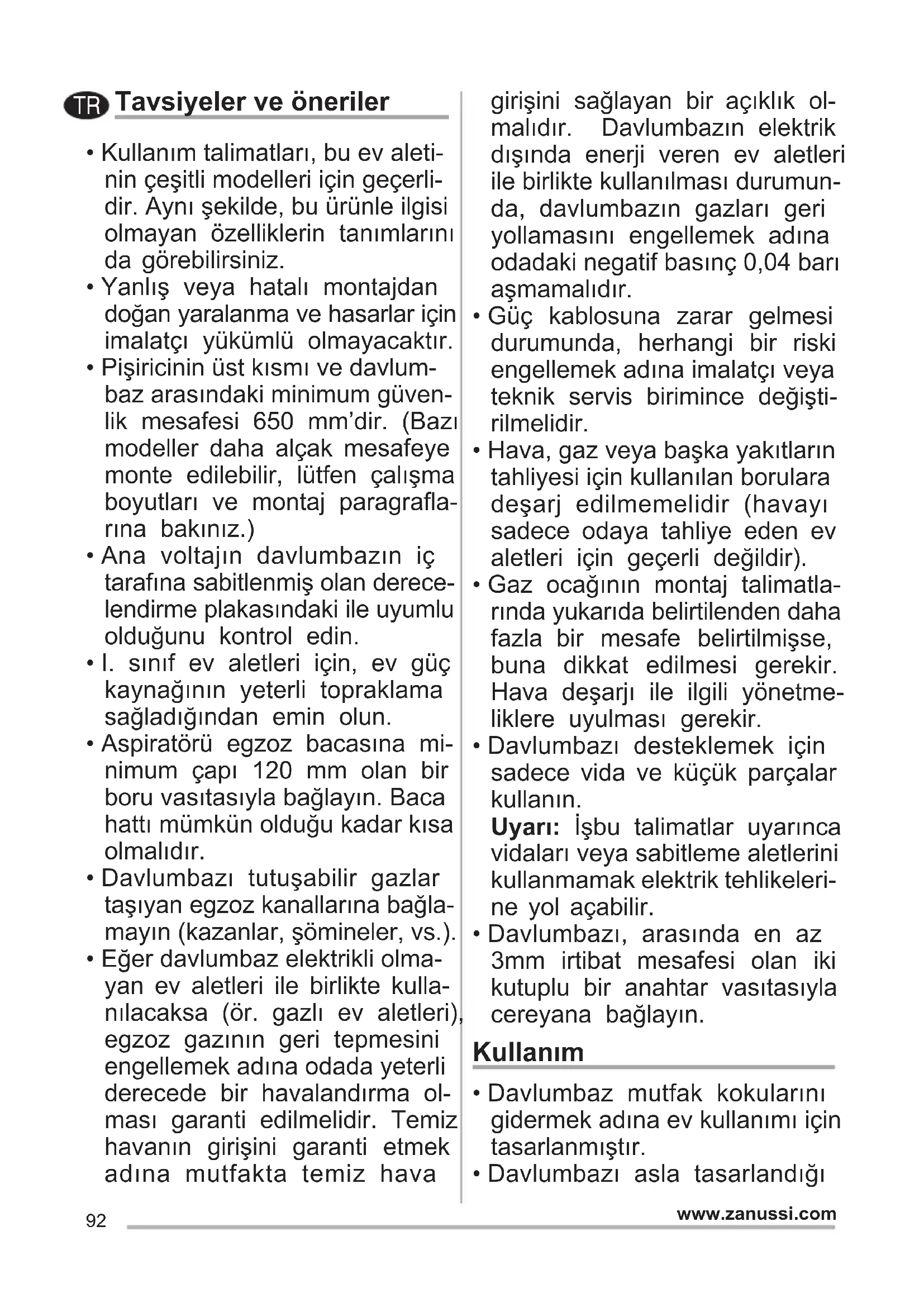 - Davlumbazı asla tasarlandığı TR93 www.zanussi.com amaçlar haricinde kullanmayın.