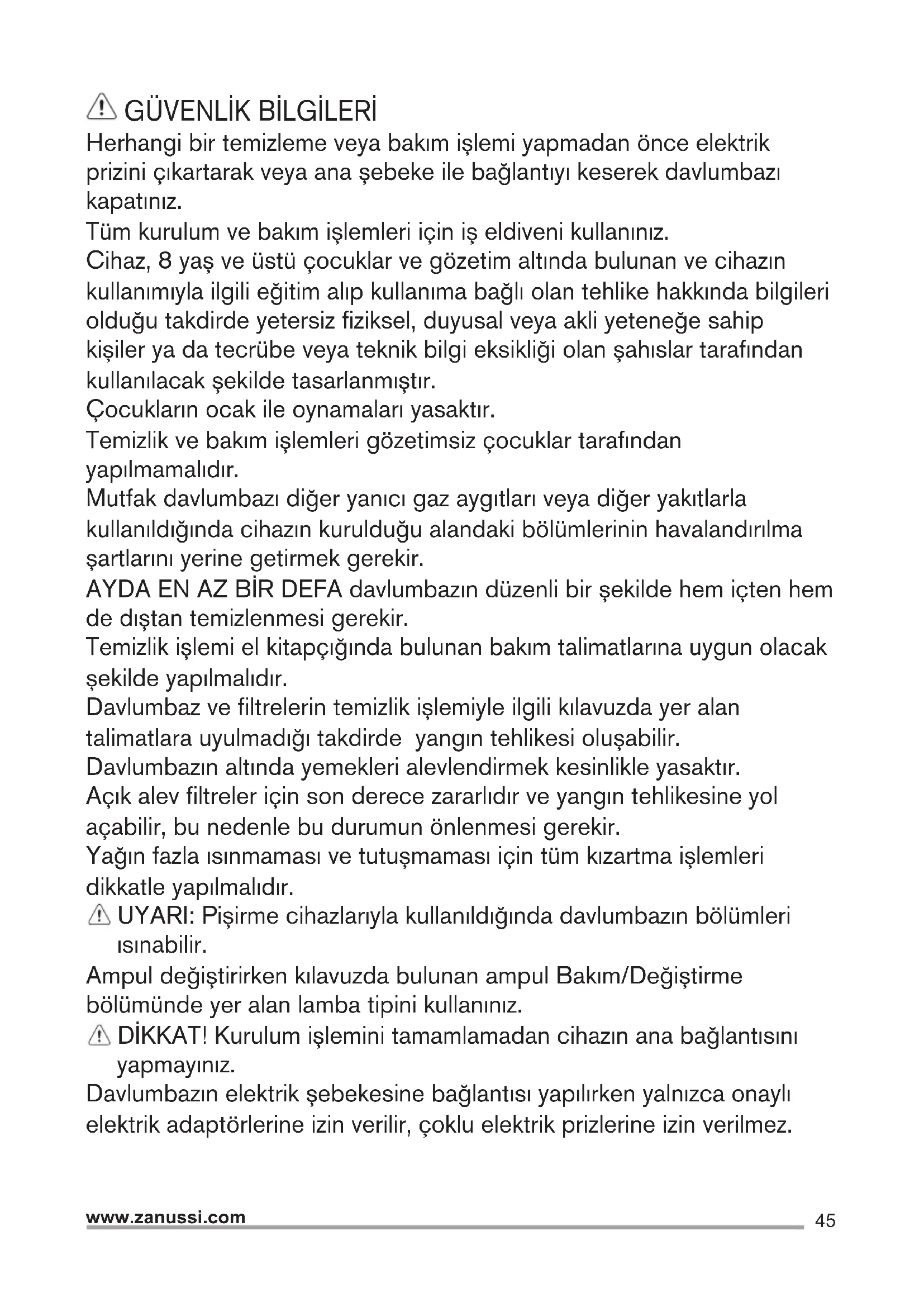 Herhangi bir temizleme veya bakım işlemi yapmadan önce elektrik prizini çıkartarak veya ana şebeke ile bağlantıyı keserek davlumbazı kapatınız. Tüm kurulum ve bakım işlemleri için iş eldiveni kullanınız. Cihaz, 8 yaş ve üstü çocuklar ve gözetim altında bulunan ve cihazın kullanımıyla ilgili eğitim alıp kullanıma bağlı olan tehlike hakkında bilgileri olduğu takdirde yetersiz fiziksel, duyusal veya akli yeteneğe sahip kişiler ya da tecrübe veya teknik bilgi eksikliği olan şahıslar tarafından kullanılacak şekilde tasarlanmıştır. Çocukların ocak ile oynamaları yasaktır. Temizlik ve bakım işlemleri gözetimsiz çocuklar tarafından yapılmamalıdır. Mutfak davlumbazı diğer yanıcı gaz aygıtları veya diğer yakıtlarla kullanıldığında cihazın kurulduğu alandaki bölümlerinin havalandırılma şartlarını yerine getirmek gerekir. AYDA EN AZ BİR DEFA davlumbazın düzenli bir şekilde hem içten hem de dıştan temizlenmesi gerekir. Temizlik işlemi el kitapçığında bulunan bakım talimatlarına uygun olacak şekilde yapılmalıdır. Davlumbaz ve filtrelerin temizlik işlemiyle ilgili kılavuzda yer alan talimatlara uyulmadığı takdirde yangın tehlikesi oluşabilir. Davlumbazın altında yemekleri alevlendirmek kesinlikle yasaktır. Açık alev filtreler için son derece zararlıdır ve yangın tehlikesine yol açabilir, bu nedenle bu durumun önlenmesi gerekir. Yağın fazla ısınmaması ve tutuşmaması için tüm kızartma işlemleri dikkatle yapılmalıdır. UYARI: Pişirme cihazlarıyla kullanıldığında davlumbazın bölümleri ısınabilir. Ampul değiştirirken kılavuzda bulunan ampul Bakım/Değiştirme bölümünde yer alan lamba tipini kullanınız. DİKKAT! Kurulum işlemini tamamlamadan cihazın ana bağlantısını yapmayınız. Davlumbazın elektrik şebekesine bağlantısı yapılırken yalnızca onaylı elektrik adaptörlerine izin verilir, çoklu elektrik prizlerine izin verilmez.46 www.zanussi.com