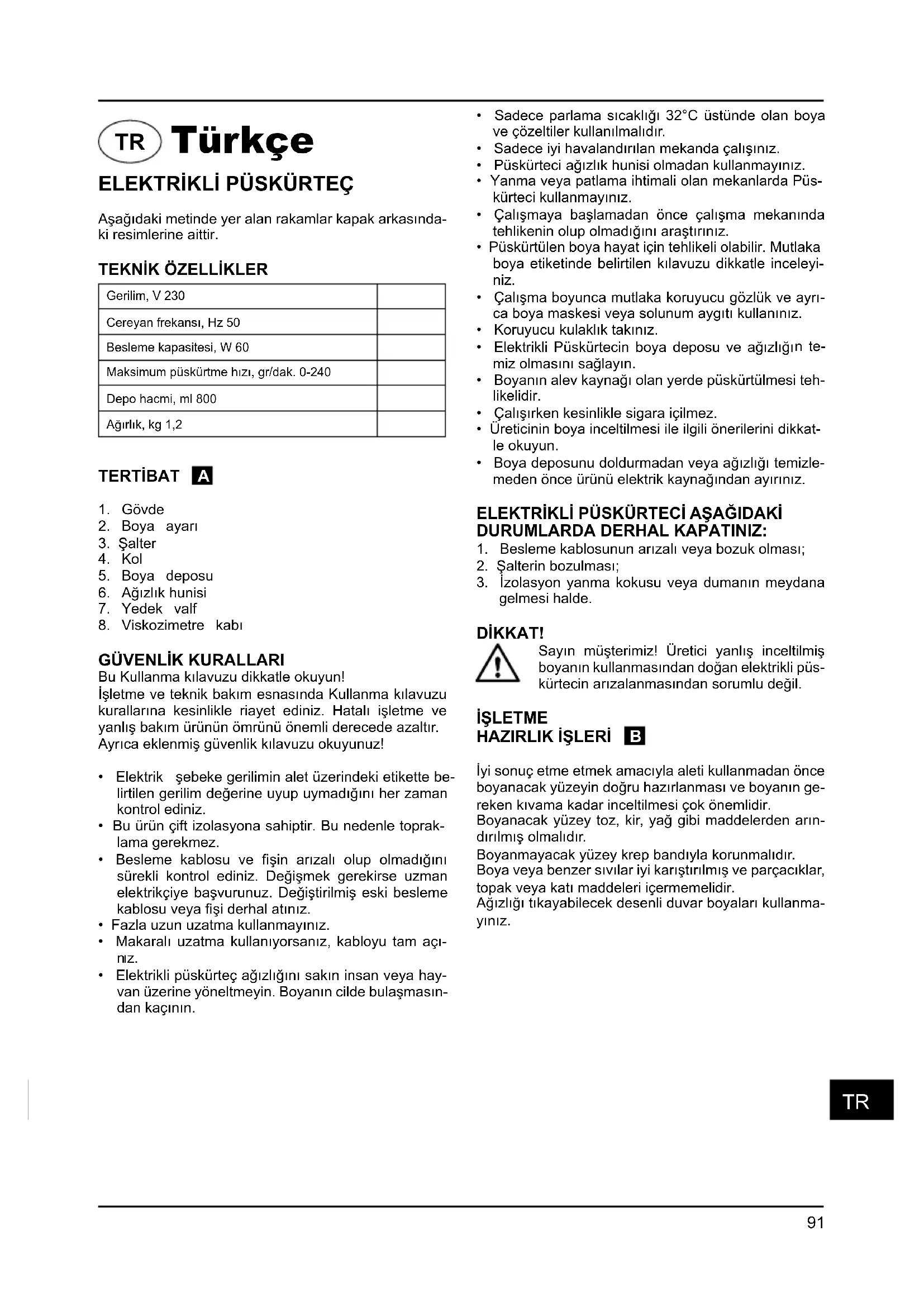 İyi sonuç etme etmek amacıyla aleti kullanmadan önce boyanacak yüzeyin doğru hazırlanması ve boyanın ge- reken kıvama kadar inceltilmesi çok önemlidir. Boyanacak yüzey toz, kir, yağ gibi maddelerden arın- dırılmış olmalıdır. Boyanmayacak yüzey krep bandıyla korunmalıdır. Boya veya benzer sıvılar iyi karıştırılmış ve parçacıklar, topak veya katı maddeleri içermemelidir. Ağızlığı tıkayabilecek desenli duvar boyaları kullanma- yınız. Türkçe TR92
