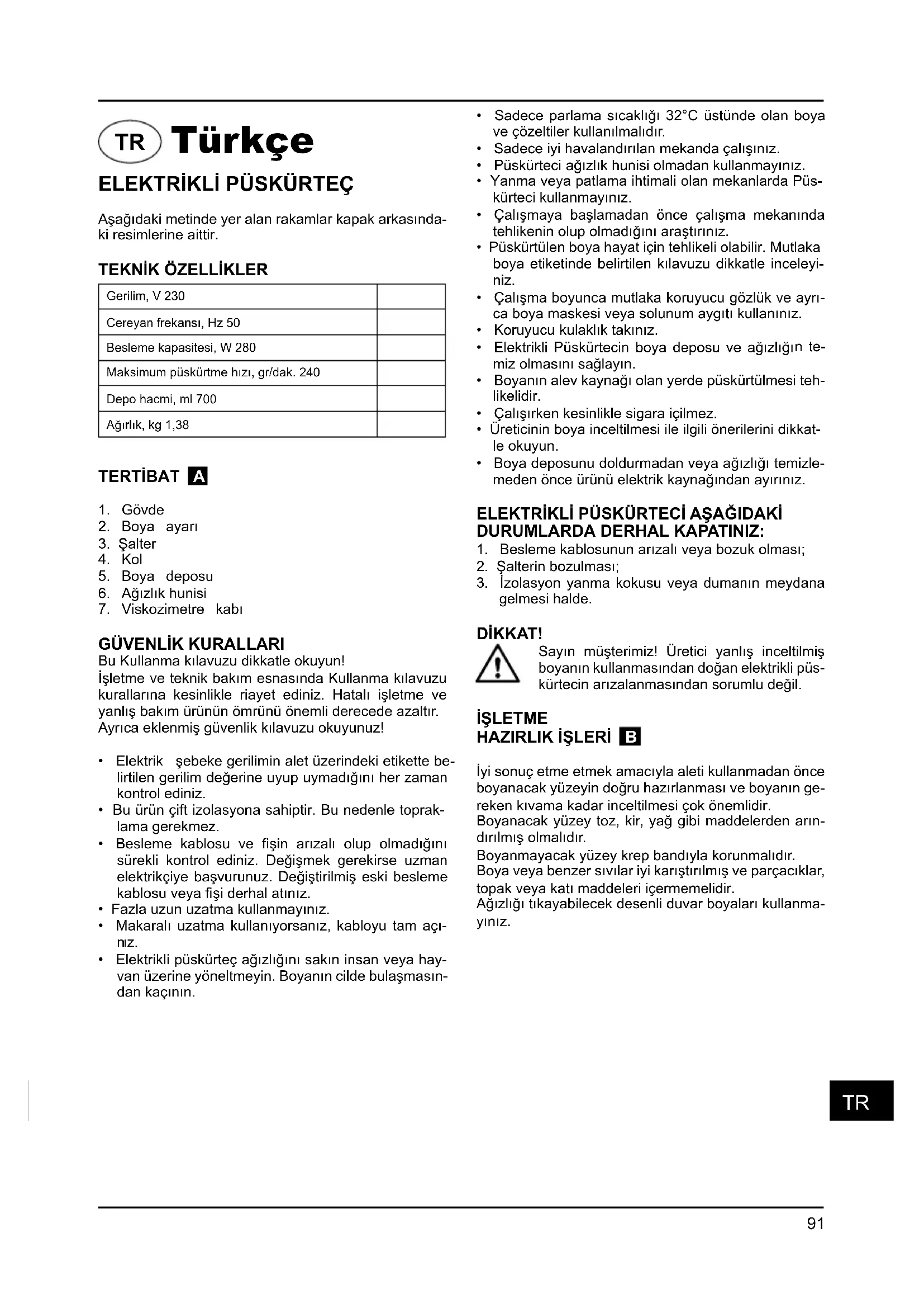 gelmesi halde. DİKKAT! Sayın müşterimiz! Üretici yanlış inceltilmiş boyanın kullanmasından doğan elektrikli püs- kürtecin arızalanmasından sorumlu değil. İŞLETME