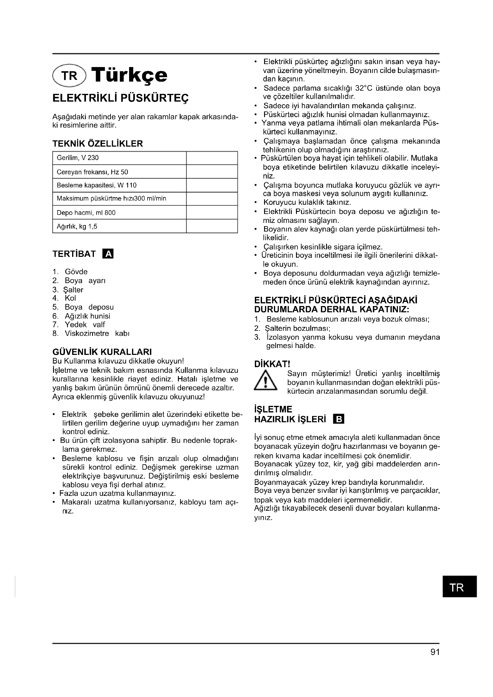 gelmesi halde. DİKKAT! Sayın müşterimiz! Üretici yanlış inceltilmiş boyanın kullanmasından doğan elektrikli püs- kürtecin arızalanmasından sorumlu değil. İŞLETME