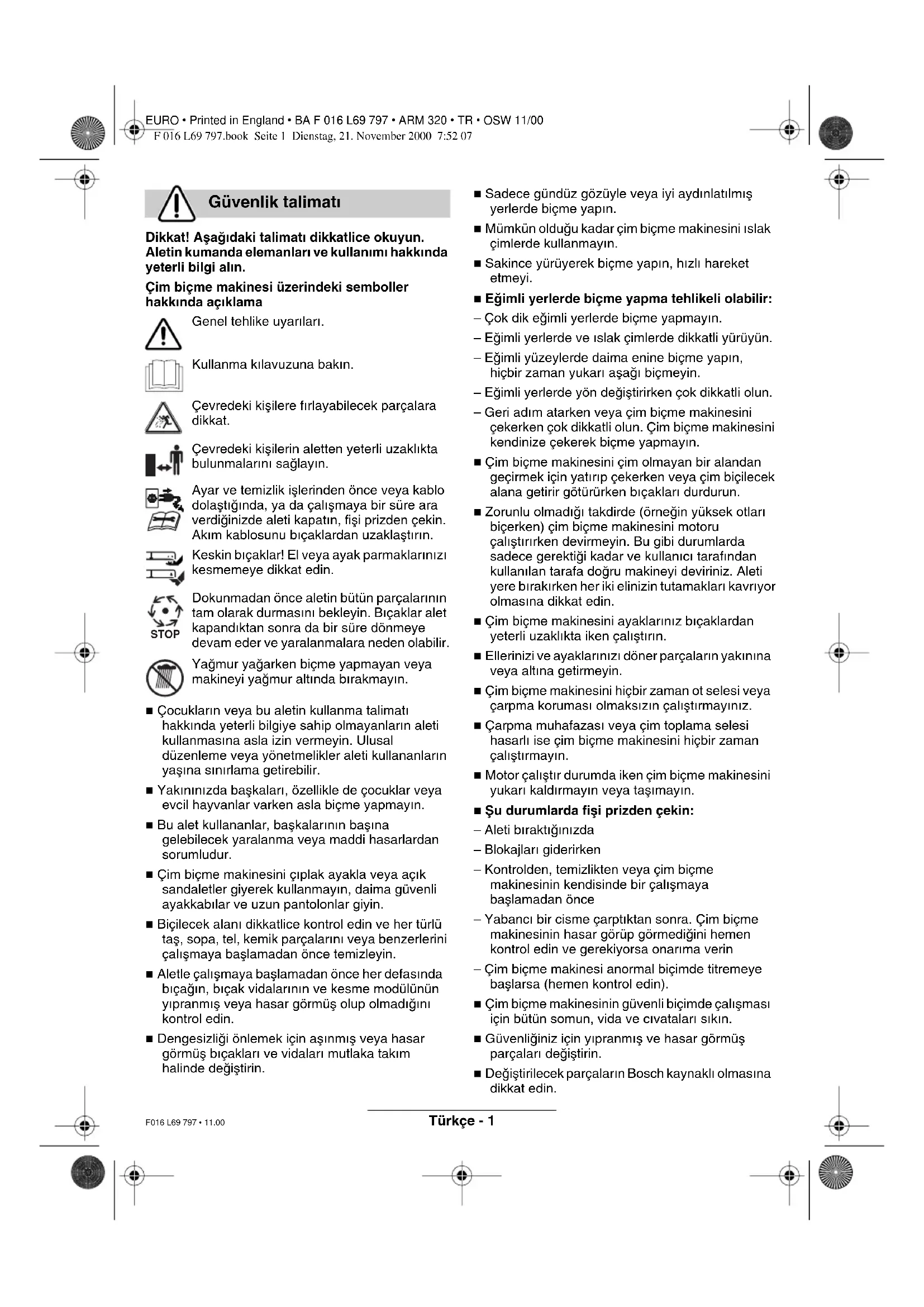 Τηρούµε το δικαίωµα αλλαγών Υπηρεσία εξυπηρέτησησ πελατών (Service) ∆ήλωση συµβατικτητασ Πιστοποιητικ θορύβων F 016 L69 797.book Seite 6 Dienstag, 21. November 2000 7:52 07EURO • Printed in England • BA F 016 L69 797 • ARM 320 • TR • OSW 11/00 Türkçe - 1 F016 L69 797 • 11.00 Dikkat! Aµaπ∂daki talimat∂ dikkatlice okuyun. Aletin kumanda elemanlar∂ ve kullan∂m∂ hakk∂nda yeterli bilgi al∂n. Çim biçme makinesi üzerindeki semboller hakk∂nda aç∂klama Genel tehlike uyar∂lar∂. Kullanma k∂lavuzuna bak∂n. Çevredeki kiµilere f∂rlayabilecek parçalara dikkat. Çevredeki kiµilerin aletten yeterli uzakl∂kta bulunmalar∂n∂ saπlay∂n. Ayar ve temizlik iµlerinden önce veya kablo dolaµt∂π∂nda, ya da çal∂µmaya bir süre ara verdiπinizde aleti kapat∂n, fiµi prizden çekin. Ak∂m kablosunu b∂çaklardan uzaklaµt∂r∂n. Keskin b∂çaklar! El veya ayak parmaklar∂n∂z∂ kesmemeye dikkat edin. Dokunmadan önce aletin bütün parçalar∂n∂n tam olarak durmas∂n∂ bekleyin. B∂çaklar alet kapand∂ktan sonra da bir süre dönmeye devam eder ve yaralanmalara neden olabilir. Yaπmur yaπarken biçme yapmayan veya makineyi yaπmur alt∂nda b∂rakmay∂n. ■ Çocuklar∂n veya bu aletin kullanma talimat∂ hakk∂nda yeterli bilgiye sahip olmayanlar∂n aleti kullanmas∂na asla izin vermeyin. Ulusal düzenleme veya yönetmelikler aleti kullananlar∂n yaµ∂na s∂n∂rlama getirebilir. ■ Yak∂n∂n∂zda baµkalar∂, özellikle de çocuklar veya evcil hayvanlar varken asla biçme yapmay∂n. ■ Bu alet kullananlar, baµkalar∂n∂n baµ∂na gelebilecek yaralanma veya maddi hasarlardan sorumludur. ■ Çim biçme makinesini ç∂plak ayakla veya aç∂k sandaletler giyerek kullanmay∂n, daima güvenli ayakkab∂lar ve uzun pantolonlar giyin. ■ Biçilecek alan∂ dikkatlice kontrol edin ve her türlü taµ, sopa, tel, kemik parçalar∂n∂ veya benzerlerini çal∂µmaya baµlamadan önce temizleyin. ■ Aletle çal∂µmaya baµlamadan önce her defas∂nda b∂çaπ∂n, b∂çak vidalar∂n∂n ve kesme modülünün y∂pranm∂µ veya hasar görmüµ olup olmad∂π∂n∂ kontrol edin. ■ Dengesizliπi önlemek için aµ∂nm∂µ veya hasar görmüµ b∂çaklar∂ ve vidalar∂ mutlaka tak∂m halinde deπiµtirin. ■ Sadece gündüz gözüyle veya iyi ayd∂nlat∂lm∂µ yerlerde biçme yap∂n. ■ Mümkün olduπu kadar çim biçme makinesini ∂slak çimlerde kullanmay∂n. ■ Sakince yürüyerek biçme yap∂n, h∂zl∂ hareket etmeyi. ■ Eπimli yerlerde biçme yapma tehlikeli olabilir: – Çok dik eπimli yerlerde biçme yapmay∂n. – Eπimli yerlerde ve ∂slak çimlerde dikkatli yürüyün. – Eπimli yüzeylerde daima enine biçme yap∂n, hiçbir zaman yukar∂ aµaπ∂ biçmeyin. – Eπimli yerlerde yön deπiµtirirken çok dikkatli olun. – Geri ad∂m atarken veya çim biçme makinesini çekerken çok dikkatli olun. Çim biçme makinesini kendinize çekerek biçme yapmay∂n. ■ Çim biçme makinesini çim olmayan bir alandan geçirmek için yat∂r∂p çekerken veya çim biçilecek alana getirir götürürken b∂çaklar∂ durdurun. ■ Zorunlu olmad∂π∂ takdirde (örneπin yüksek otlar∂ biçerken) çim biçme makinesini motoru çal∂µt∂r∂rken devirmeyin. Bu gibi durumlarda sadece gerektiπi kadar ve kullan∂c∂ taraf∂ndan kullan∂lan tarafa doπru makineyi deviriniz. Aleti yere b∂rak∂rken her iki elinizin tutamaklar∂ kavr∂yor olmas∂na dikkat edin. ■ Çim biçme makinesini ayaklar∂n∂z b∂çaklardan yeterli uzakl∂kta iken çal∂µt∂r∂n. ■ Ellerinizi ve ayaklar∂n∂z∂ döner parçalar∂n yak∂n∂na veya alt∂na getirmeyin. ■ Çim biçme makinesini hiçbir zaman ot selesi veya çarpma korumas∂ olmaks∂z∂n çal∂µt∂rmay∂n∂z. ■ Çarpma muhafazas∂ veya çim toplama selesi hasarl∂ ise çim biçme makinesini hiçbir zaman çal∂µt∂rmay∂n. ■ Motor çal∂µt∂r durumda iken çim biçme makinesini yukar∂ kald∂rmay∂n veya taµ∂may∂n. ■ Ωu durumlarda fiµi prizden çekin: – Aleti b∂rakt∂π∂n∂zda – Blokajlar∂ giderirken – Kontrolden, temizlikten veya çim biçme makinesinin kendisinde bir çal∂µmaya baµlamadan önce – Yabanc∂ bir cisme çarpt∂ktan sonra. Çim biçme makinesinin hasar görüp görmediπini hemen kontrol edin ve gerekiyorsa onar∂ma verin – Çim biçme makinesi anormal biçimde titremeye baµlarsa (hemen kontrol edin). ■ Çim biçme makinesinin güvenli biçimde çal∂µmas∂ için bütün somun, vida ve c∂vatalar∂ s∂k∂n. ■ Güvenliπiniz için y∂pranm∂µ ve hasar görmüµ parçalar∂ deπiµtirin. ■ Deπiµtirilecek parçalar∂n Bosch kaynakl∂ olmas∂na dikkat edin. Güvenlik talimat∂ STOP F 016 L69 797.book Seite 1 Dienstag, 21. November 2000 7:52 07Türkçe - 2 EURO • Printed in England • BA F 016 L69 797 • ARM 320 • TR • OSW 11/00 F016 L69 797 • 11.00 Sessiz çim biçme makinesi ARM 320 Sipariµ no. 0 600 899 0.. Giriµi gücü 950 W B∂çak geniµliπi 32 cm Kesme yüksekliπi 24 - 70 mm Çim biçme selesi kapasitesi 35 lt Aπ∂rl∂π∂ 12 kg Koruma s∂n∂f∂ / II Seri numaras∂ Aletteki verilere bak∂n Bu ürün çok düµük bir gürültü seviyesinde çal∂µ∂r; ülkenizde geçerli olan yönetmeliπe bak∂n∂z. Bu ürün evlerde ve özel alanlarda çim biçme için geliµtirilmiµtir. Bu el kitapç∂π∂, aletinizin doπru montaj∂ ve güvenli kullan∂m∂na iliµkin talimat∂ içerir. Bu talimat∂ dikkatlice okuman∂z çok önemlidir. Bu alet monte edilmiµ durumda yaklaµ∂k 12 kg'd∂r. Aleti ambalaj∂ndan ç∂karmak için gerektiπinde yard∂m isteyin. B∂çaklar keskin olduπundan aleti biçme yap∂lacak yere taµ∂rken dikkatli olun. Çim biçme makinesini ambalaj∂ndan dikkatle ç