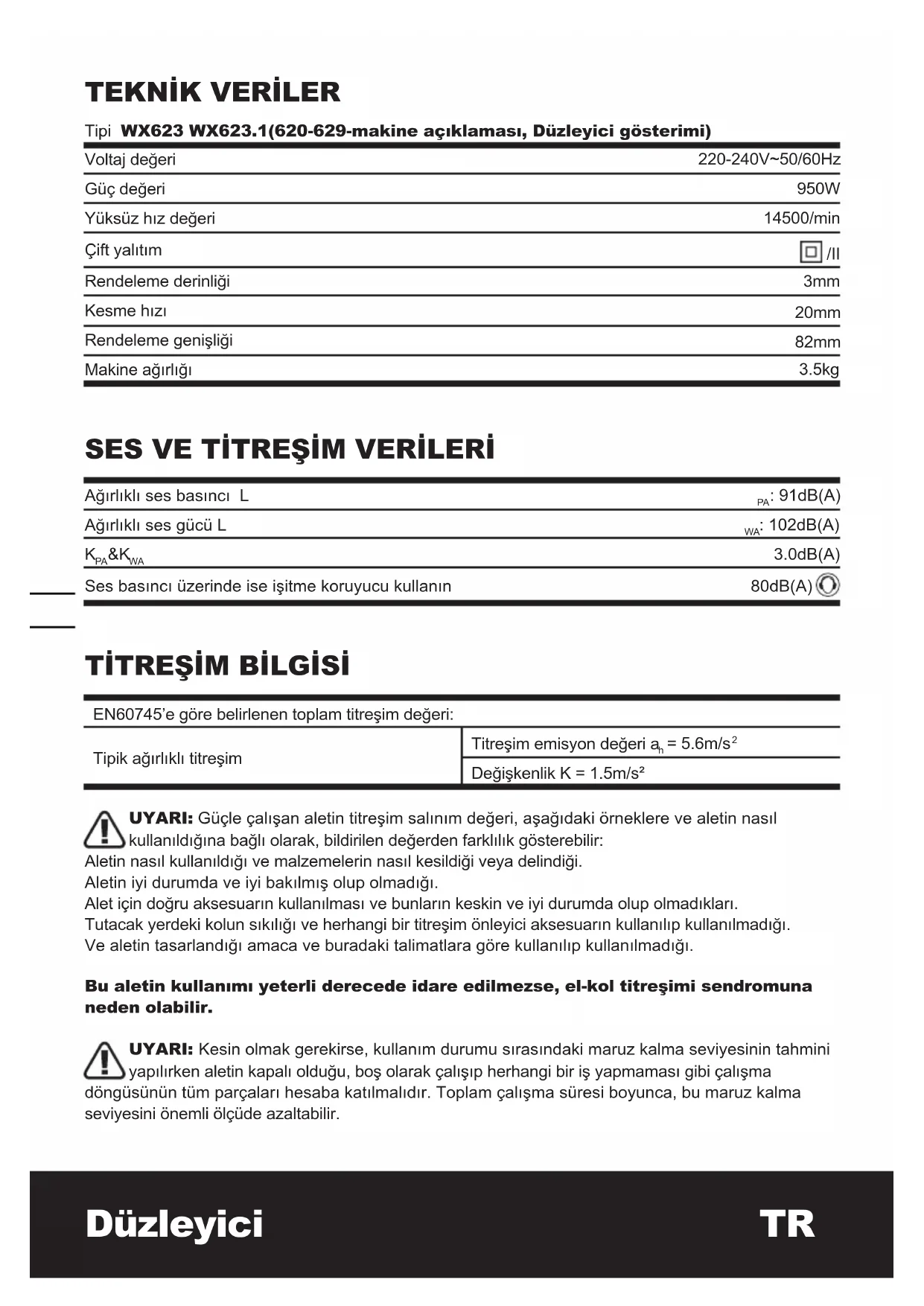 UYARI: Kesin olmak gerekirse, kullanim durumu sirasindaki maruz kalma seviyesinin tahmini yapilirken aletin kapali oldugu, boş olarak calisip herhangi bir ile yapmaması gibi calisma