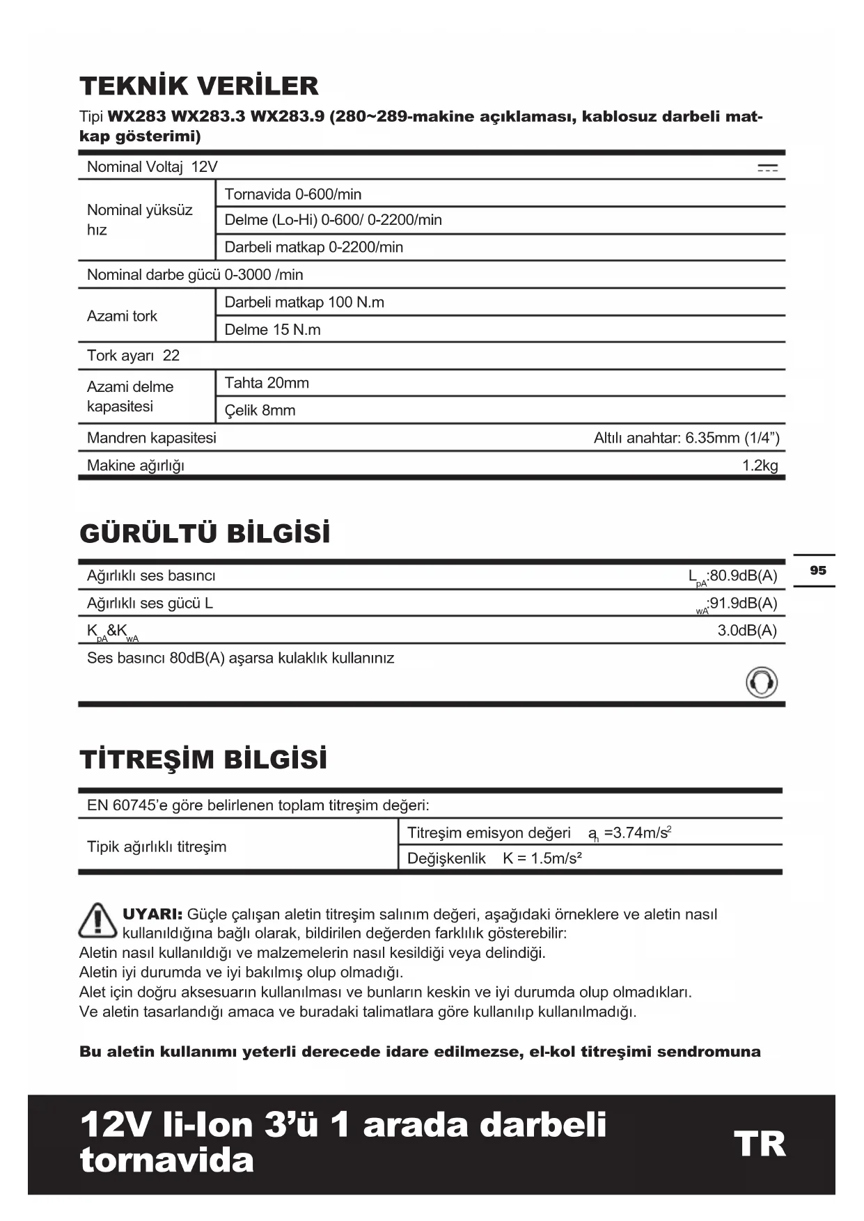 C ve altı ısılarda kullanmaktan kaçının. Herhangi bir titreşimli aletin kullanımını bir kaç güne dağıtmak için iş programınızı planlayın. AKSESUARLAR WX283 WX283.3 WX283.9