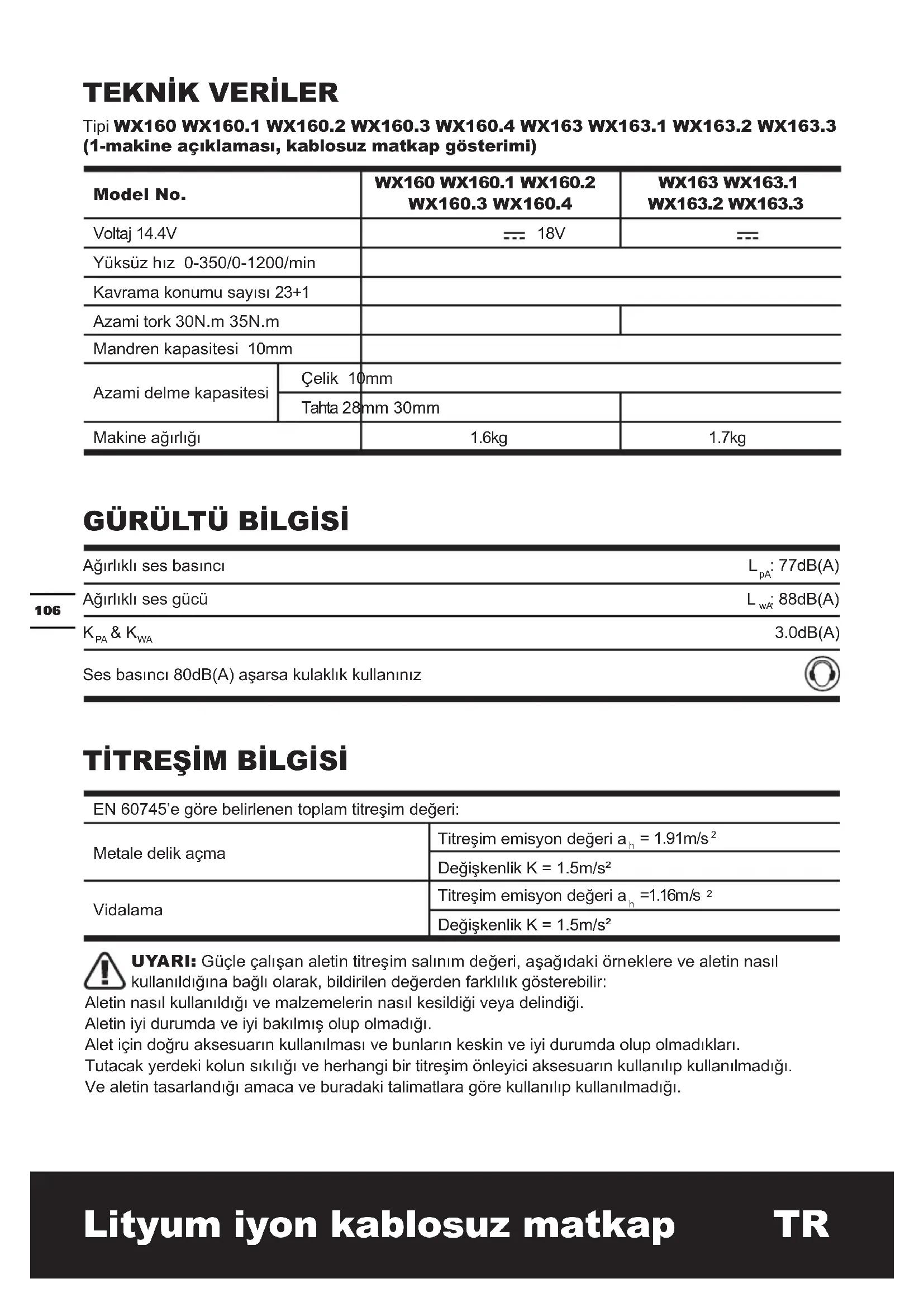 C ve altı ısılarda kullanmaktan kaçının. Herhangi bir titreşimli aletin kullanımını bir kaç güne dağıtmak için iş programınızı planlayın. WX160 WX160.1 WX160.2 WX160.3 WX160.4 1.3Ah Li-Ion pil paketi 1 (WA3515) 2 (WA3515) 1 (WA3515) 2 (WA3515) 2 (WA3515) Şarj Aleti 1 (WA3730) 1 (WA3730) 1 (WA3839) 1 (WA3839) 1 (WA3730) Çift uçlu uc